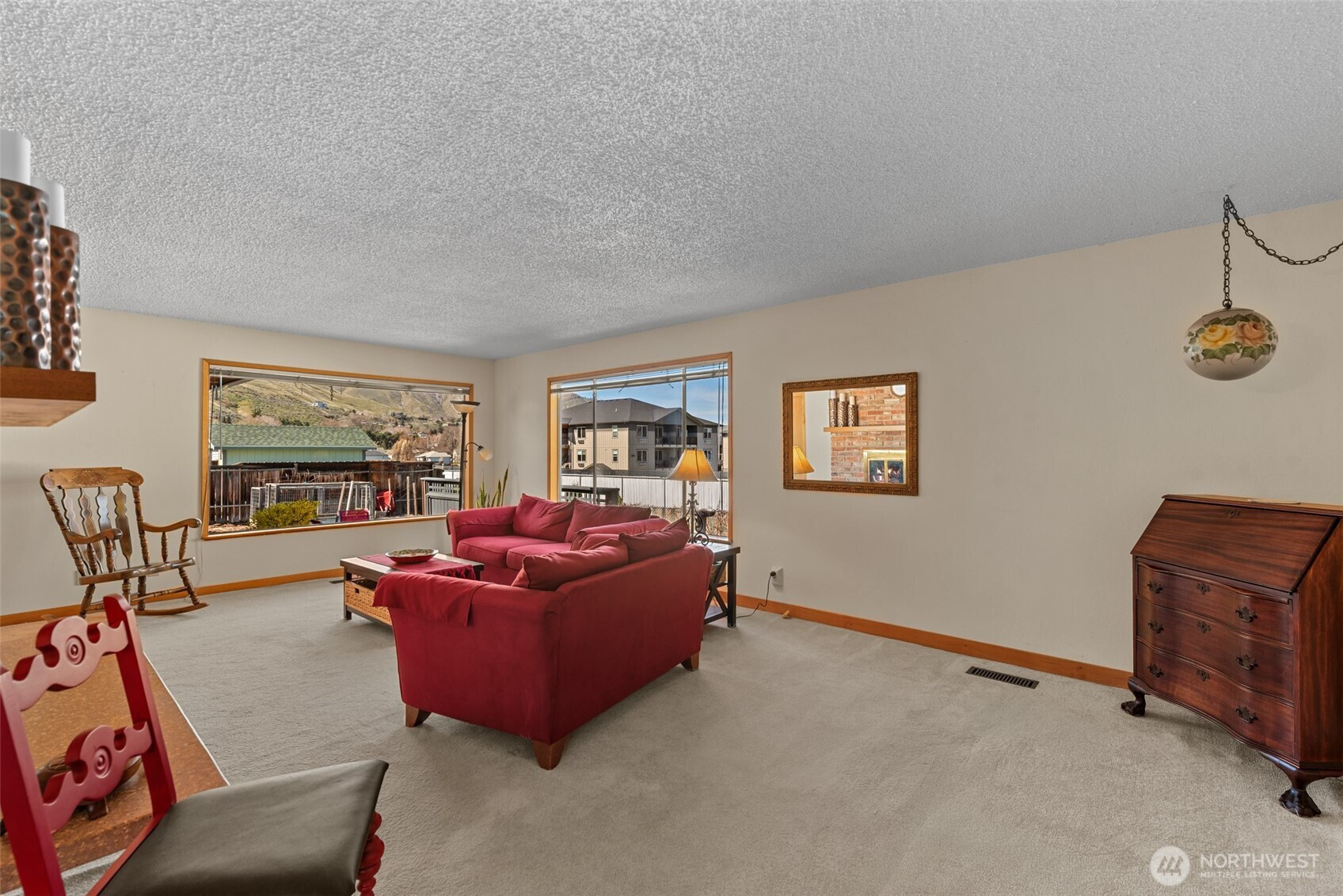 (650)533-3259Sweet mid century modern styling bright with lots of windows and big views to the south. Abutting canal local walking trail opens up the views! Large patio with screening fences and raised garden beds plus mature perennial butterfly garden. Custom kitchen with generous cabinets and spacious island bar; Corian counters and glassed cabineted coffee bar and extensive additional storage. Updated roof and heatpump. Primary bedroom with ensuite 3/4 bath. 3rd bedroom has built in library wall with room as a bedroom, too. Convenient location near Wenatchee High, Pioneer Jr. High and Confluence Health Hospital. Access to foothills walking trails close by.