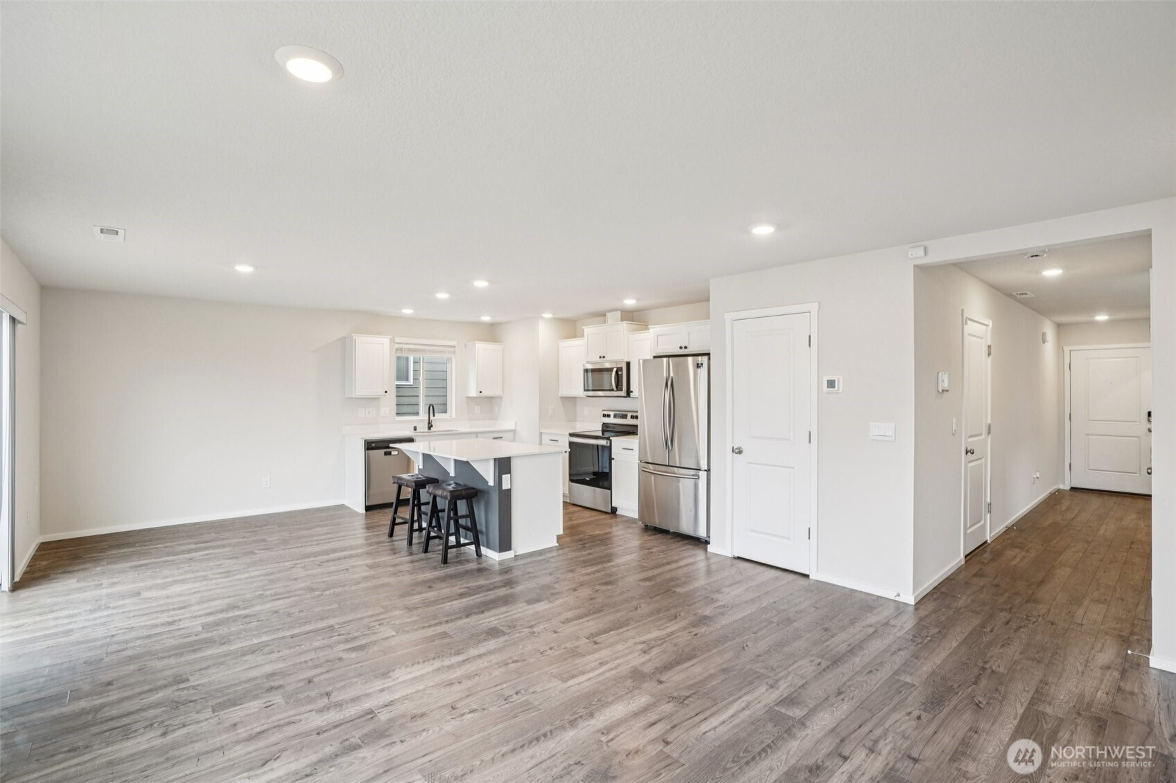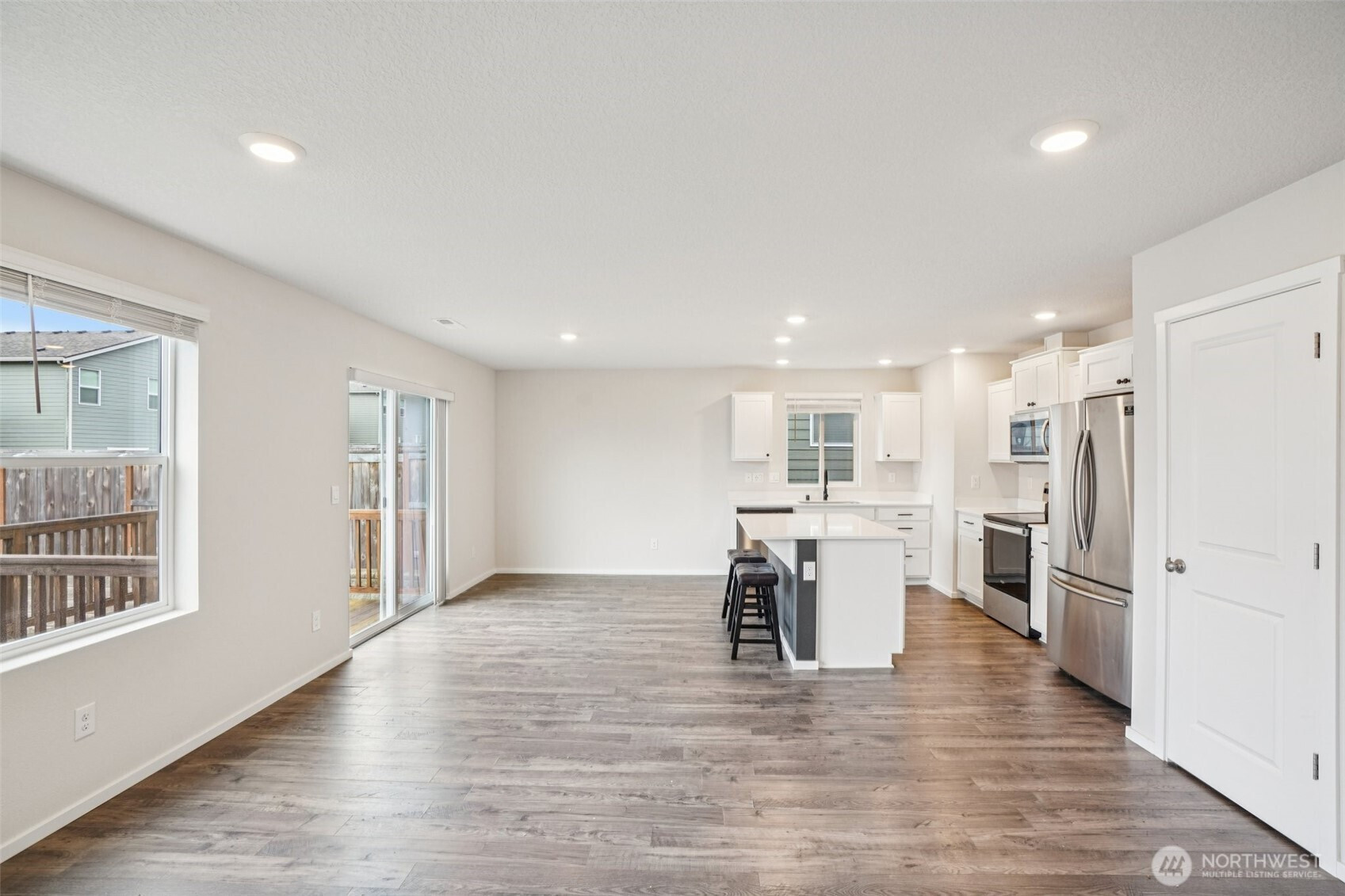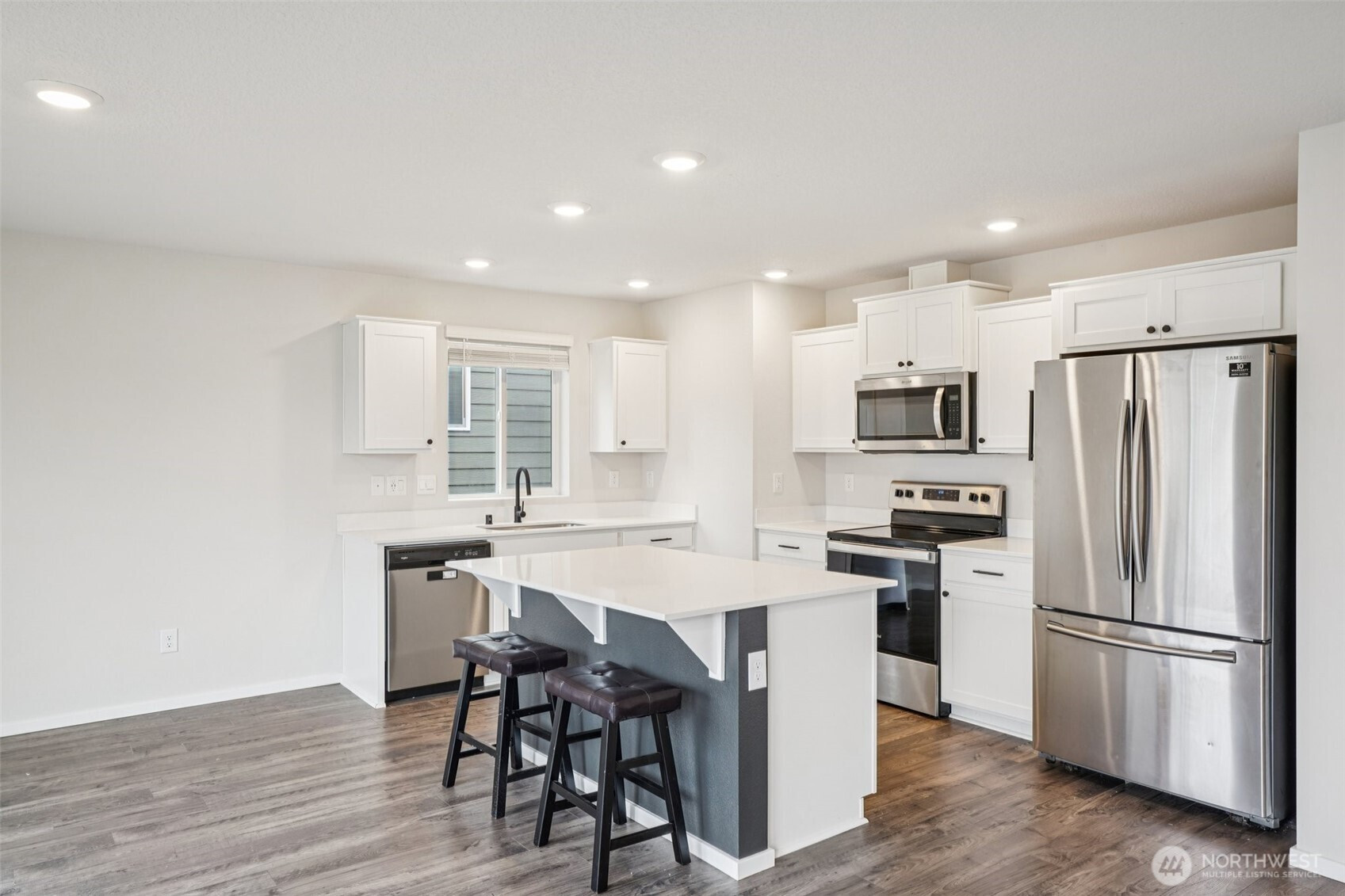 (650)533-3259Welcoming covered front porch with keyless entry leads into a bright great-room connecting the family room, dining area, and island kitchen. Family room with recessed lighting, while the kitchen features stainless Whirlpool appliances, a Samsung refrigerator, quartz counters, lots of cabinetry, walk-in pantry, and an island/eat bar. Slider from dining area opens to the back deck. Upstairs, primary en-suite offers a walk-in closet, and quartz vanity and shower. 3 additional bedrooms, full bath, laundry room with Samsung washer and dryer complete the upper level. Main-level powder room adds convenience. Home includes mixed flooring throughout, a 2-car garage, and fully landscaped corner lot with sprinklers. Mortgage savings may be available.