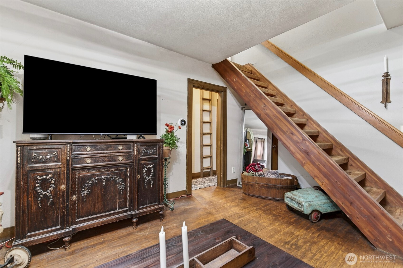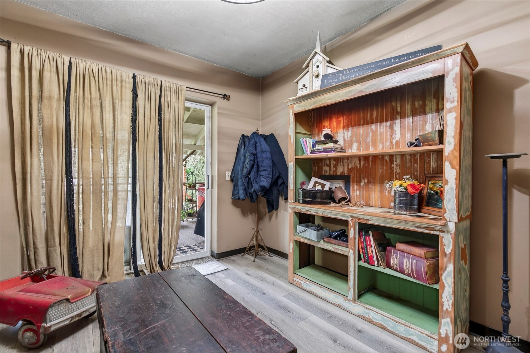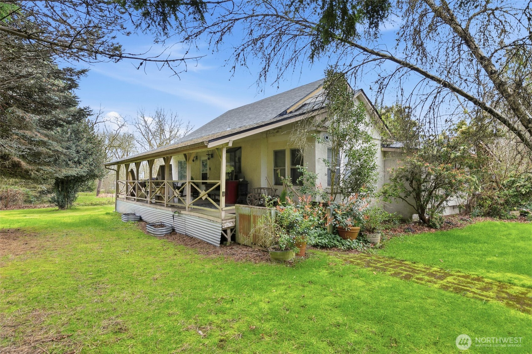 (650)533-3259This 100-year-old ranch-style home offers character, space, and practical updates. A large covered front porch welcomes you in and provides a great place to relax. Inside, you’ll find real hardwood floors, glass door knobs, and classic details throughout. The main level features a comfortable living room with window coverings, a dining area, and a functional kitchen with laminate countertops, stainless steel appliances, electric range, microwave, and LG dishwasher. Off the dining area is an additional bedroom and laundry space, along with a nearby family room that opens to the backyard through a sliding glass door, creating a flexible layout for everyday living. Upstairs includes two dormer-style bedrooms with hardwood flooring, blinds, and built-in closet spaces. The upper level also features a bathroom with a shower stall and a convenient coffee bar area. Major updates include a new roof and central heating and air conditioning system installed in 2025. The backyard offers space and versatility with multiple outbuildings, garden beds, fire pit area, and access from a rear road—ideal for adding a shop or additional entry