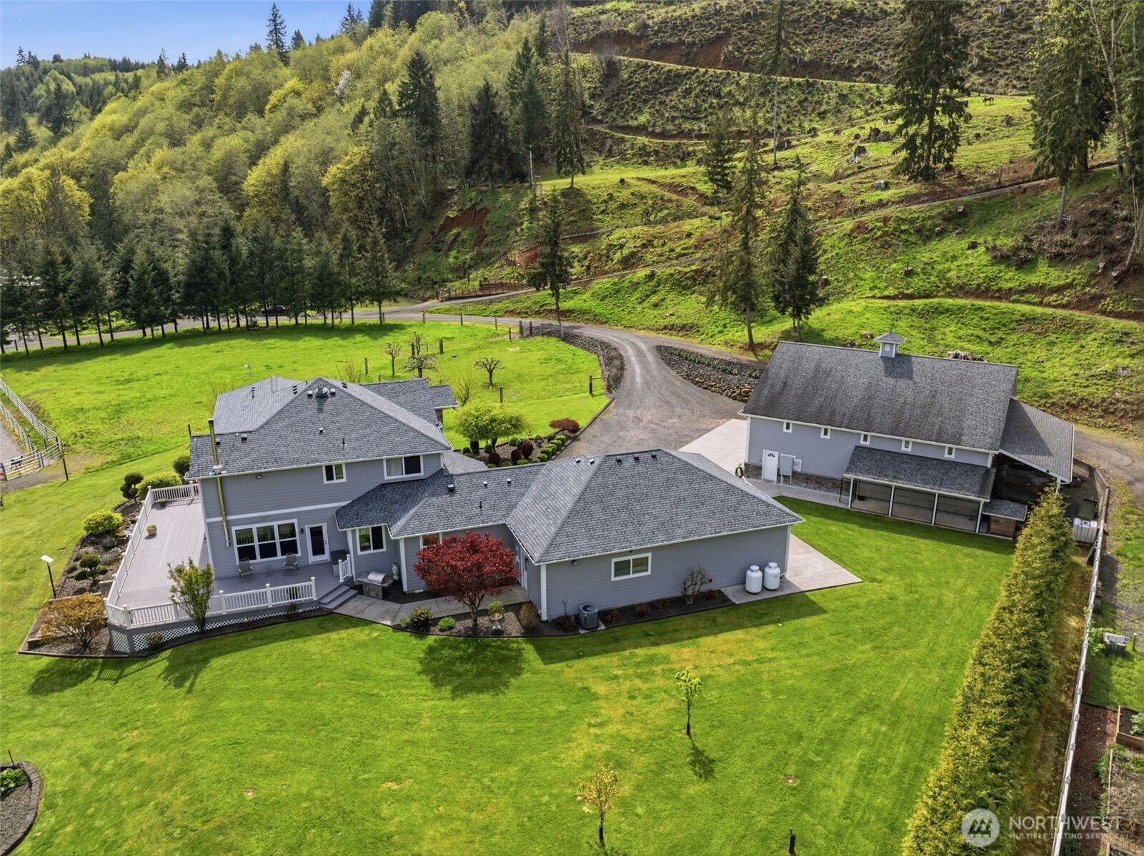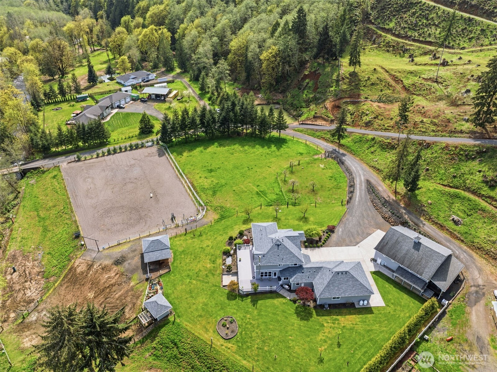 (650)533-3259Discover your dream equestrian retreat and fishing haven in Longview, Washington! This stunning five-bedroom, four-bathroom residence offers exquisite living space on a sprawling 10+ acre lot (two parcels) gracefully bordering Germany Creek. Experience an open-concept floor plan accented with modern finishes, Brazilian cherry flooring, and elegant granite countertops throughout. The gourmet kitchen features a large island, wine fridge, and energy-efficient appliances, making it ideal for culinary enthusiasts. Embrace outdoor living with a large horse arena and over-sized Timber Tech deck. Pamper your horses and livestock with a three-bay standing stall with a paddock, a second huge barn offering both cement and padded flooring with room for your horses, horse trailers or RV! Spoil your chickens and ducks in the amazing poultry house with both water and power! Tired of riding horses? Don't worry, there is still plenty to do like catch steelhead from Germany Creek or trout from a spring-fed pond stocked with fish or exploring the woods. Dirty from playing outside? Don't worry, the heated garage offers both hot and cold water in two locations and additional laundry hook-ups. There is no end to the outdoor fun here! Additional highlights include a dedicated home office, energy-efficient tankless water heater, and an extended three-car garage. Embrace the peaceful lifestyle and nearby trails that this exceptional Longview property offers. Make it yours today!