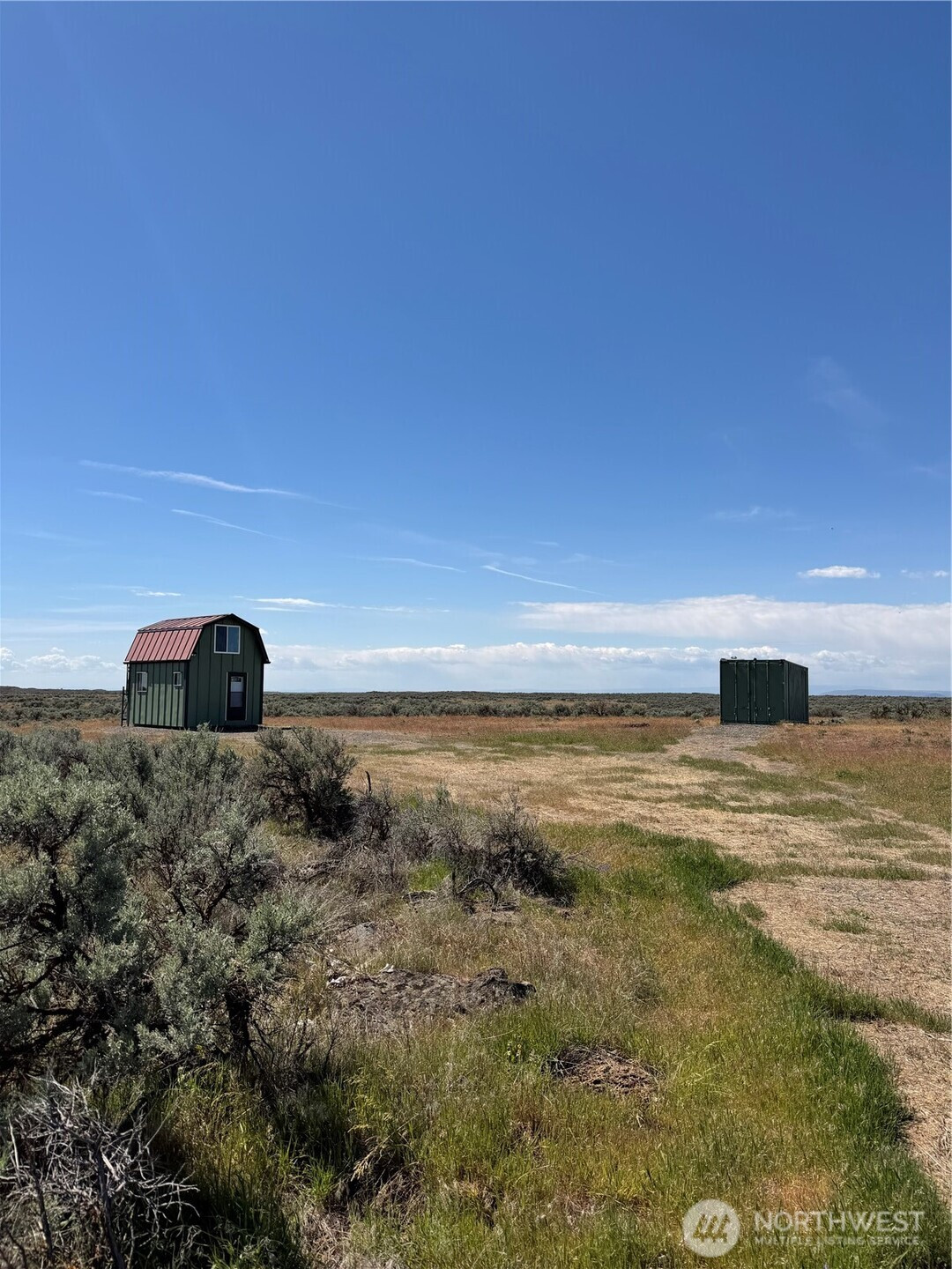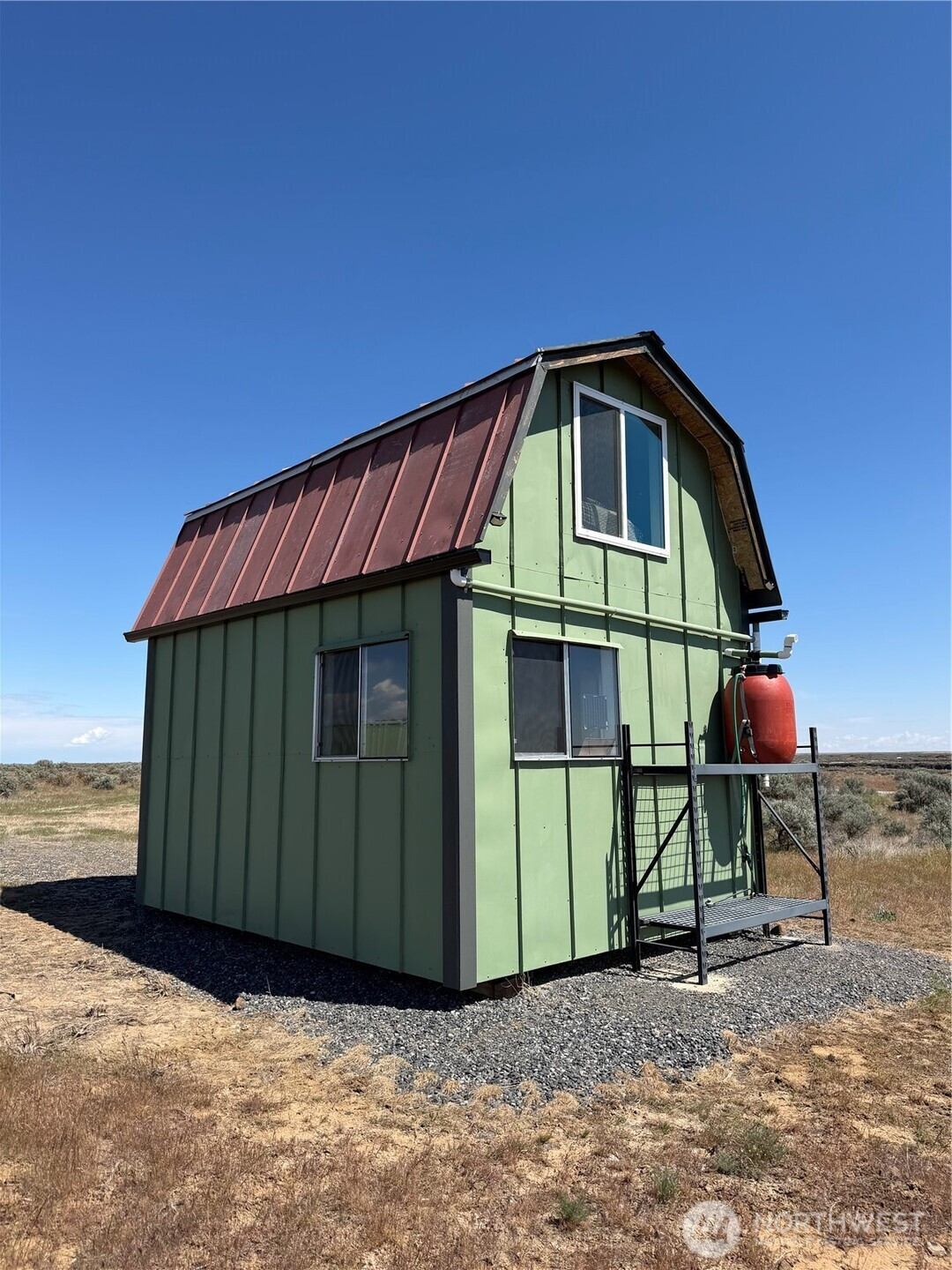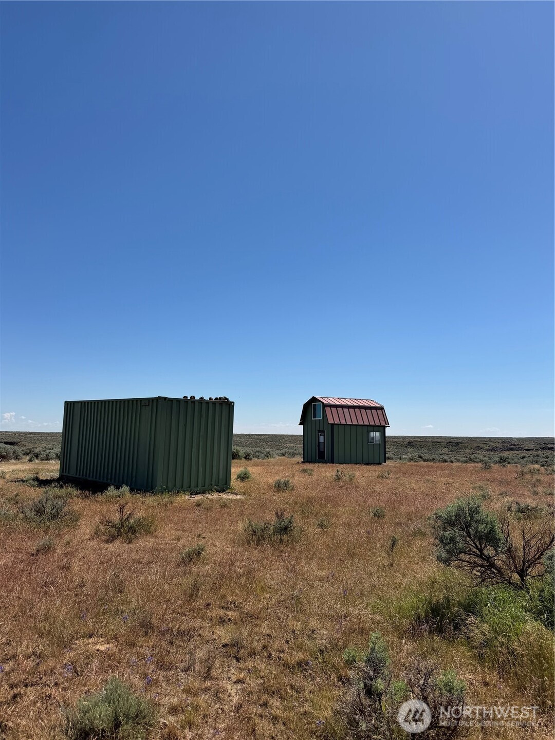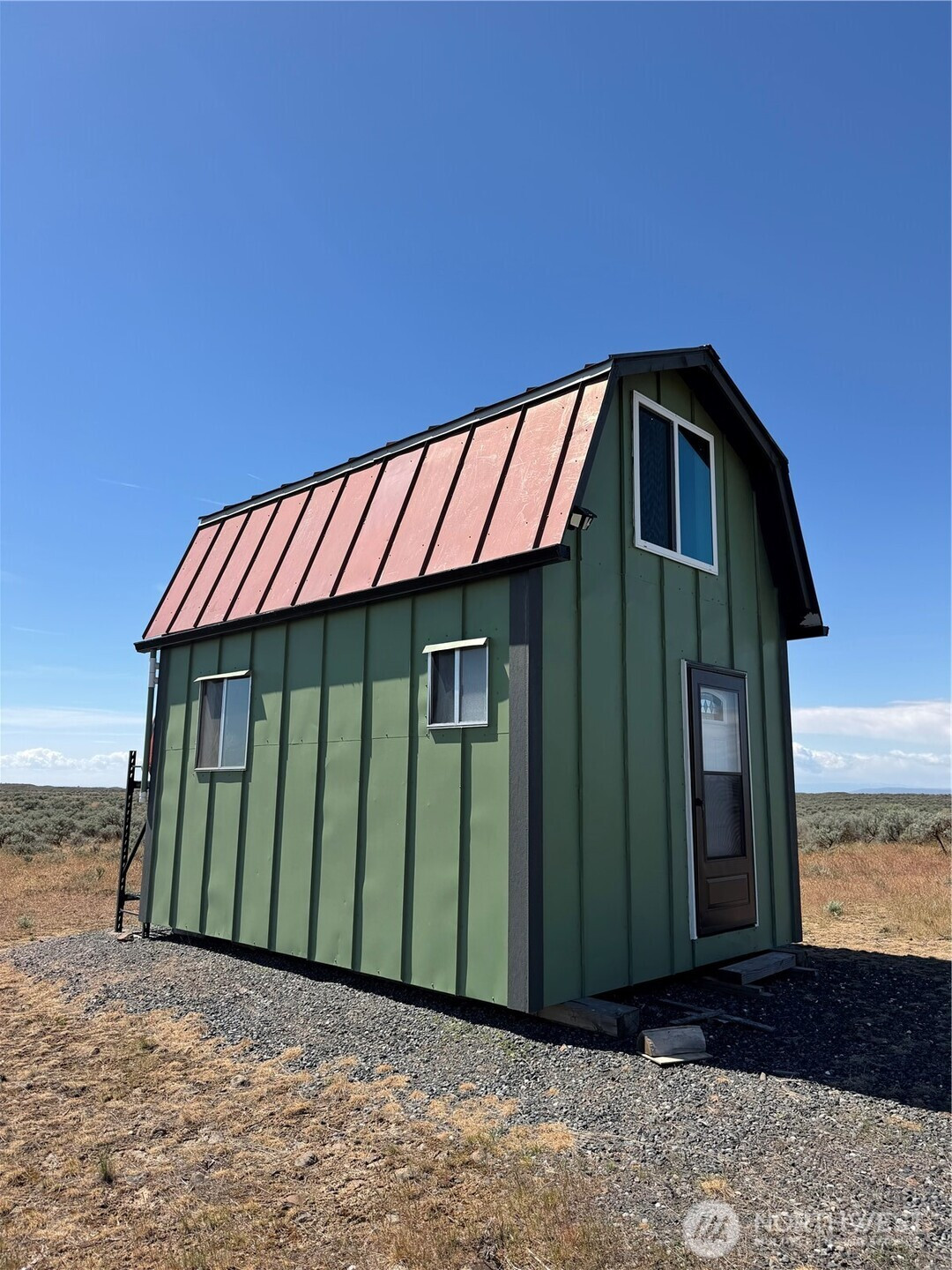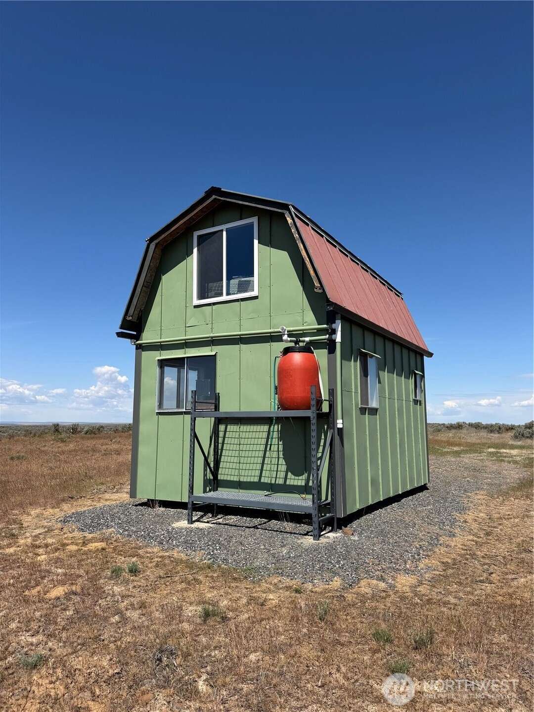 (650)533-3259Off-grid living on 40 private acres in Eagle Springs Ranch. This 12x16 cabin is thoughtfully set up with a 12-volt solar battery system, indoor lighting, rainwater catchment system plumbed to the kitchen and bathroom, and propane connections for heat and additional appliances. Interior features include vinyl plank flooring, reclaimed cedar walls, a functional kitchen with upper and lower cabinets, and a bathroom with a self-contained toilet. The loft offers space for up to three beds, complemented by tall ceilings and large upper windows that provide natural light, cross breeze, and expansive territorial views.The property includes a 20-foot shipping container for additional storage. Gated entry with a graveled driveway adds convenience and security. The land offers rolling terrain with valleys and hills, basalt column outcroppings, and abundant wildlife, including deer. Borders 640 acres of Washington State DNR land, providing extended privacy and recreational opportunities. Private roads maintained by the POA.