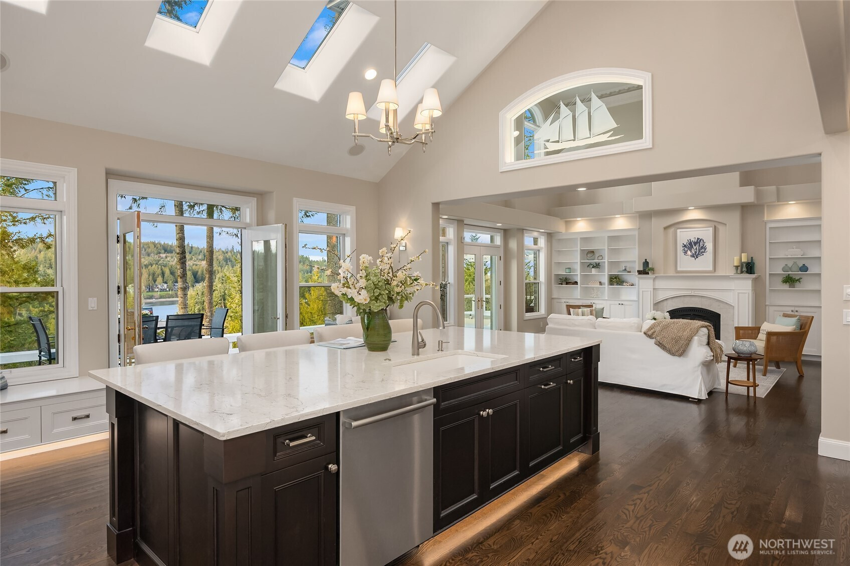 (650)533-3259A stately French Country Manor perched atop a solid basalt rock knoll overlooking Port Ludlow’s Inner Harbor, the Twin Islands and Mt. Baker. Beyond London-style iron dual gates, the approach unfolds past triple cascading waterfalls, culminating at this 1-acre retreat perched high above the harbor with exceptional privacy. Recently remodeled, the home blends timeless European architecture with thoughtful modern updates. Soaring 20' ceilings, custom cast plaster crown moldings with concealed uplighting, and expansive picture windows frame sweeping water and garden views, filling every room with natural light, privacy and beautiful outlooks. The Hampton-inspired chef’s kitchen is anchored by a 12' quartz island, 48” Wolf range, 48” Sub-Zero and walk-in pantry, with skylit ceilings and French doors opening to an expansive view deck and hot tub. The main-level primary suite features coffered ceilings, deck access and a luxurious 6-piece bath with heated floors and soaking tub. Upstairs offers three additional bedrooms, including 2 beautifully remodeled ensuites. Bay Club membership provides indoor pool, fitness center, wood shop, theater and year-round social events. Minutes away: championship golf, tennis and pickleball, a marina with seaplane access, 26 miles of trails, kayaking and dining at the historic Port Ludlow Inn. Port Ludlow is one of the Northwest's hidden waterfront enclaves, offering resort-style living where recreation, nature and community shape everyday life.