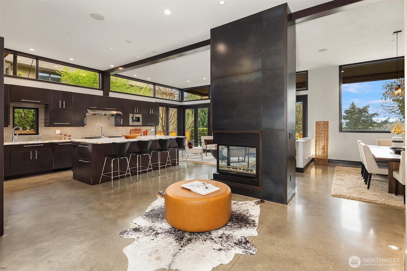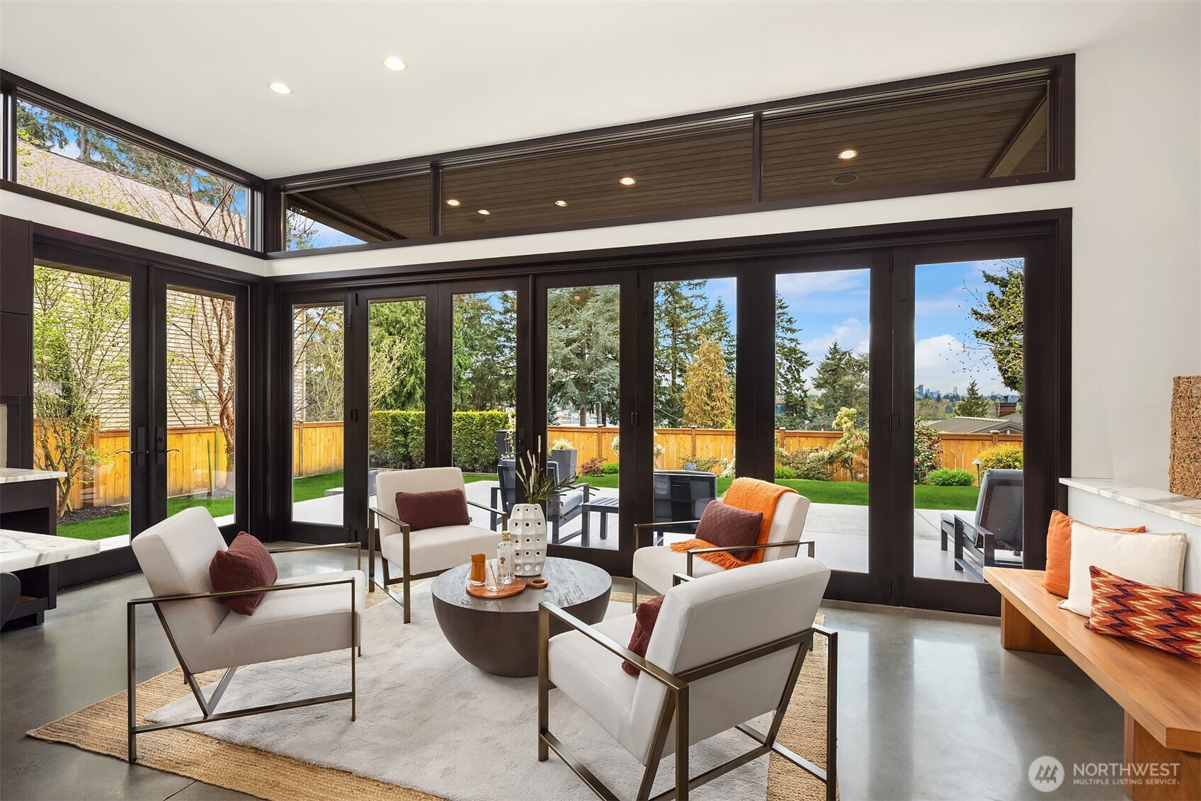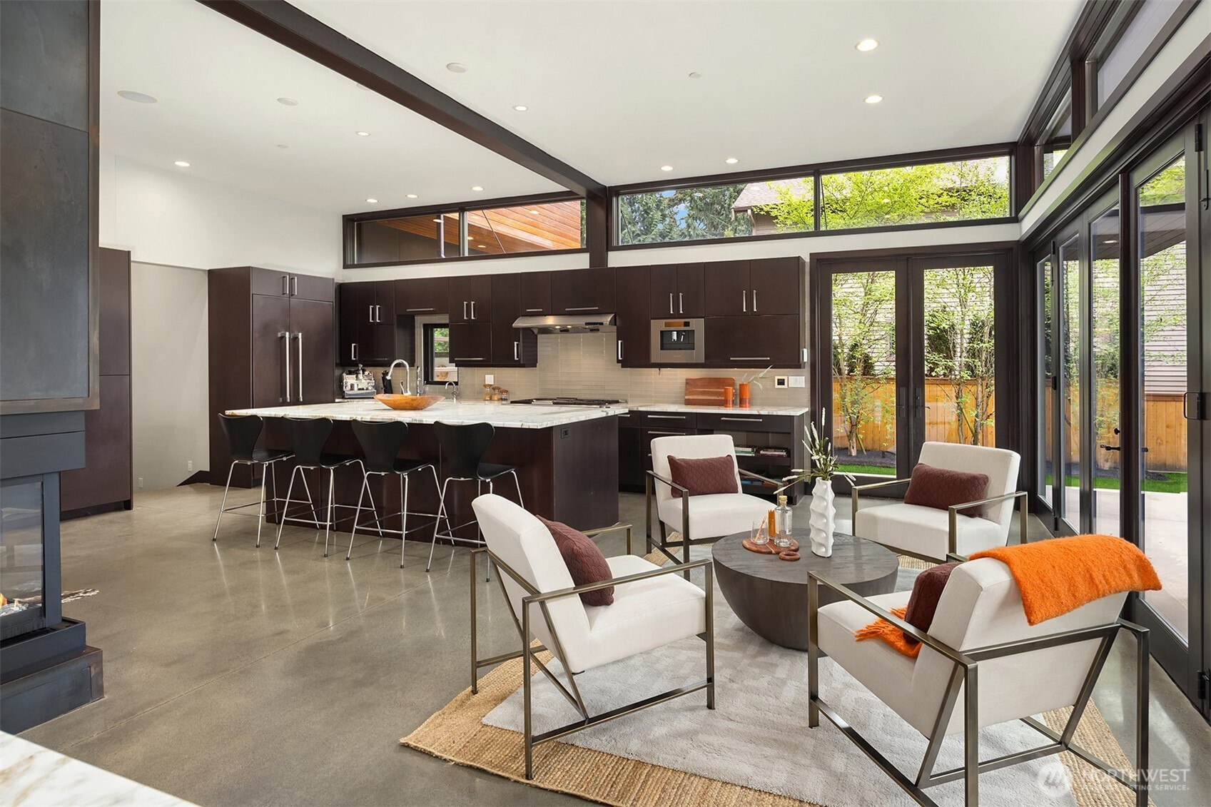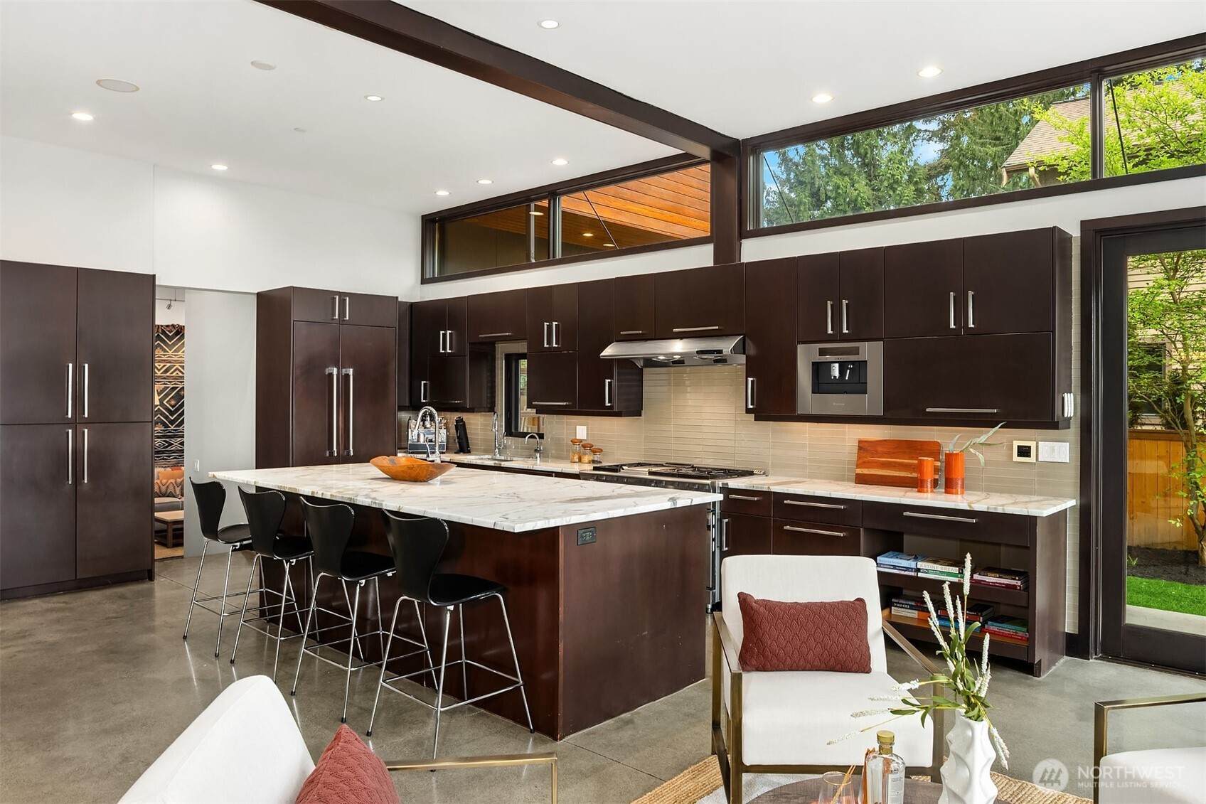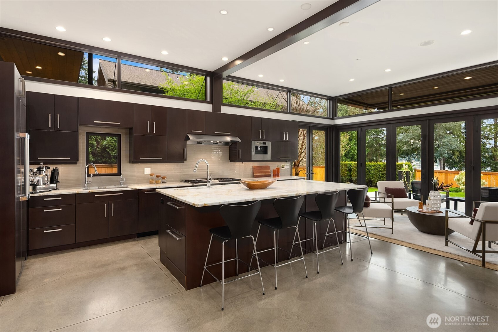 (650)533-3259West Bellevue Retreat // Ideally positioned in the heart of West Bellevue, this residence offers a rare combination of privacy, proximity, and protected west-facing views within one of the Eastside’s most sought-after neighborhoods. Set along a quiet, tree-lined street, the home is thoughtfully sited to capture natural light while maintaining a sense of seclusion. Interiors are defined by a clean, functional layout with refined, contemporary finishes throughout. Concrete flooring anchors the main level, complemented by vaulted ceilings and a neutral palette that feels both current and enduring. The kitchen is well-appointed with stone slab countertops, stainless steel appliances, and custom cabinetry, designed to integrate seamlessly with adjacent living and dining spaces. The main level flows effortlessly from formal to informal areas, with connected living spaces that open to the outdoors—creating an easy rhythm for both daily living and entertaining. Floor-to-ceiling glass frames surrounding greenery, bringing warmth and softness into the home throughout the day. The bedroom configuration offers flexibility, with a primary suite positioned for privacy and comfort, complemented by a private office suite well-suited for today’s work-from-home needs. Outdoors, the property presents a natural extension of the home, with usable yard space and mature landscaping that enhances both privacy and livability.