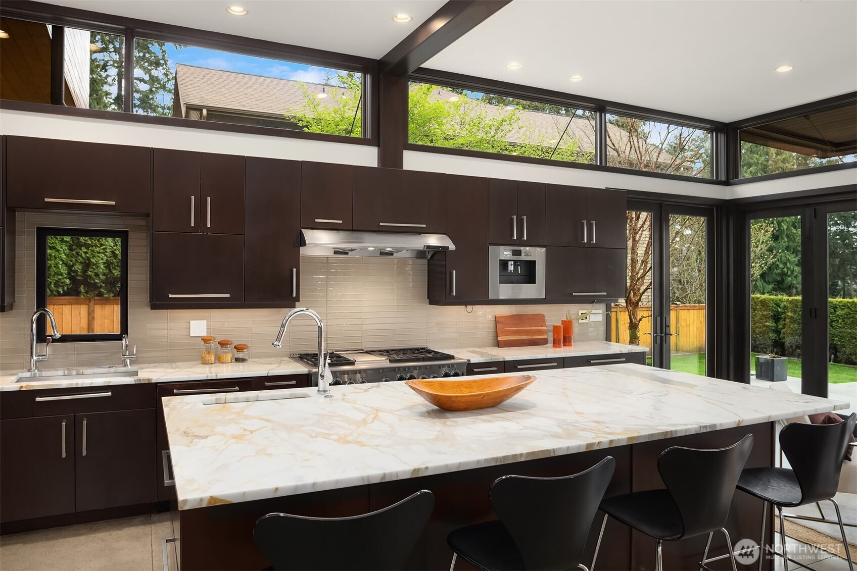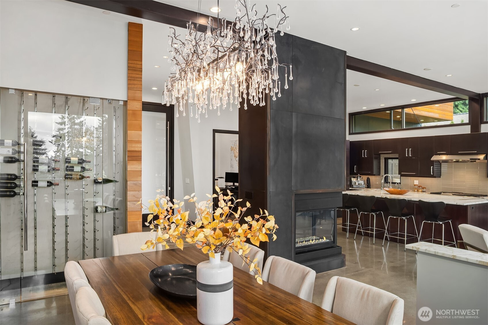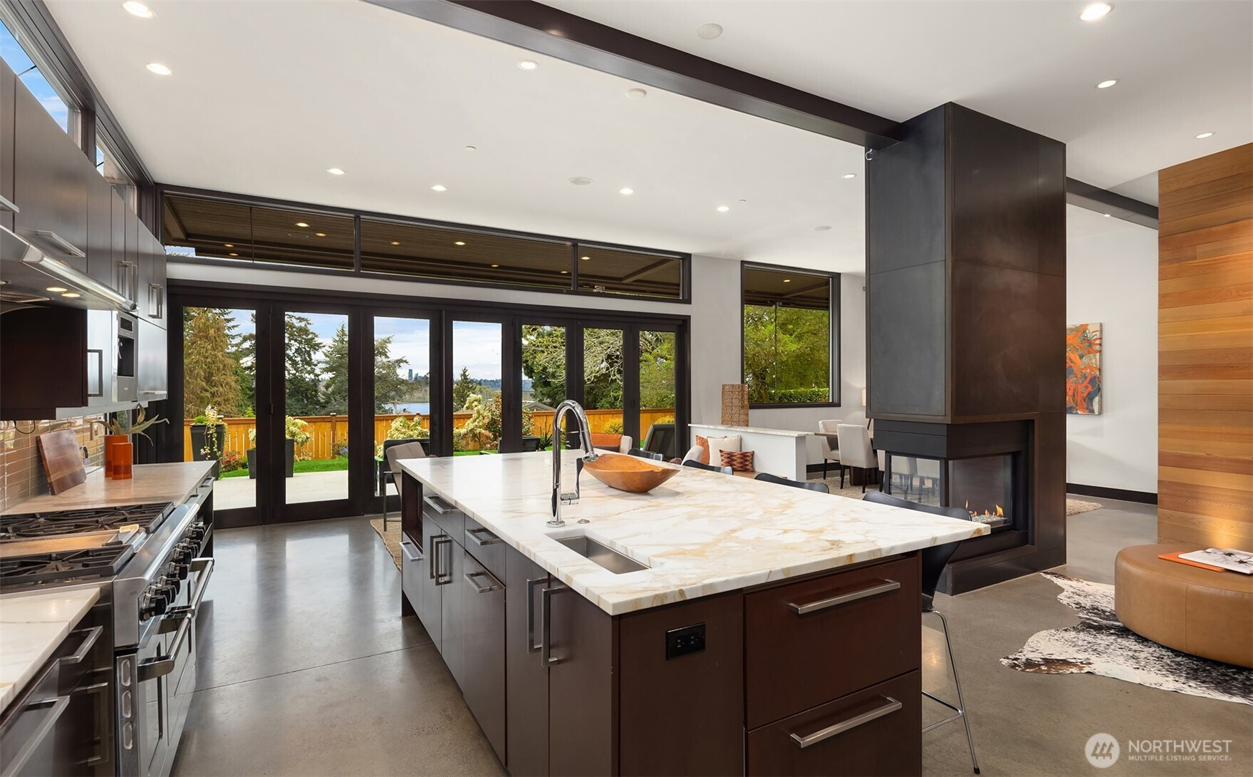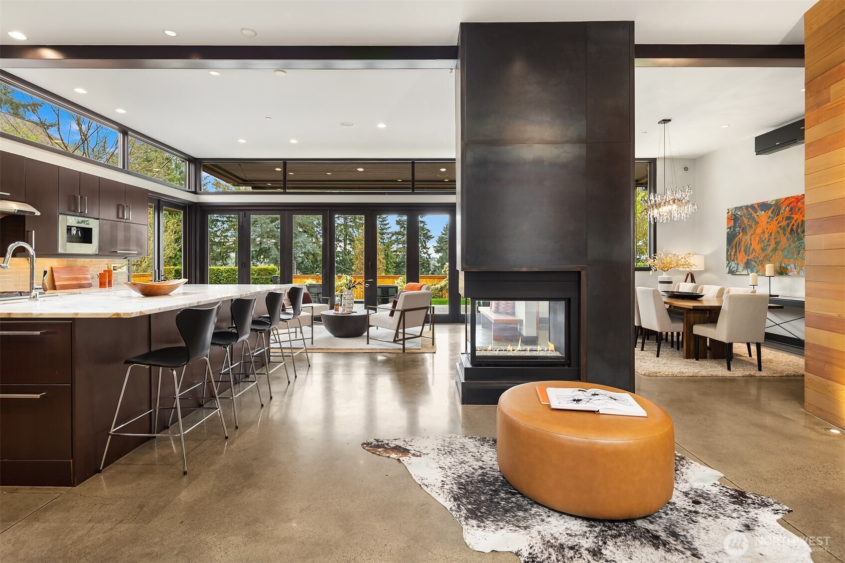 (650)533-3259West Bellevue Retreat // Ideally positioned in the heart of West Bellevue, this residence offers a rare combination of privacy, proximity, and protected west-facing views within one of the Eastside’s most sought-after neighborhoods. Set along a quiet, tree-lined street, the home is thoughtfully sited to capture natural light while maintaining a sense of seclusion. Interiors are defined by a clean, functional layout with refined, contemporary finishes throughout. Concrete flooring anchors the main level, complemented by vaulted ceilings and a neutral palette that feels both current and enduring. The kitchen is well-appointed with stone slab countertops, stainless steel appliances, and custom cabinetry, designed to integrate seamlessly with adjacent living and dining spaces. The main level flows effortlessly from formal to informal areas, with connected living spaces that open to the outdoors—creating an easy rhythm for both daily living and entertaining. Floor-to-ceiling glass frames surrounding greenery, bringing warmth and softness into the home throughout the day. The bedroom configuration offers flexibility, with a primary suite positioned for privacy and comfort, complemented by a private office suite well-suited for today’s work-from-home needs. Outdoors, the property presents a natural extension of the home, with usable yard space and mature landscaping that enhances both privacy and livability.