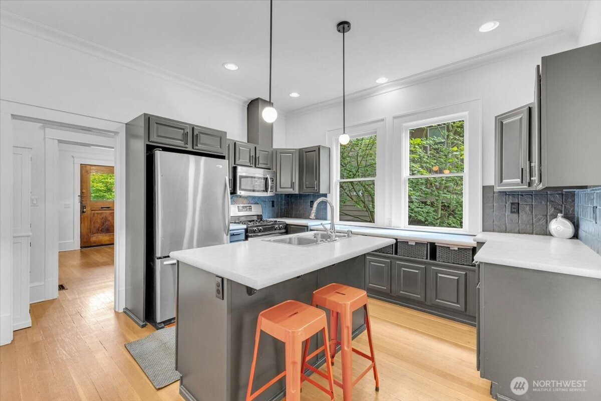 (650)533-3259This updated American Foursquare merges Craftsman charm with modern upgrades. Three floors feature high ceilings and large windows for a bright, airy feel. Recent improvements include a new foundation, updated plumbing/electrical, and Nest-zoned climate control with central A/C. A private, soundproofed mother-in-law suite is perfect for guests or rental income. Enjoy front-facing bedrooms with acoustic windows, tandem parking for two, an updated kitchen, and a rare main-floor bathroom. Located one block from light rail and a year-round farmers’ market in Capitol Hill. Architect-owned, timeless, and move-in ready. MR (M1) zoning. Neighboring property, 115 11th Ave E (MLS #2426647) for sale. Significant development value if purchased together