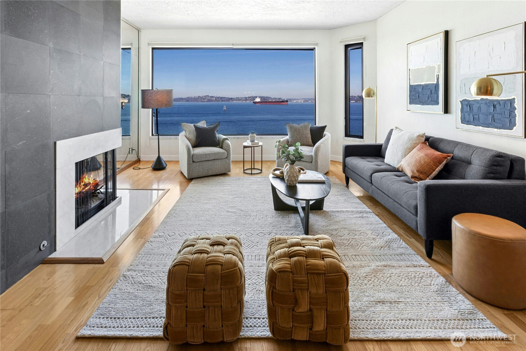 (650)533-3259Wake up to breathtaking, panoramic views that redefine waterfront living. This exceptional residence offers extraordinary vistas of Puget Sound, where you can watch ferries glide gracefully from downtown Seattle to Bainbridge Island creating constantly changing seascapes. Beyond the sparkling water, the majestic Olympic Mountains rise in the distance, delivering unforgettable sunsets and a dramatic backdrop in every season. This corner penthouse offers an exceptional blend of space, privacy, and Northwest charm. The open kitchen and family room features peninsula seating, a cozy fireplace and private balcony, creating a warm, inviting setting for everyday living and relaxed entertaining. An oversized living and dining room—also anchored by a fireplace—provides an elegant backdrop for gatherings. The primary suite serves as a tranquil retreat, with its own balcony overlooking the peaceful, forested hillside behind the building—an ideal counterpoint to the vibrant energy of the nearby Alki Trail. Thoughtfully designed with a .75 bath and abundant hanging and storage space, it combines comfort with functionality. Two additional bedrooms and a full bath offer flexibility for guests, office space, or hobbies. A dedicated washer and dryer room, a large hall closet, and an extended gallery-style hallway to display artwork complete this distinctive and beautifully balanced home. Your indoor parking space is situated next to your storage room and your second space is in the rear.