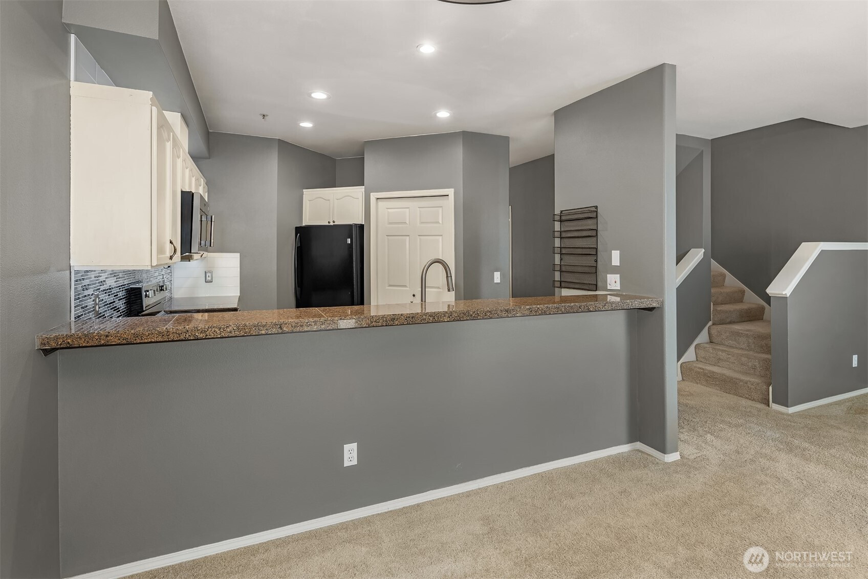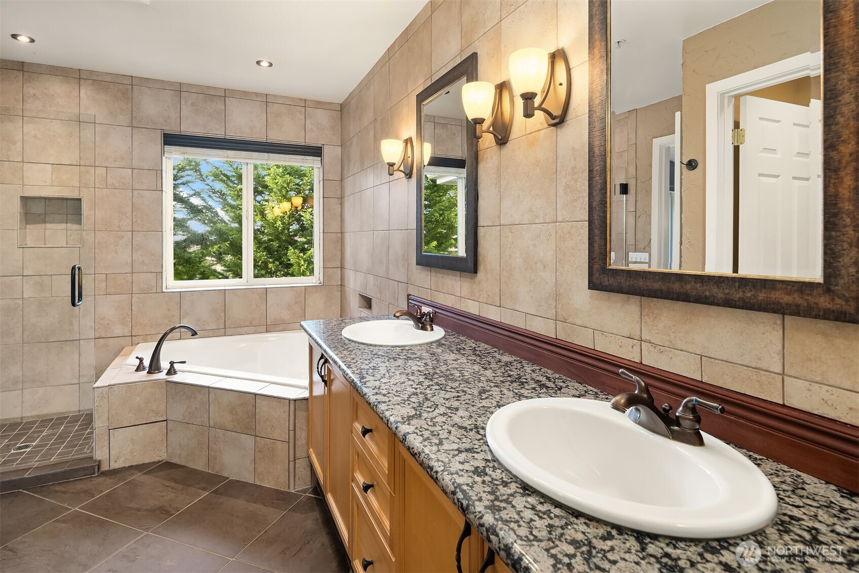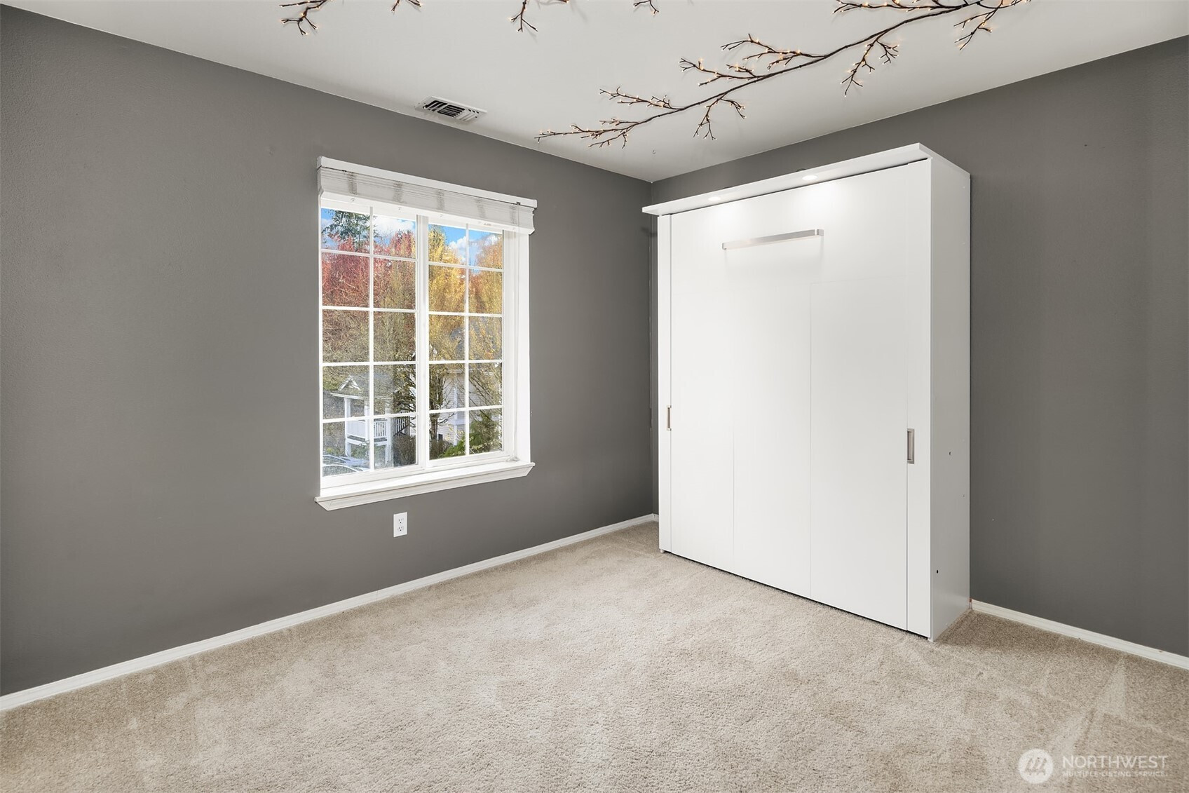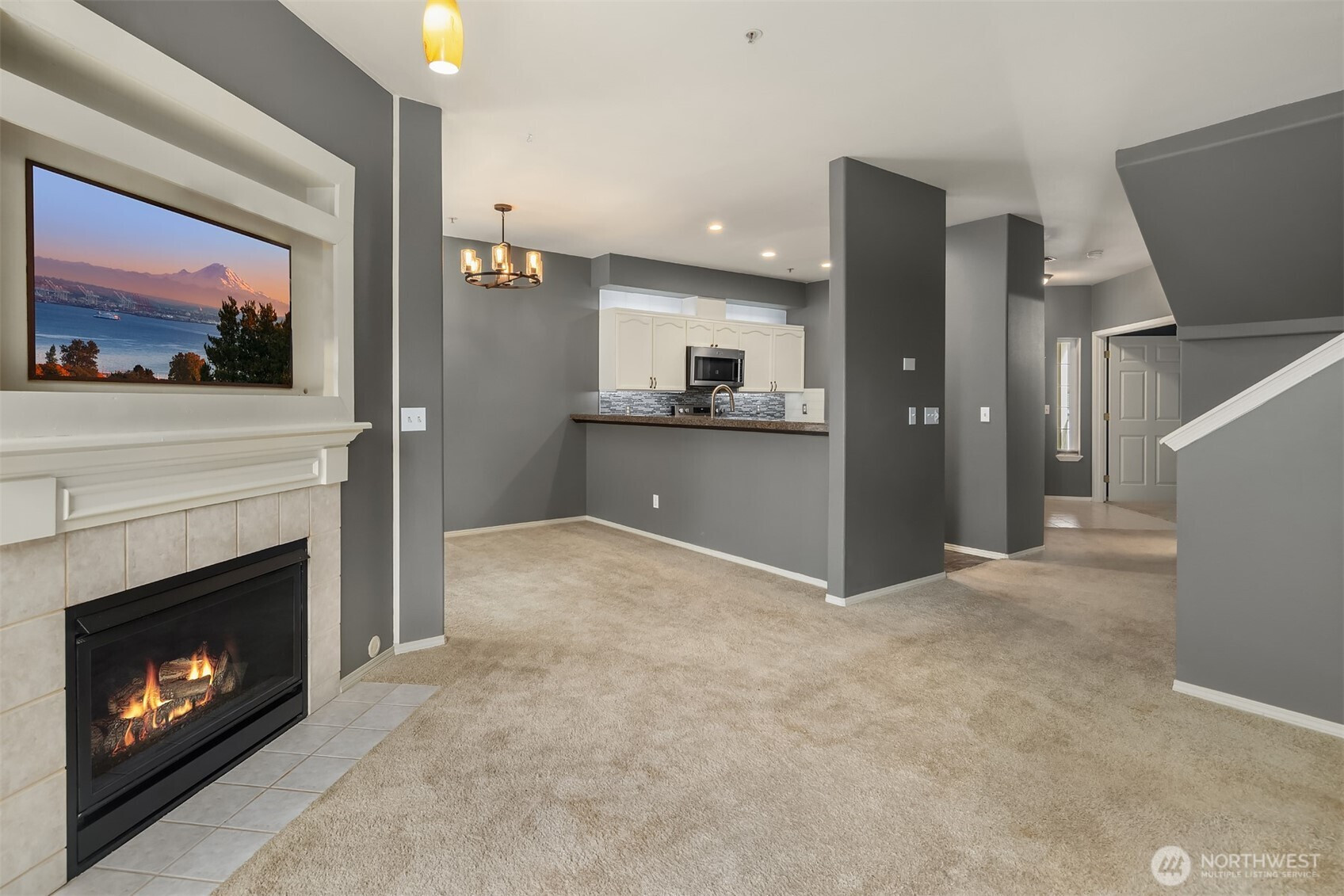(650)533-3259Tucked away townhome in sought-after Woodinview ~ Conveniently nestled between downtown Woodinville & downtown Bothell with rapid access to 405, this spacious 1,348sf two-story features 2 bedrooms, 2.5 baths, den/office & private garage with driveway parking. Spacious open floor plan backed to scenic evergreens with 9' tall ceilings, dramatic oversized windows & designer upgrades throughout. Covered porch opens to tiled foyer with walk-in entry closet. Updated kitchen with granite counters, full-height glass tile backsplash, large pantry & sprawling breakfast bar opens to formal dining, entertainment-sized balcony & grand living room with gas fireplace & cascading open staircase. Desirable double-door den & powder room on main make an ideal home office hideaway. Lofted upper hall with eclectic chandelier & well positioned laundry. Impressive double-door primary suite with cathedral ceilings, territorial views, walk-in closet with custom organizers & lavishly appointed 5-piece bath with corner soaking tub, frameless glass shower, 7' dual-sink maple vanity & extensive tiling throughout. Secondary suite with folding Murphy bed & attached bath with tiled surround & new LVP floors. Efficient gas furnace with heat pump & central A/C!
