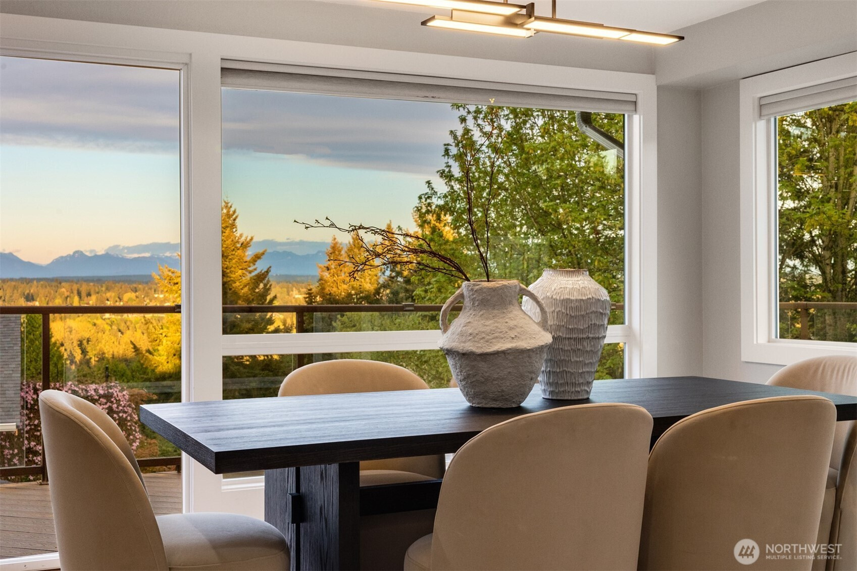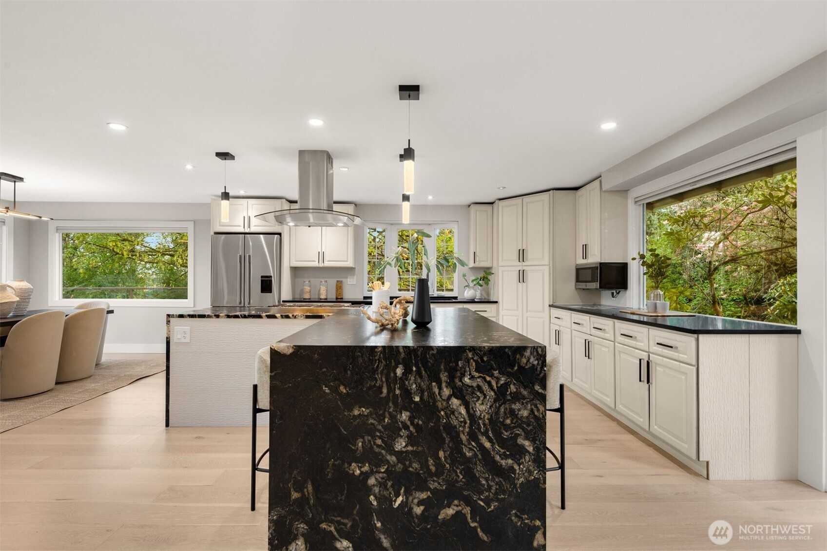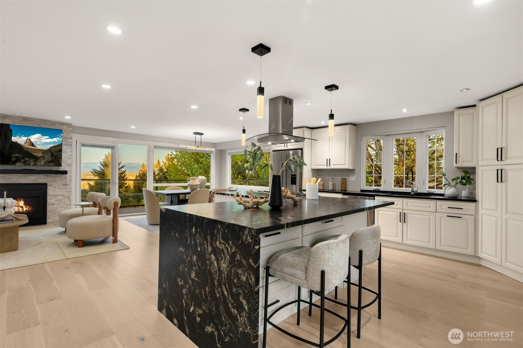 (650)533-3259VIEWS!! Jaw-dropping territorial & mountain views set the stage for this beautifully updated home where every detail has been elevated. Stunning by day & breathtaking at sunset, the views never get old. The open main level is flooded with abundant natural light through oversized windows and stunning views creating an effortless flow between living, dining, and kitchen — with all main living spaces conveniently on one floor for easy daily living. The chef’s kitchen is the heart of it all — anchored by a dramatic quartz island with a waterfall edge, gas range + a breakfast bar perfectly positioned to take in the views. Wide-plank hardwood floors tie the space together with a refined, contemporary edge. The living room features a stacked stone gas fireplace, & a slider opens directly to a large wraparound deck designed for view-chasing at every hour. The primary suite is conveniently located on the main floor. Two other bedrooms on the main floor level as well. The lower level features a fully equipped 2nd kitchen, a bedroom, expansive family room, gas fireplace, & a separate private entrance, offering 2 fully independent levels & exceptional flexibility for guests, extended family, or rental income. This move-in-ready gem combines functional design w/ the best of Pacific Northwest living. Newer appliances, furnace, & water heater. Tucked in a private, quiet Finn Hill neighborhood, adjacent to greenbelt, mins from DT Kirkland.