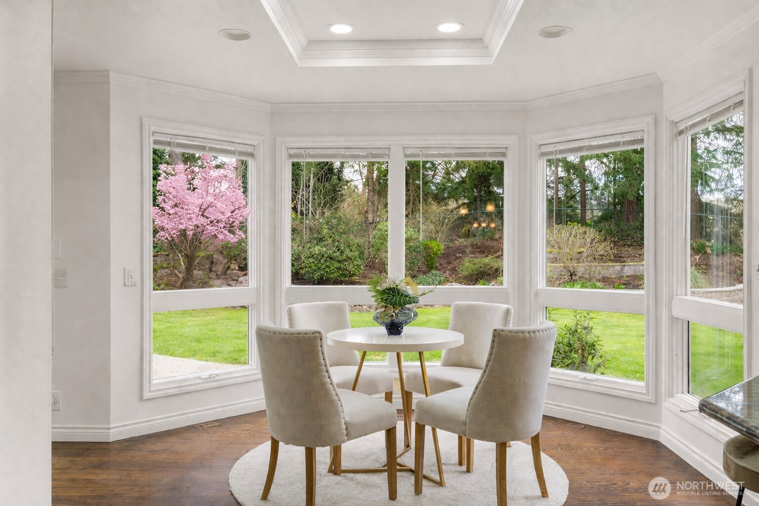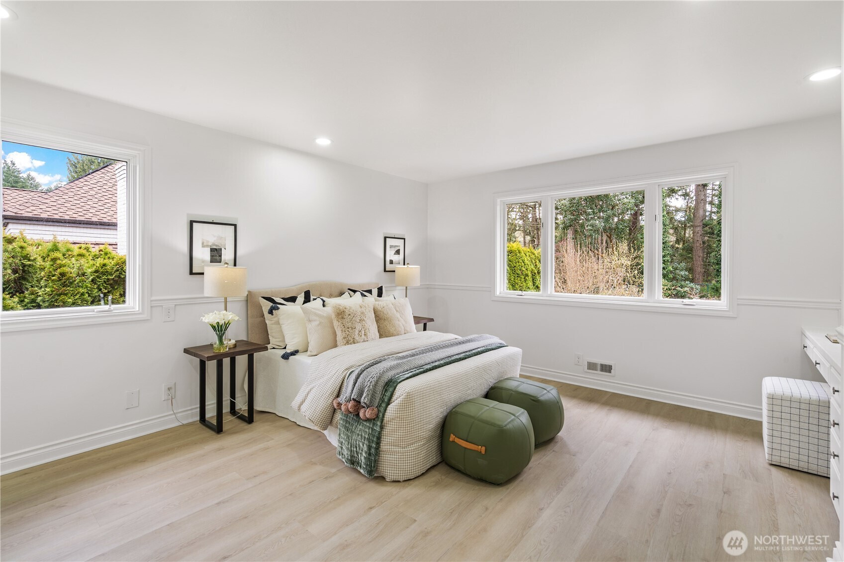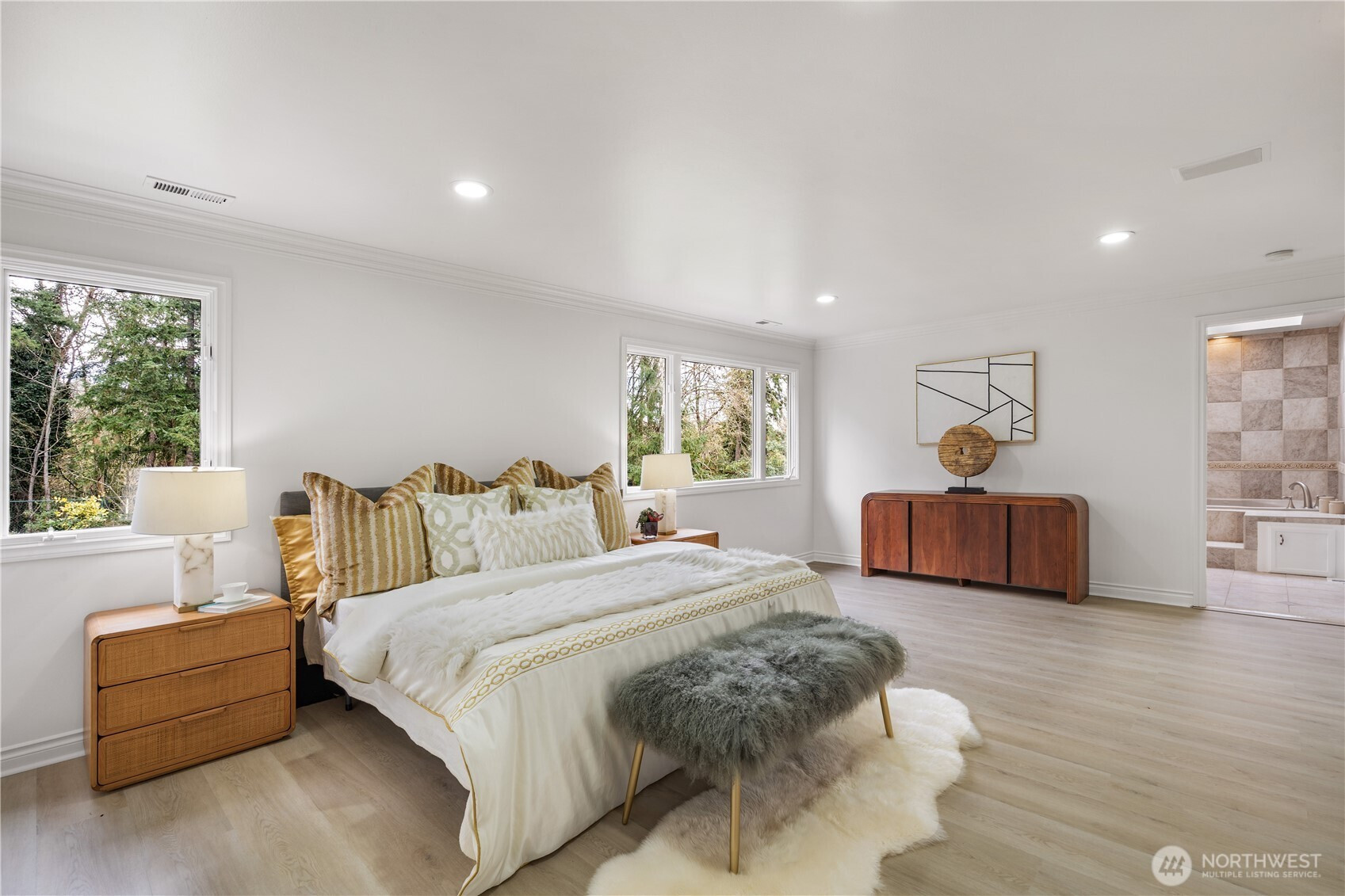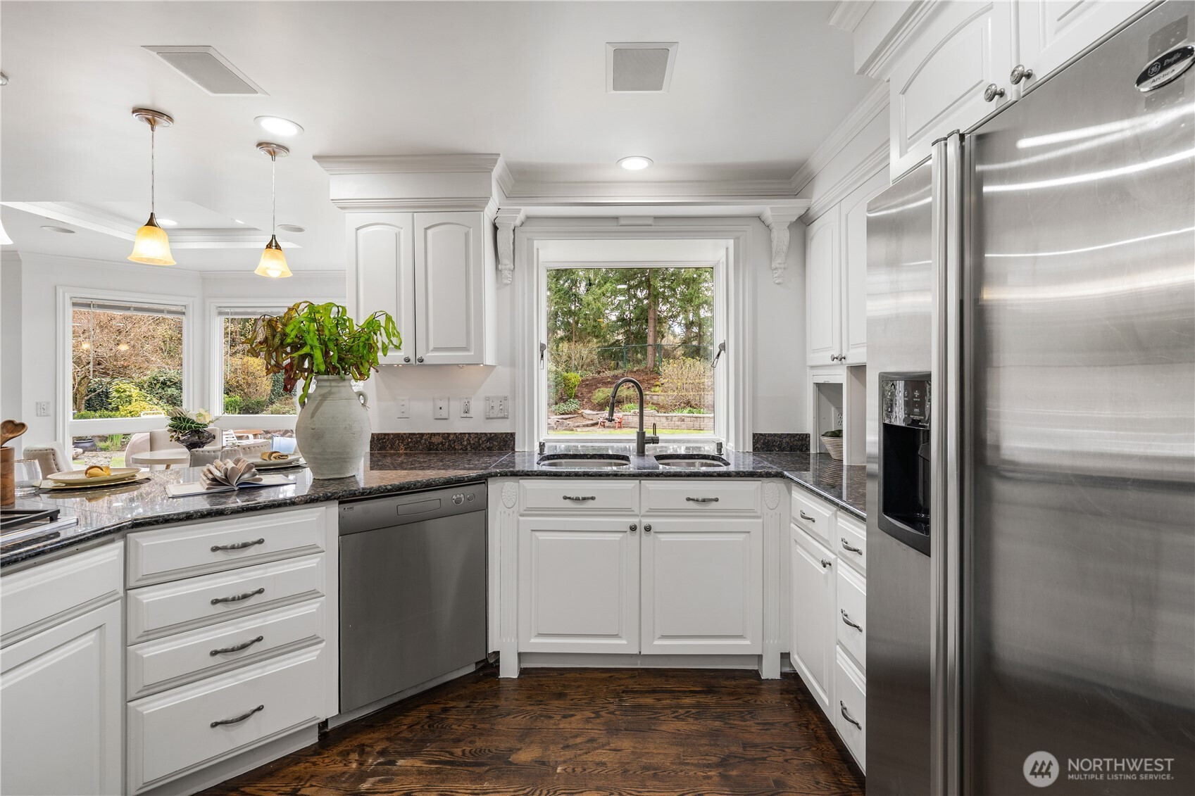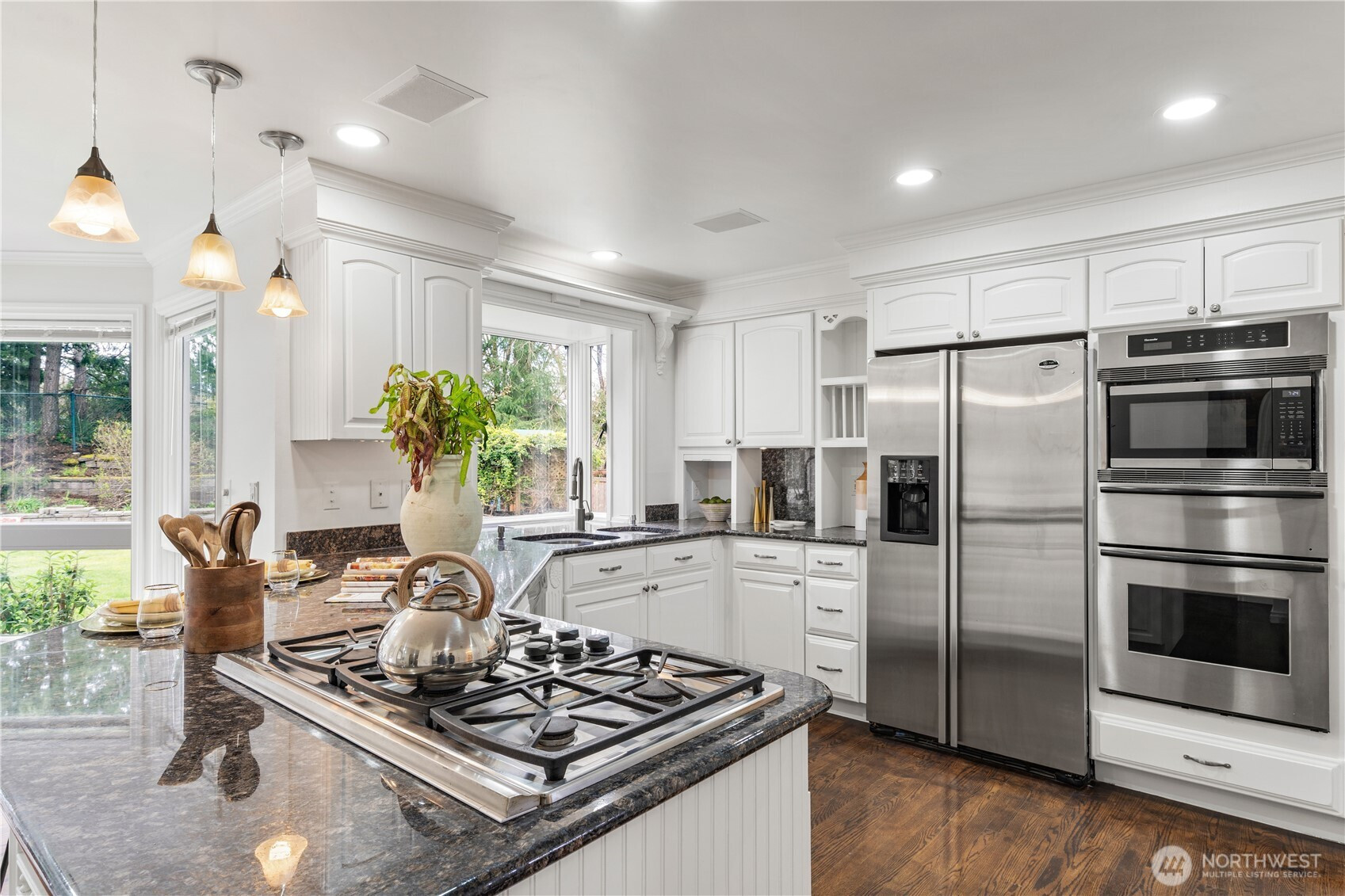 (650)533-3259Exceptional luxury living in coveted Amherst! Situated on a rare, expansive level lot backing to a serene greenbelt, this beautifully updated 5-bedroom, 4.5-bath residence offers timeless elegance, privacy, and modern comfort in one of Bellevue’s most desirable neighborhoods. Grand vaulted ceilings, skylights, rich hardwood floors, and two fireplaces create a warm yet sophisticated ambiance. Formal living and dining rooms provide refined entertaining spaces, while the dramatic family room opens seamlessly to the updated gourmet kitchen, featuring quartz countertops, stainless steel appliances, double ovens, and a sunlit breakfast nook overlooking the lush south-facing backyard. The luxurious primary suite is a private retreat with sitting area, oversized walk-in closet, and spa-inspired 5-piece bath. A main-floor guest suite is ideal for visitors or multigenerational living. Designed for exceptional indoor-outdoor living with an entertainment-sized deck, patio, built-in fire pit, pond with waterfall, fully fenced yard, vegetable gardens, fruit trees, and fragrant shrubs including jasmine, gardenia, lavender, and lilac. Major updates include new interior paint, new flooring, kitchen upgrades, refreshed landscaping, 2 new furnaces and A/Cs, new sump pump, attic and crawl space insulation, and newer garage doors. 2012 roof. Award-winning Bellevue schools. A rare blend of luxury, space, and lifestyle.