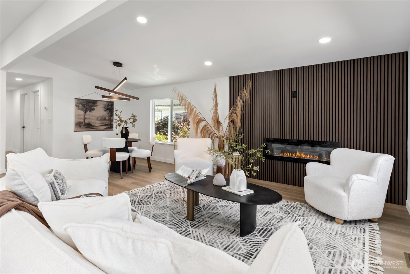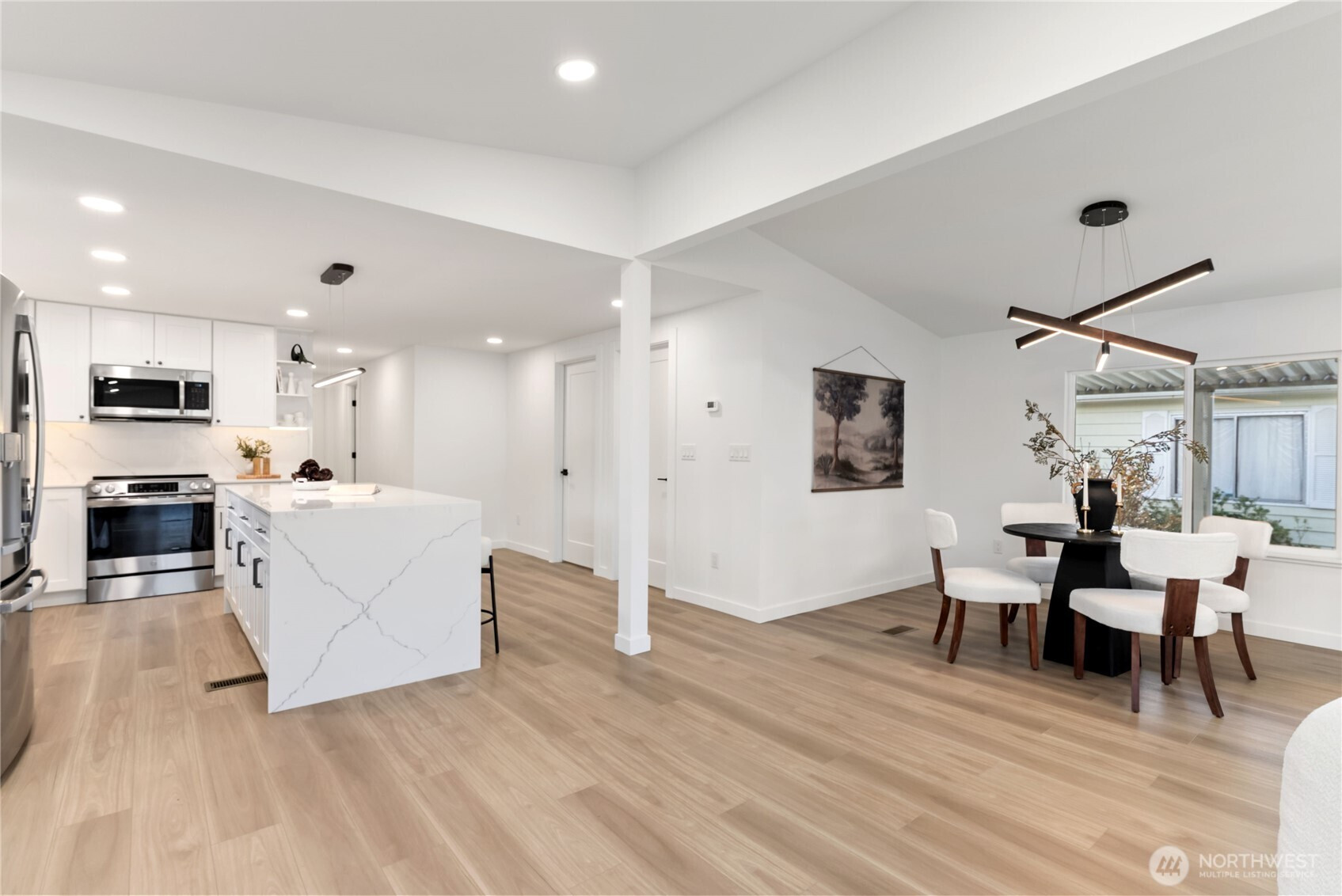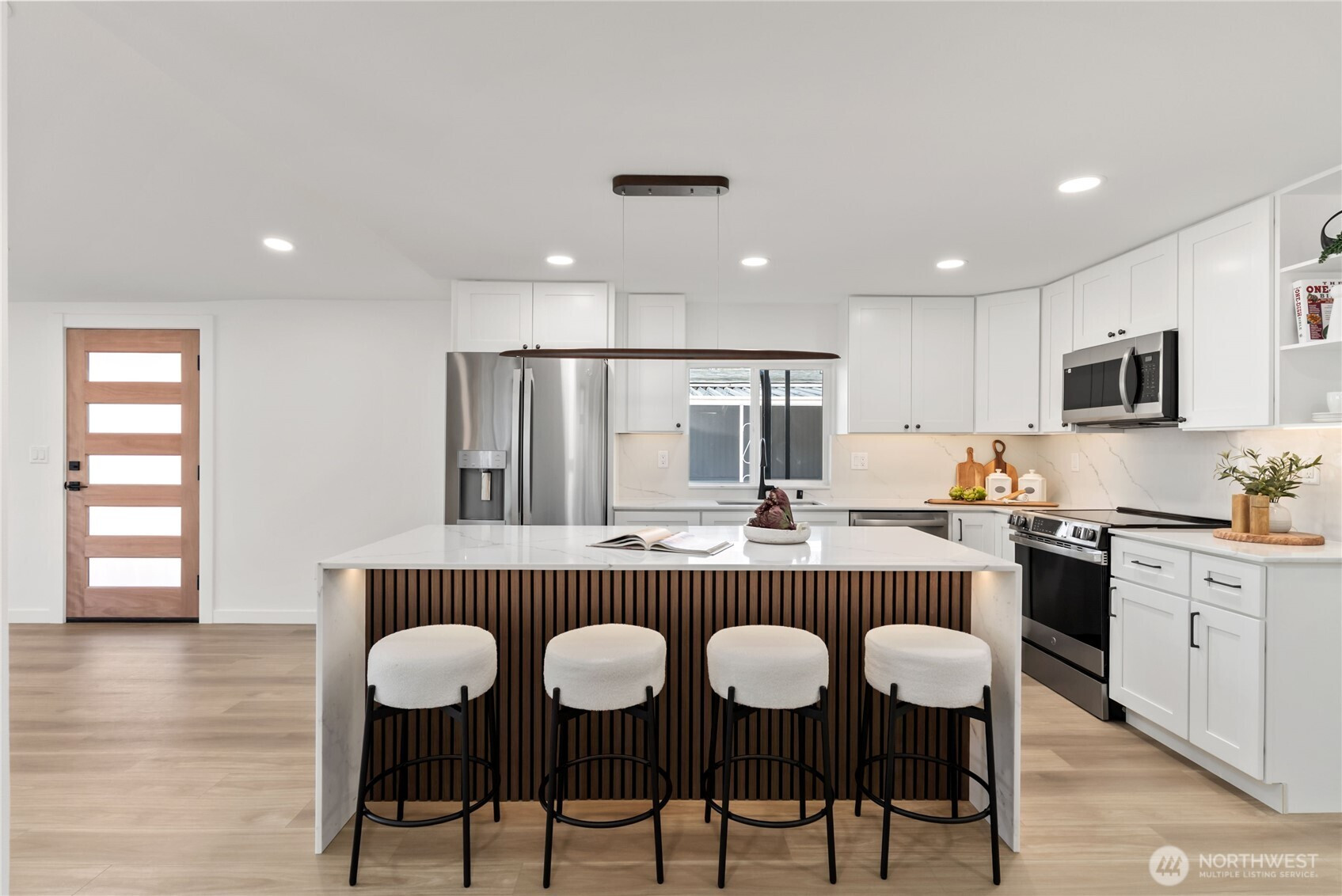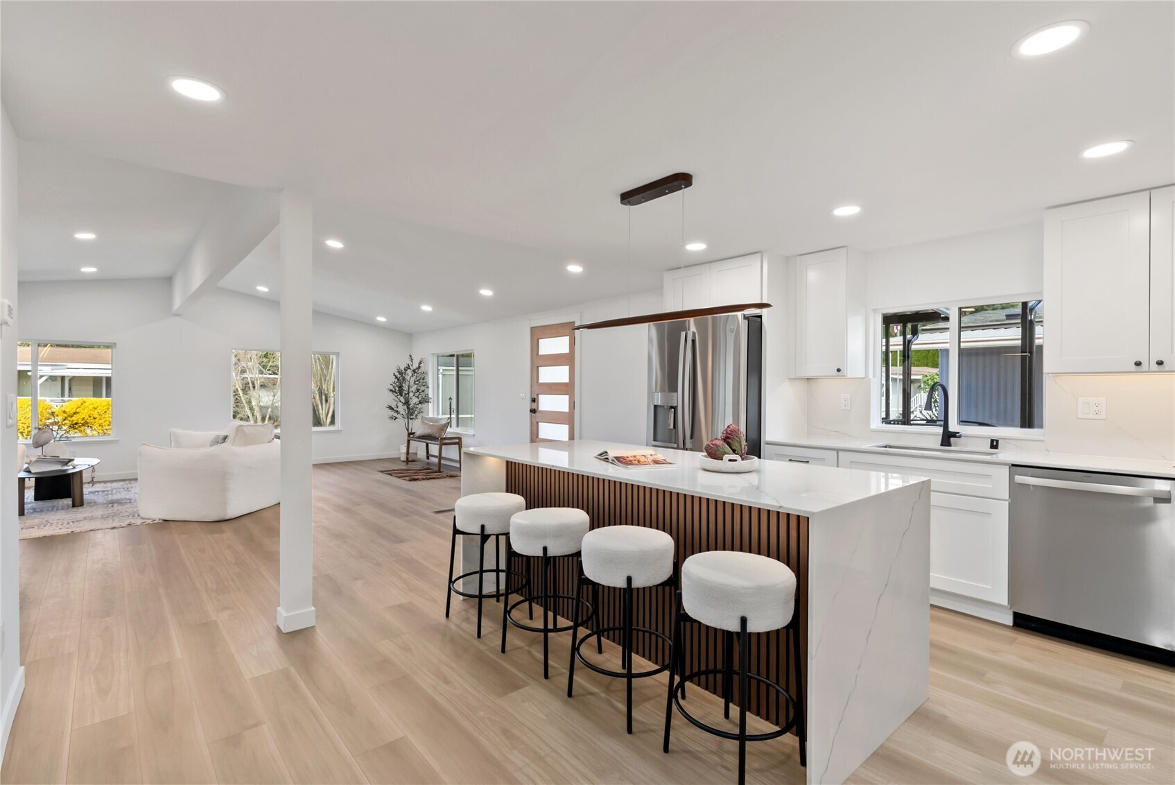 (650)533-3259One of the finest homes in the sought-after 55+ Walnut Grove community, this fully remodeled 3-bedroom, 2-bath residence offers exceptional style and comfort throughout. Thoughtfully updated inside and out, featuring a new roof, new windows, new furnace with heat pump, and beautiful LVP flooring. The stunning chef’s kitchen showcases new custom cabinetry, waterfall quartz countertops, full-height quartz backsplash, under-cabinet and island lighting, stainless steel appliances, and a sleek slide-in range. Vaulted ceilings elevate the expansive living room, anchored by a striking electric fireplace and seamless flow into the dining area—perfect for entertaining. Enjoy year-round relaxation on the covered front porch with a warm wood accent entry, surrounded by mature landscaping. The spacious layout includes a generous laundry room with direct access to a 3-car carport and a large storage shed. Retreat to the luxurious primary suite featuring a second electric fireplace, oversized walk-in closet, double vanity with motion-sensor lighting, and a spa-inspired jetted tub with customizable lighting. A versatile second suite with its own bath offers ideal flexibility for guests or shared living. Ideally located near scenic trails, the Green River, shopping, dining, and transit including Kent Station. This is refined, turnkey living at its best—truly a must-see.