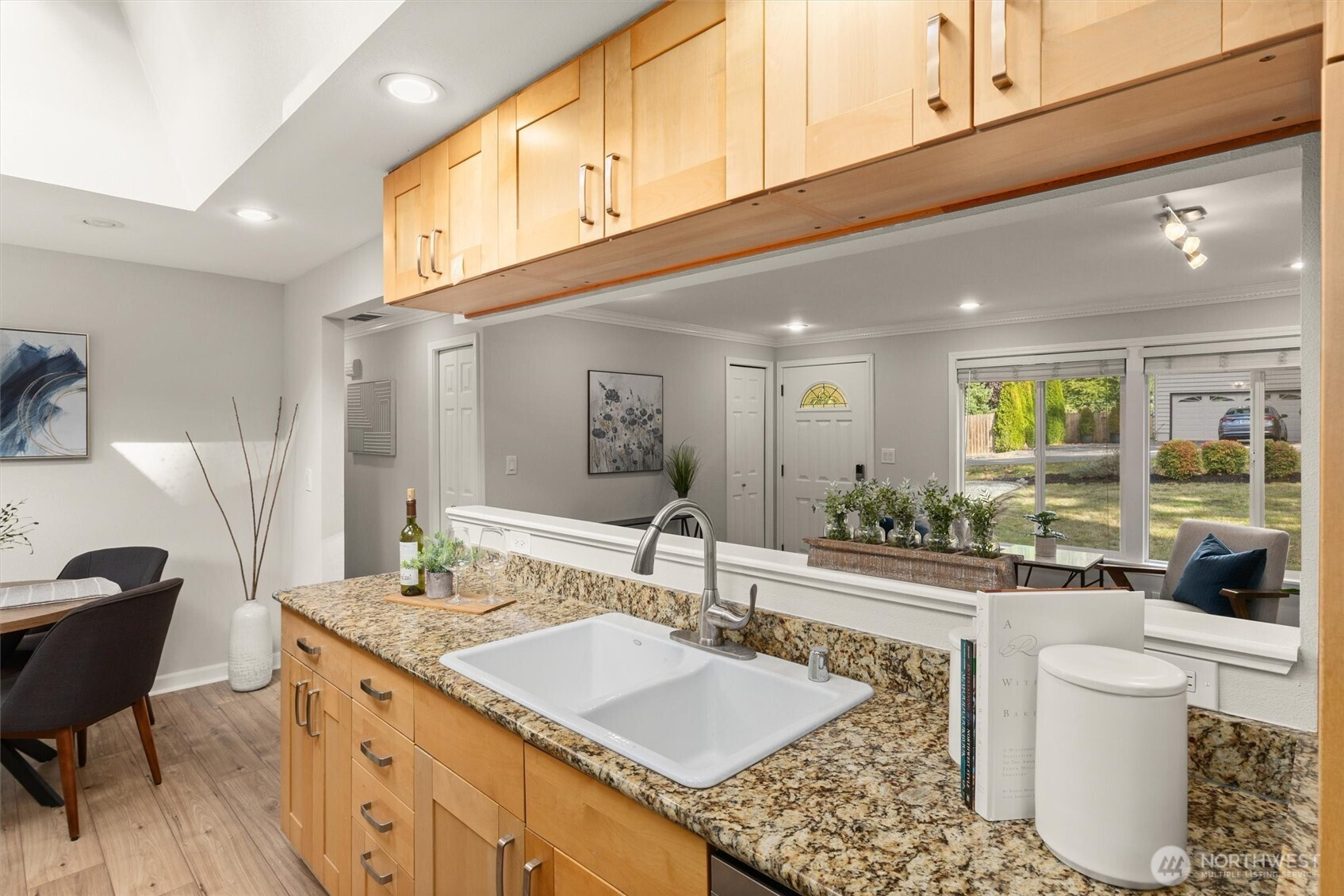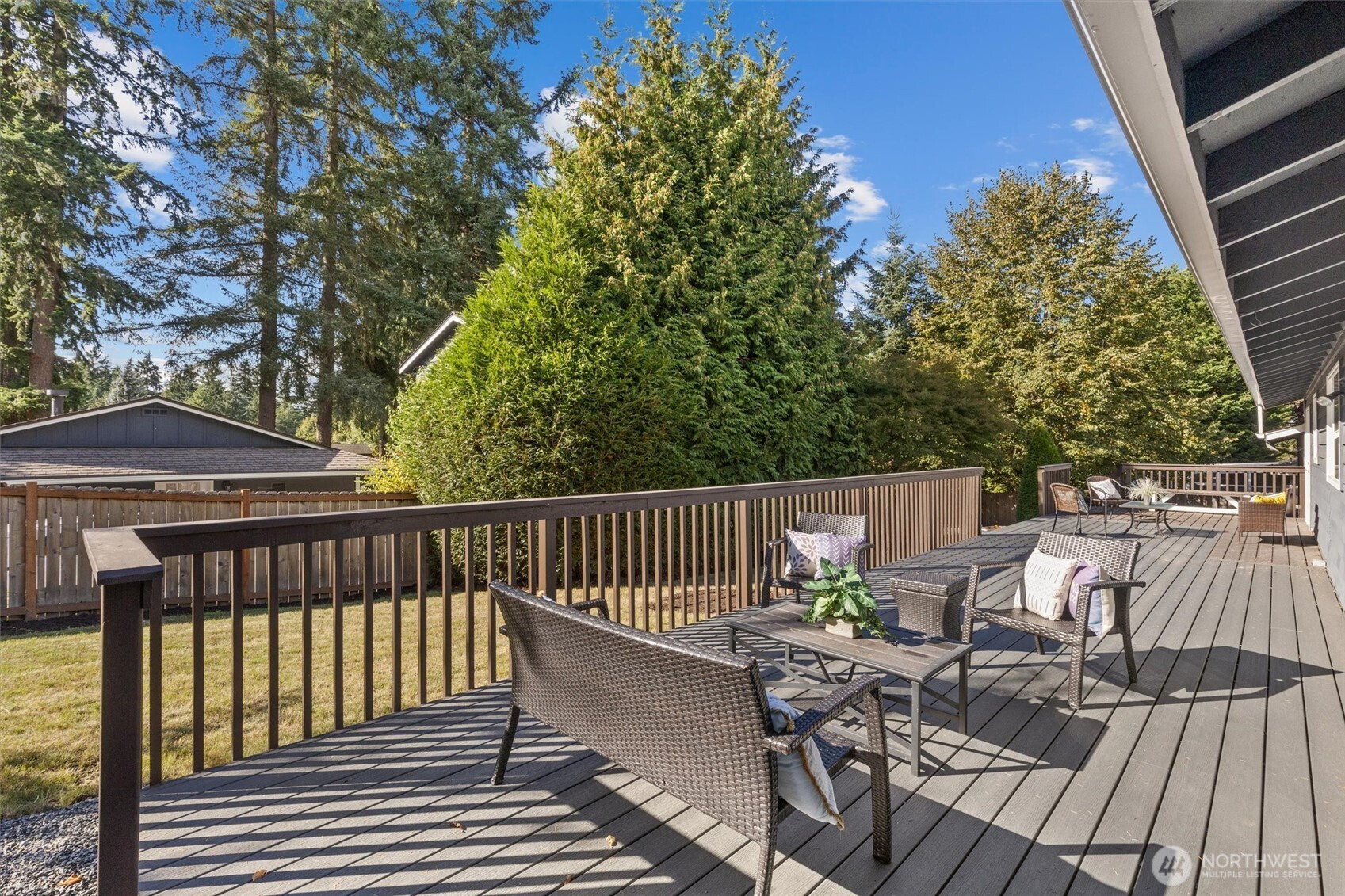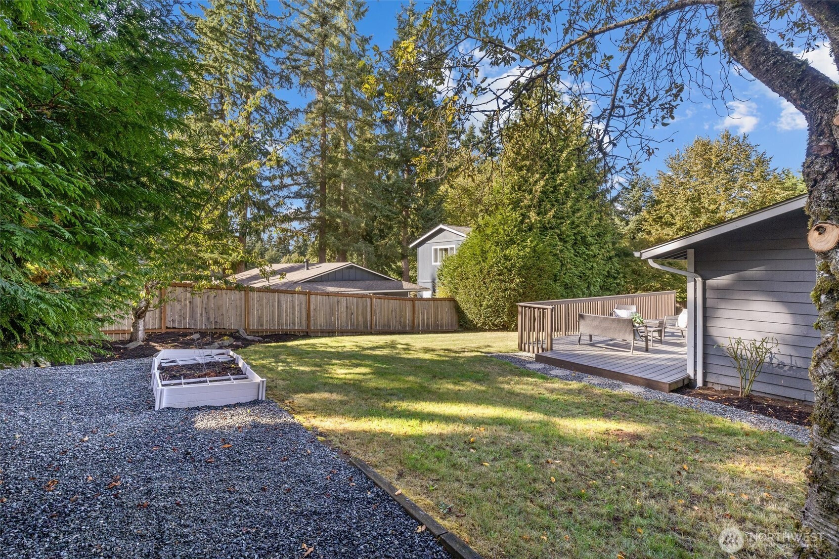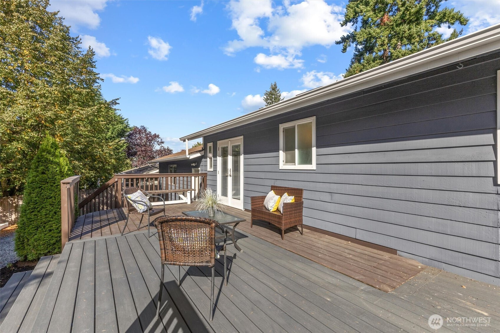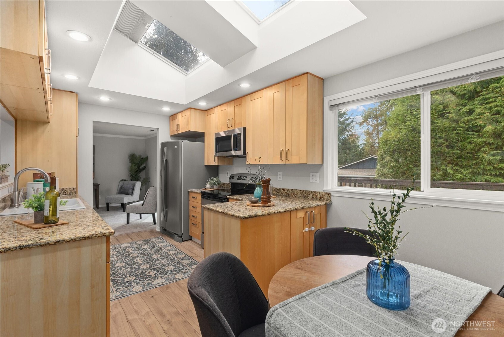 (650)533-3259Tastefully updated rambler sits comfortably on a large corner lot in the coveted Northshore School District. New floors & paint throughout this turn-key home. Natural light floods through over-sized skylights & windows creating a light & bright great-room. Granite countertops & SS appliances compliment shaker cabinets in this open-concept, galley kitchen. Living room w/ cozy, gas fireplace & additional family room offer versatile gathering space for all. Down the hall leads to primary bedroom with en-suite bath & a full bath serving the additional bedrooms. An extra room offers space for work from home, guest room, or additional bedroom. Huge, newly refinished deck leads to meticulous landscape w/ mature trees for private outdoor living.