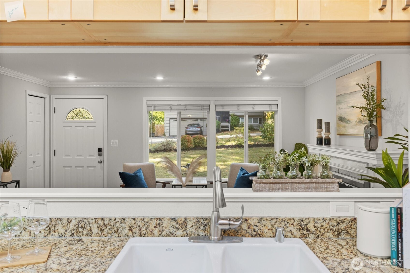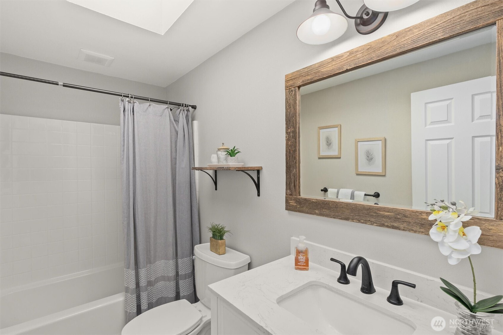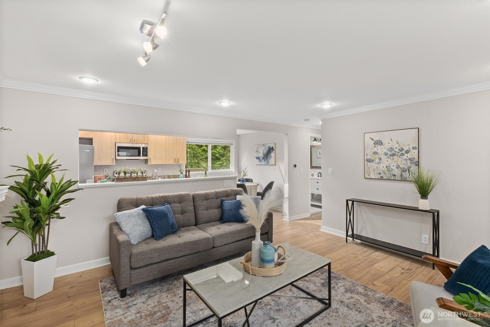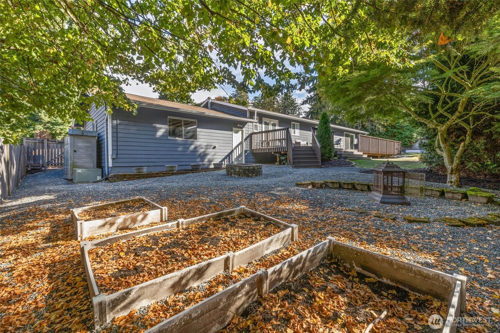 (650)533-3259Tastefully updated rambler sits comfortably on a large corner lot in the coveted Northshore School District. New floors & paint throughout this turn-key home. Natural light floods through over-sized skylights & windows creating a light & bright great-room. Granite countertops & SS appliances compliment shaker cabinets in this open-concept, galley kitchen. Living room w/ cozy, gas fireplace & additional family room offer versatile gathering space for all. Down the hall leads to primary bedroom with en-suite bath & a full bath serving the additional bedrooms. An extra room offers space for work from home, guest room, or additional bedroom. Huge, newly refinished deck leads to meticulous landscape w/ mature trees for private outdoor living.