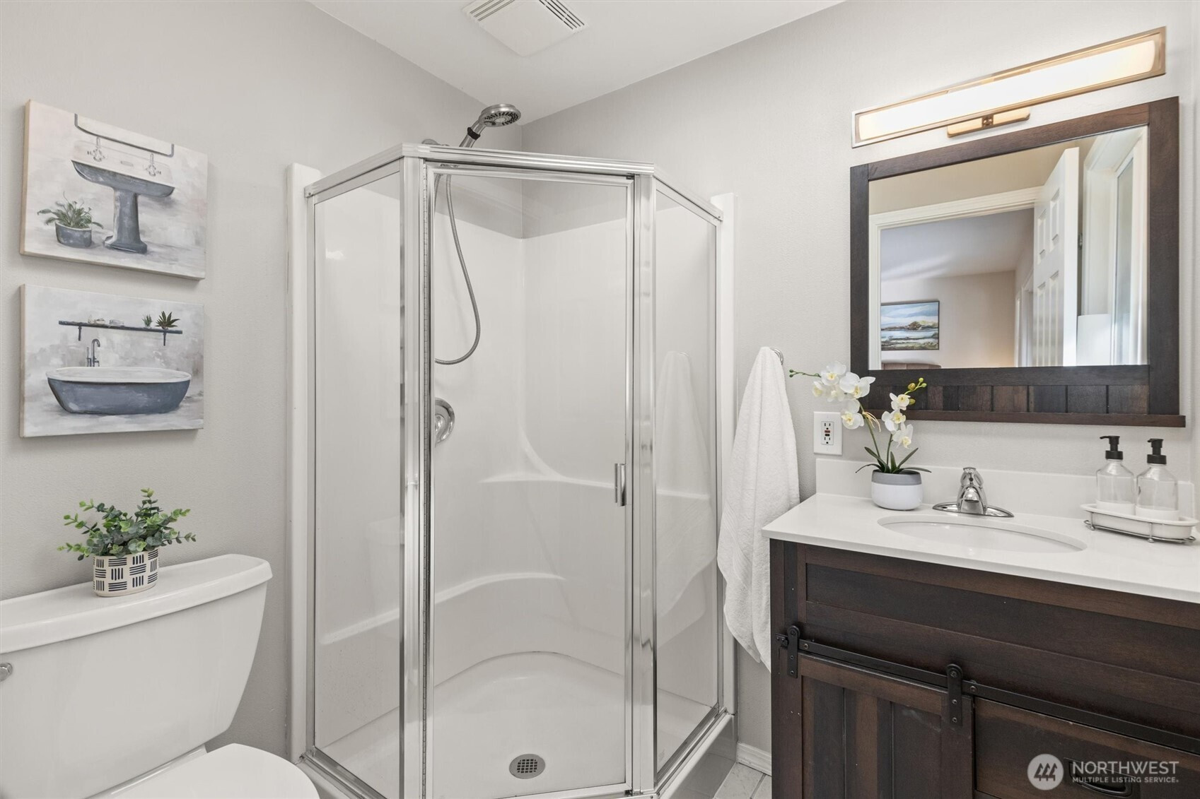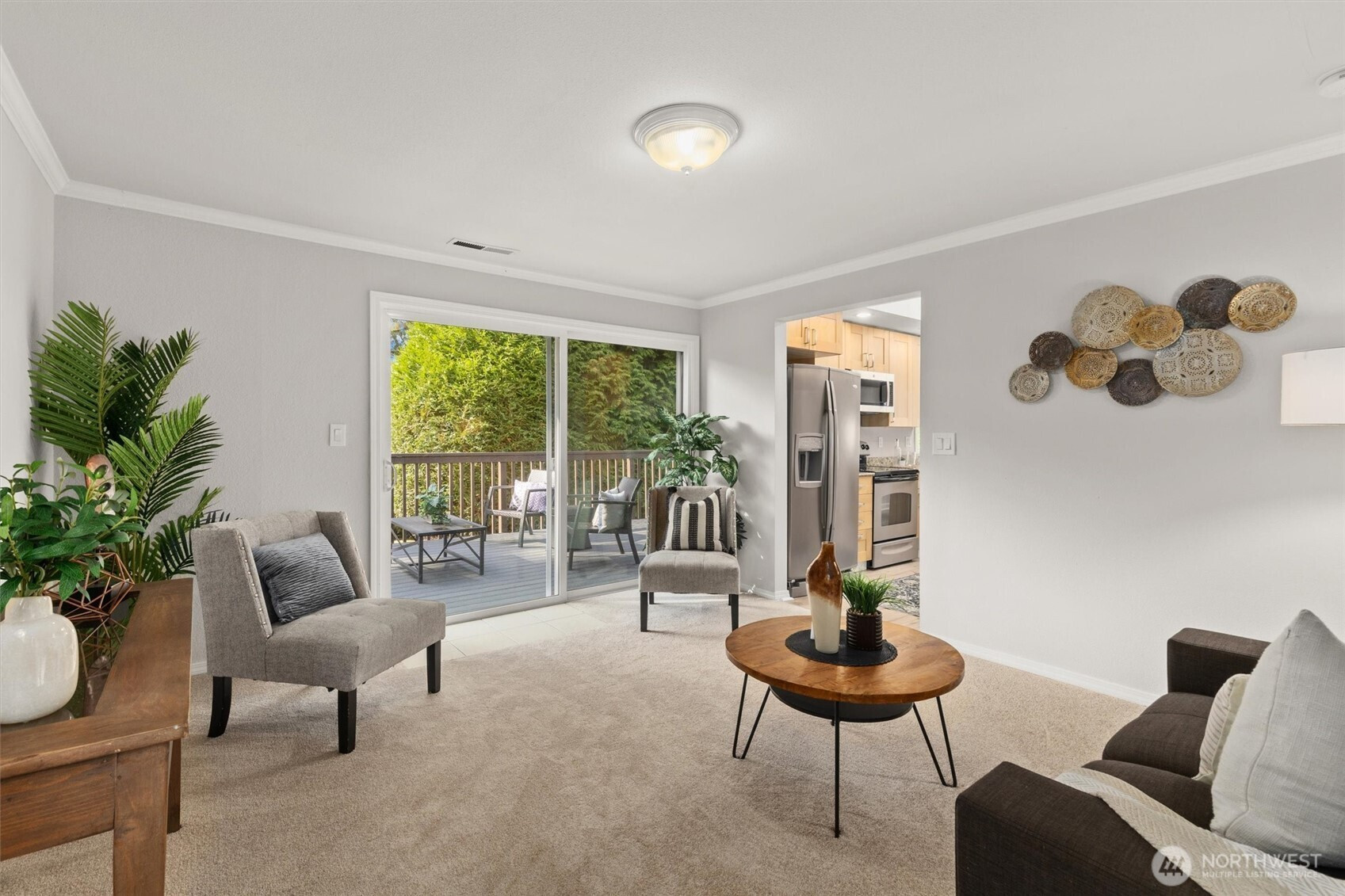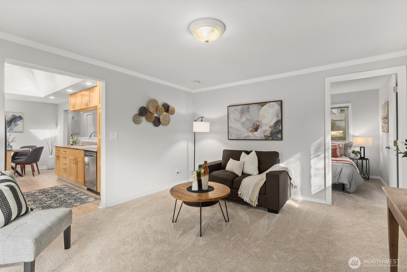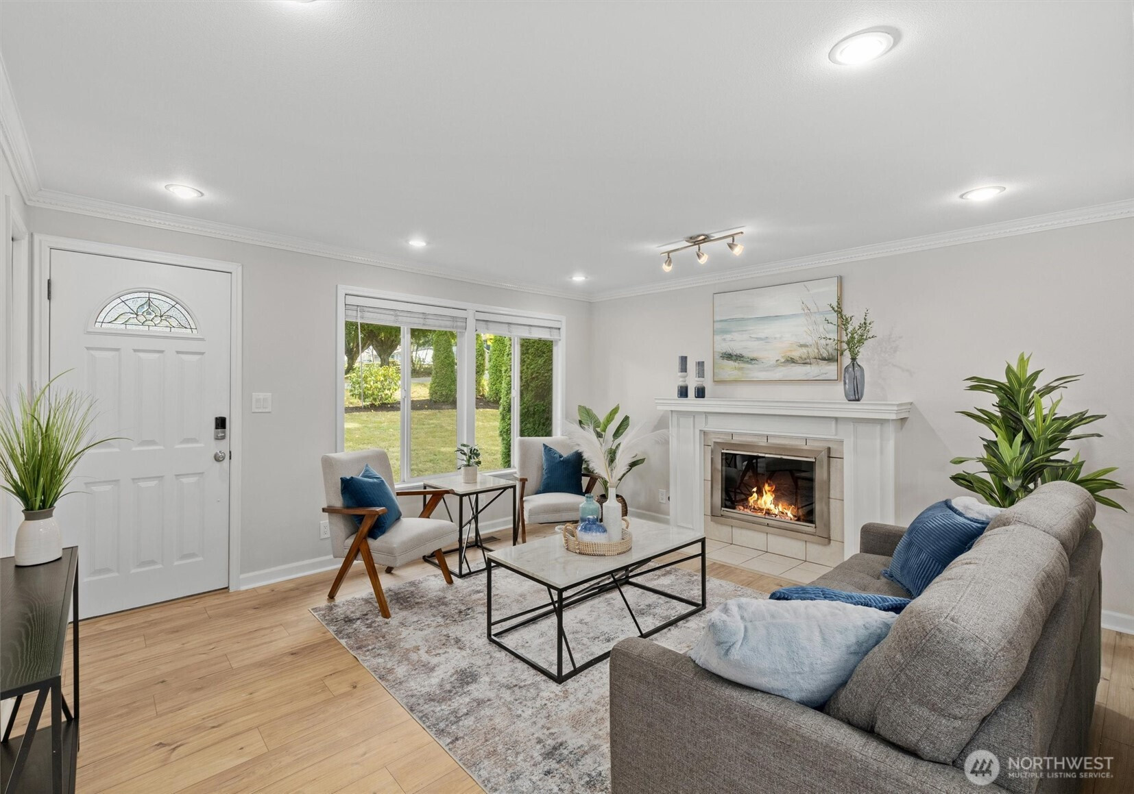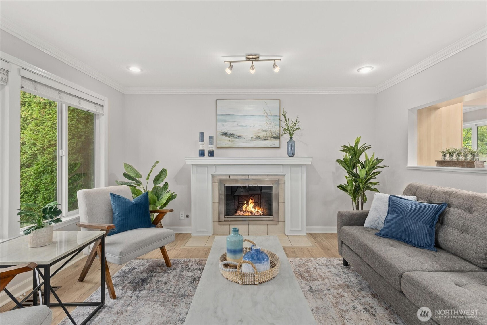 (650)533-3259Tastefully updated rambler sits comfortably on a large corner lot in the coveted Northshore School District. New floors & paint throughout this turn-key home. Natural light floods through over-sized skylights & windows creating a light & bright great-room. Granite countertops & SS appliances compliment shaker cabinets in this open-concept, galley kitchen. Living room w/ cozy, gas fireplace & additional family room offer versatile gathering space for all. Down the hall leads to primary bedroom with en-suite bath & a full bath serving the additional bedrooms. An extra room offers space for work from home, guest room, or additional bedroom. Huge, newly refinished deck leads to meticulous landscape w/ mature trees for private outdoor living.