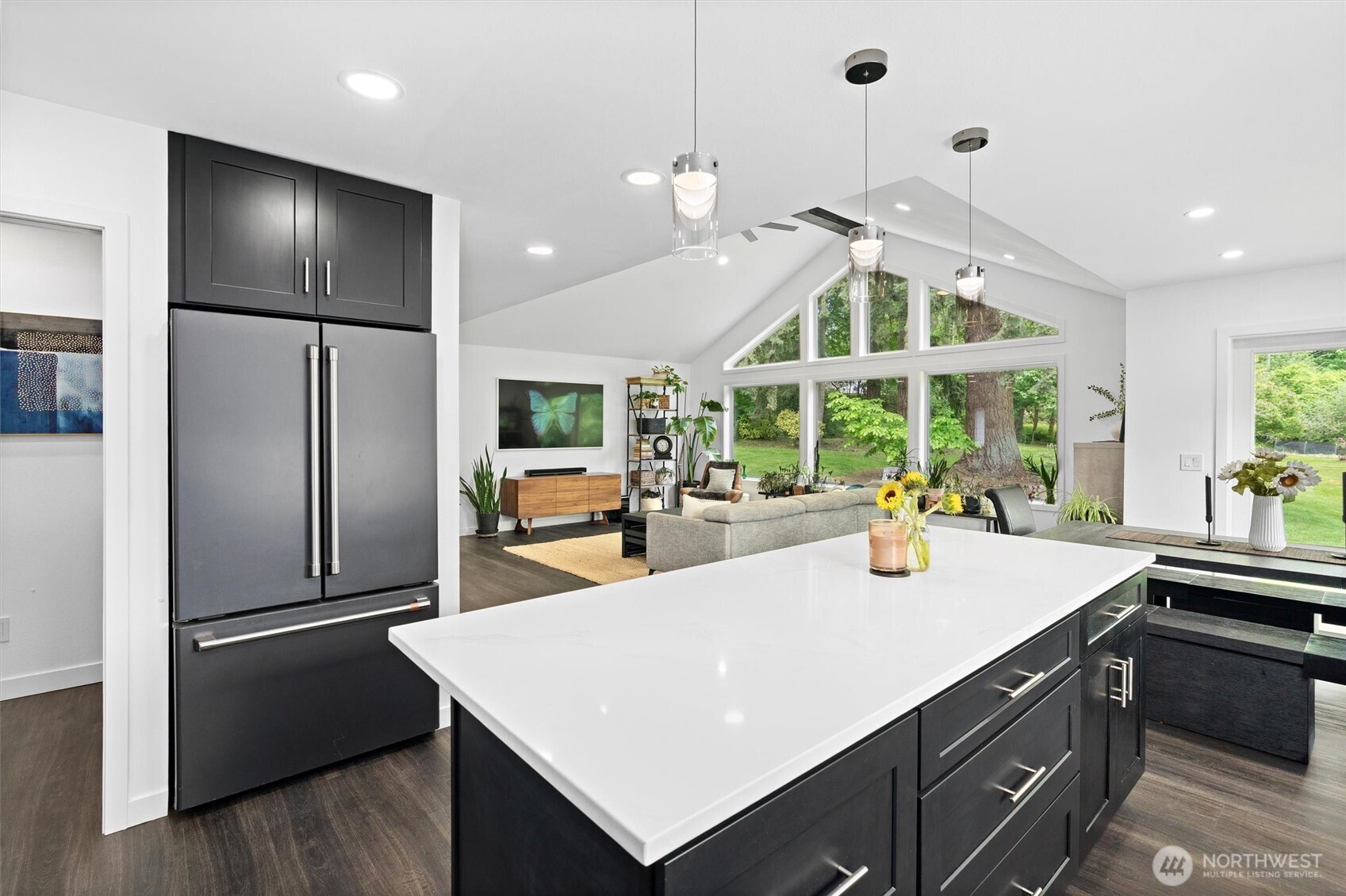 (650)533-3259Don't miss this beautifully updated rambler on 1.5+ acres in a quiet cul-de-sac where charm meets modern function. This move-in-ready 3-bedroom, 2-bath home offers approx. 1,540 sqft. with an open layout, vaulted ceilings, and floor-to-ceiling windows that flood the great room with natural light. The custom kitchen features quartz countertops, handcrafted cabinetry, a large island with bar seating, and matte-black Café appliances built for both entertaining and daily living. The primary suite features a walk-in closet and a floating vanity with motion-sensing under-cabinet lighting. Upgrades include luxury vinyl plank flooring, custom closet organizers, and under-cabinet kitchen lighting. Outside, a massive 28' x 42' shop includes an RV bay door, 50A generator hookup, and RV parking with power. Enjoy a fully fenced garden space, a greenhouse, and a flat, usable yard. Recent improvements: new furnace, blown-in insulation, and professionally cleaned roof. Complete with a two-car garage and a spacious laundry room with butcher block shelving and a large undermount sink. Located in the Issaquah SD, minutes to retail, this private retreat at the end of a dead-end road delivers both seclusion and convenience.