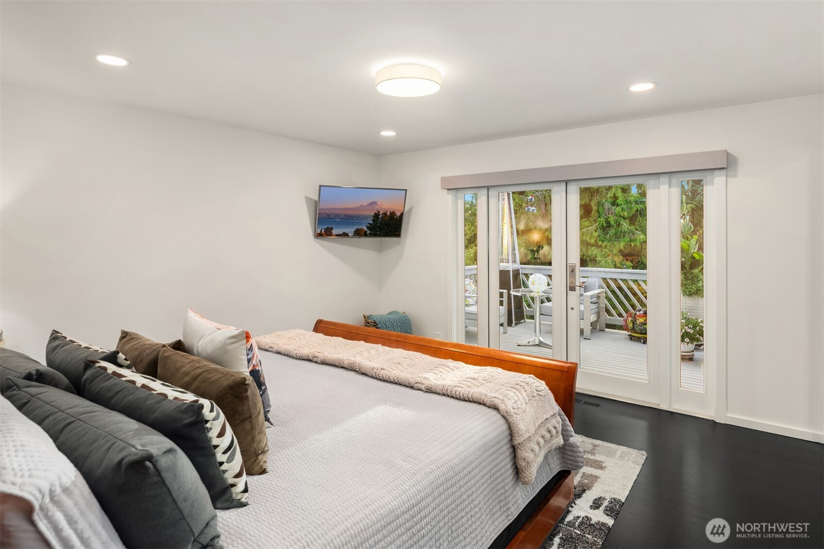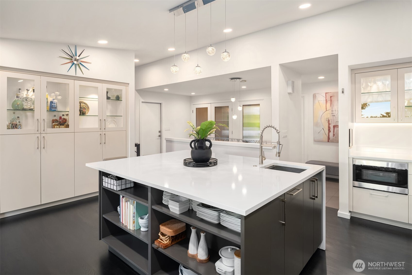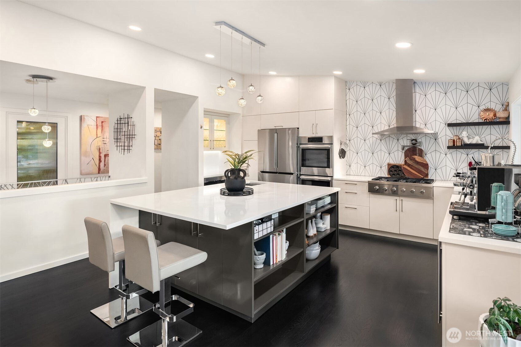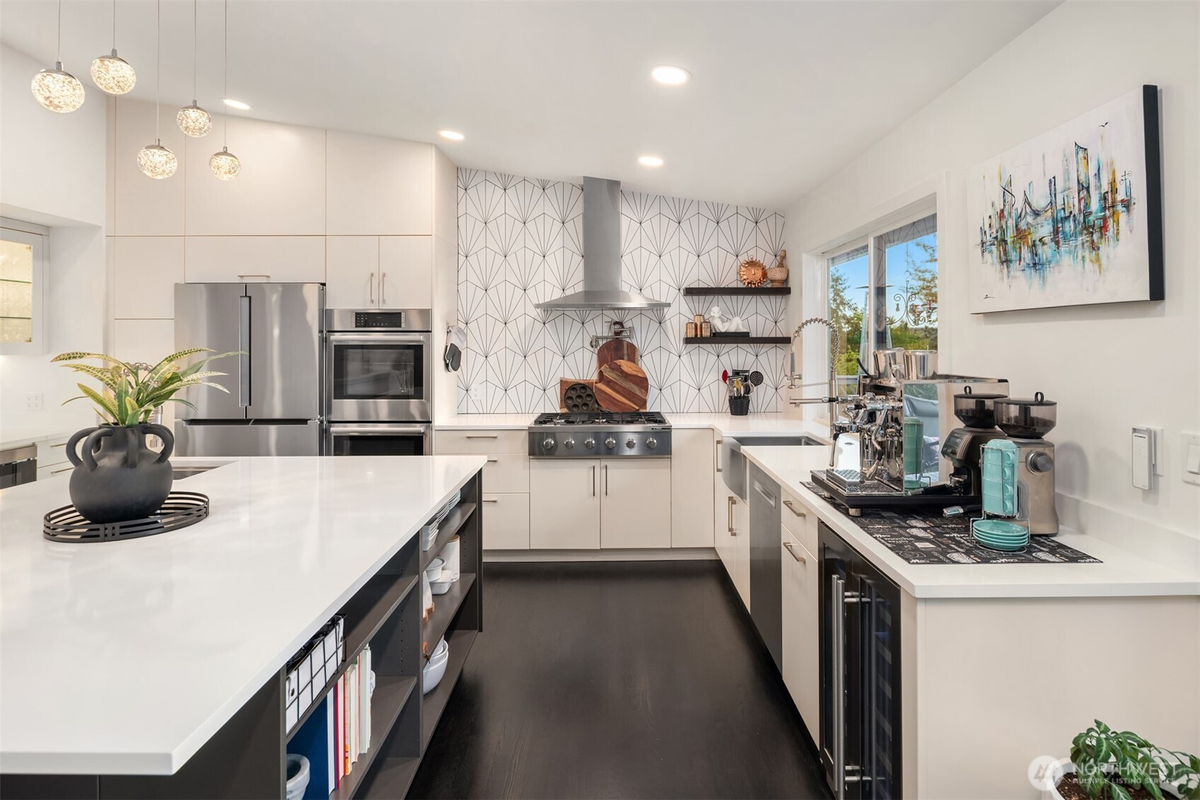 (650)533-3259This beautifully renovated daylight rambler in Bellevue’s coveted Woodridge community offers elegant living space designed for comfort and connection. The open kitchen, created by removing walls between the original kitchen and dining room, features a large island with prep sink, soft-close cabinetry, quartz countertops, pot filler, and dual-temperature wine cooler — perfect for entertaining. Vaulted ceilings seamlessly connect the kitchen to the living room and back deck for alfresco dining. The master suite includes a luxurious bath with heated floors, a bidet, and private deck access. Custom California Closets with soft-close drawers maximize storage throughout the home. The finished basement, completed in 2019, offers versatile spaces including a gym with custom closets and a guest/craft room with a queen Murphy bed. The family room boasts a new gas fireplace, built-in entertainment center, and a quartz-topped wet bar with wine storage. French doors lead to the backyard. Additional upgrades include a Navien tankless water heater (2024), heated bathroom floors, new roof, skylights, updated garage doors, double-pane windows, and modern interior finishes. Located just four blocks from Woodridge Elementary on a quiet street, this home blends modern upgrades with timeless charm in one of Bellevue’s best school districts.