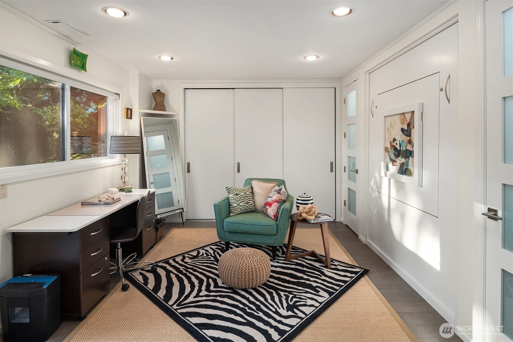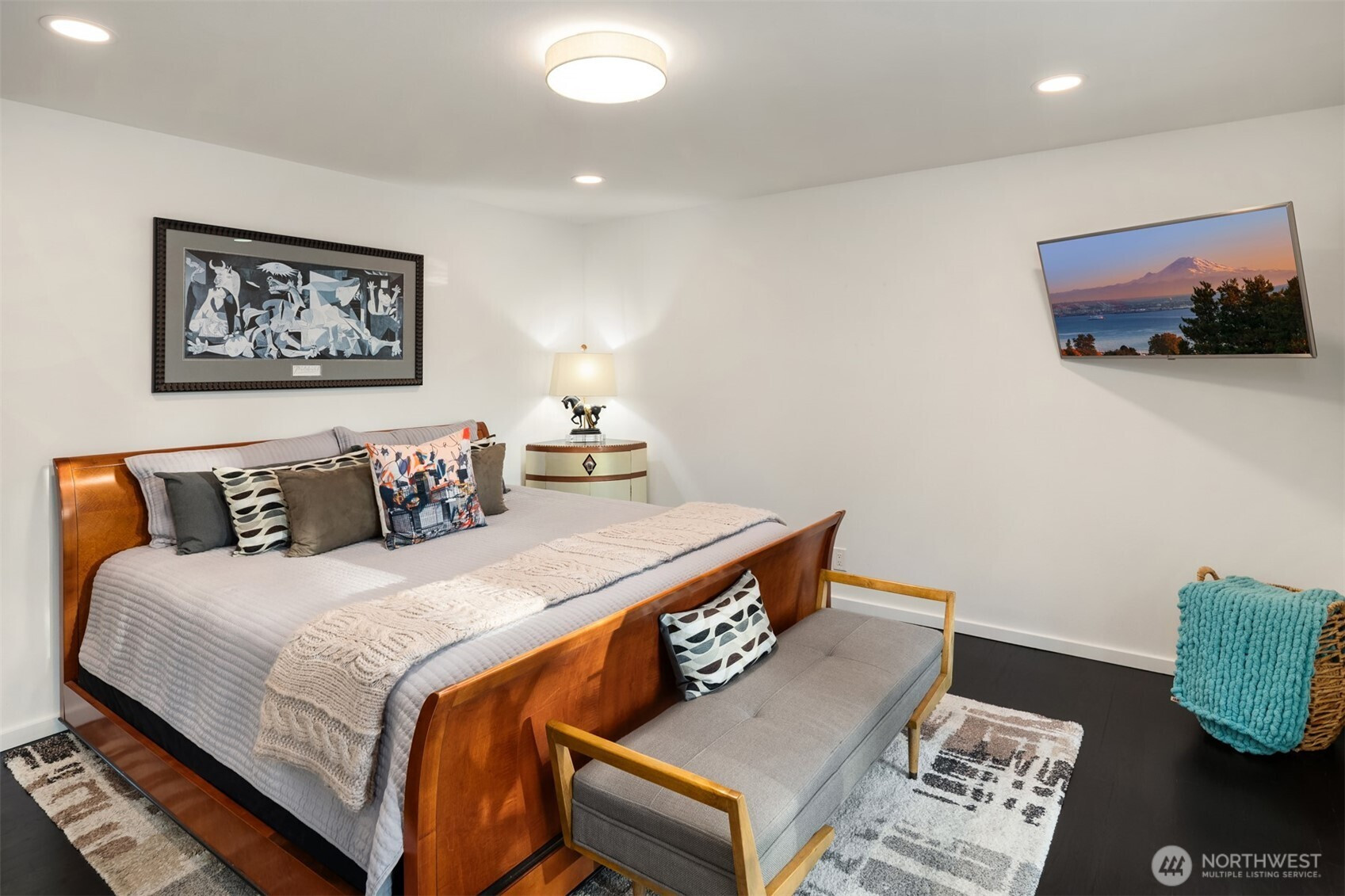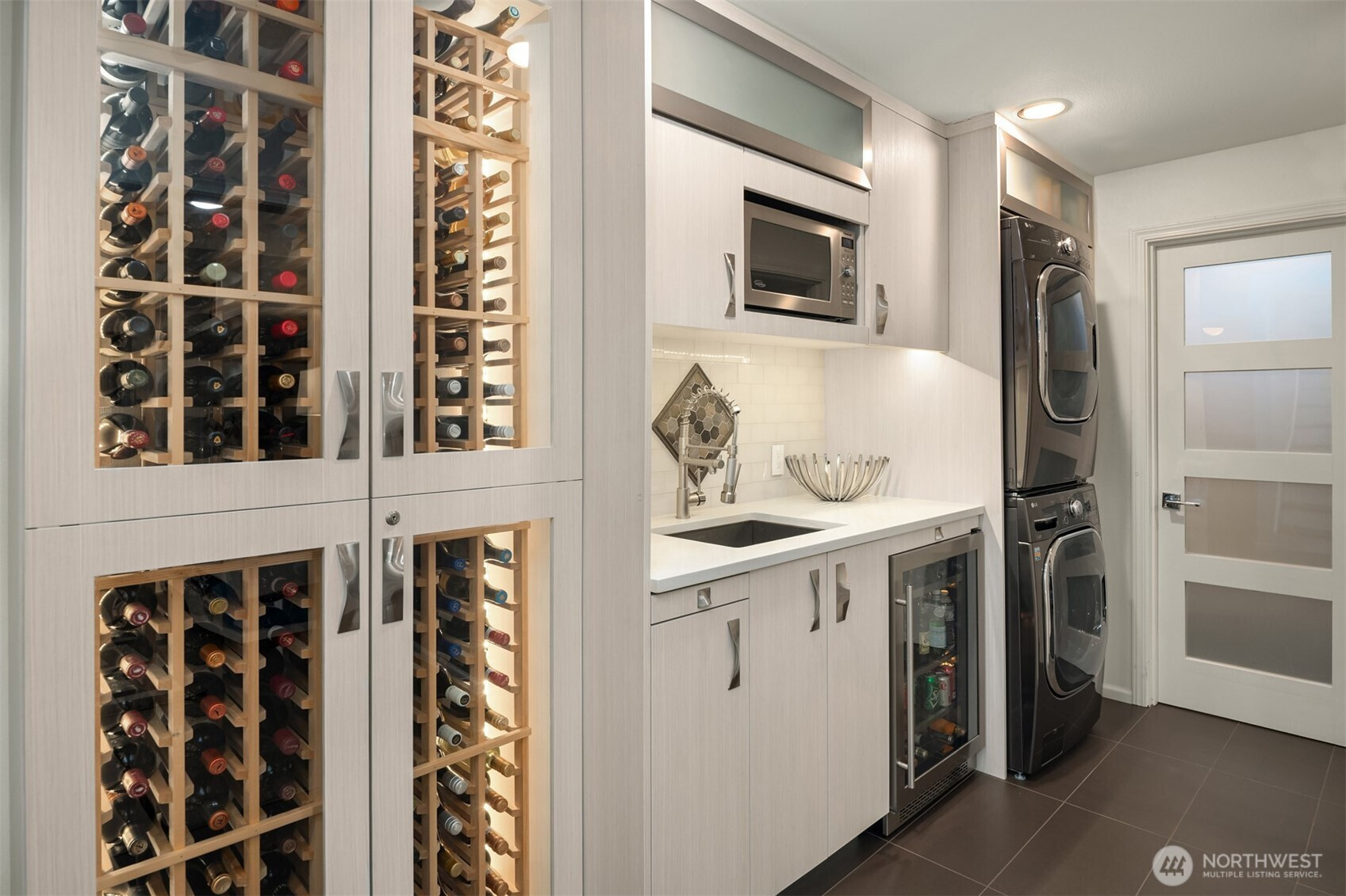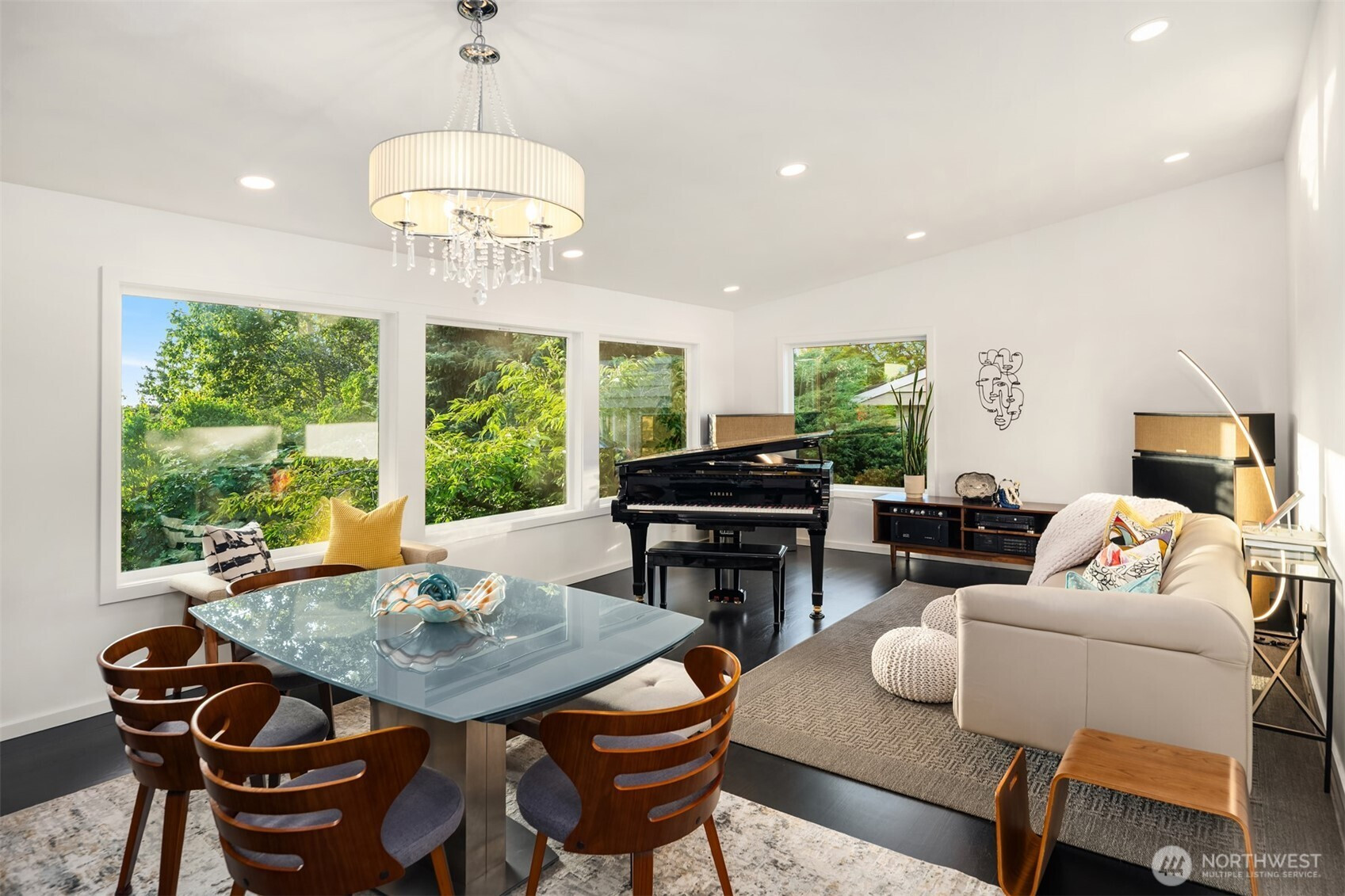 (650)533-3259This beautifully renovated daylight rambler in Bellevue’s coveted Woodridge community offers elegant living space designed for comfort and connection. The open kitchen, created by removing walls between the original kitchen and dining room, features a large island with prep sink, soft-close cabinetry, quartz countertops, pot filler, and dual-temperature wine cooler — perfect for entertaining. Vaulted ceilings seamlessly connect the kitchen to the living room and back deck for alfresco dining. The master suite includes a luxurious bath with heated floors, a bidet, and private deck access. Custom California Closets with soft-close drawers maximize storage throughout the home. The finished basement, completed in 2019, offers versatile spaces including a gym with custom closets and a guest/craft room with a queen Murphy bed. The family room boasts a new gas fireplace, built-in entertainment center, and a quartz-topped wet bar with wine storage. French doors lead to the backyard. Additional upgrades include a Navien tankless water heater (2024), heated bathroom floors, new roof, skylights, updated garage doors, double-pane windows, and modern interior finishes. Located just four blocks from Woodridge Elementary on a quiet street, this home blends modern upgrades with timeless charm in one of Bellevue’s best school districts.
