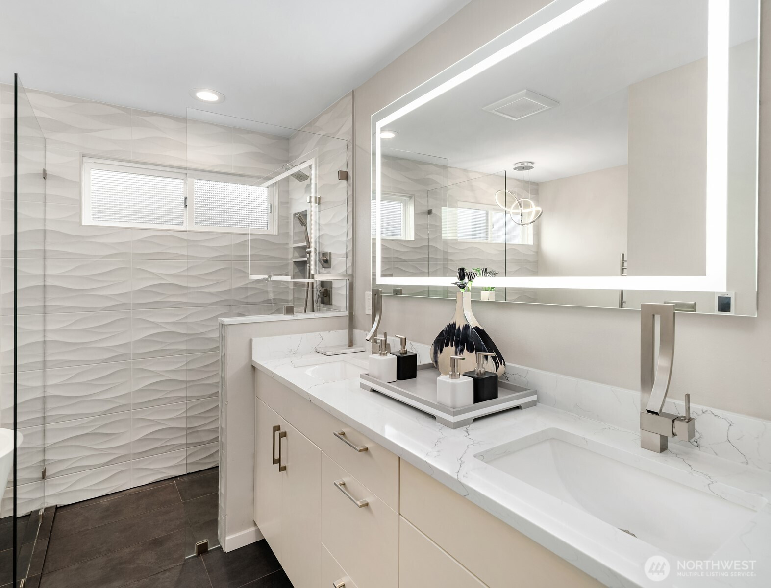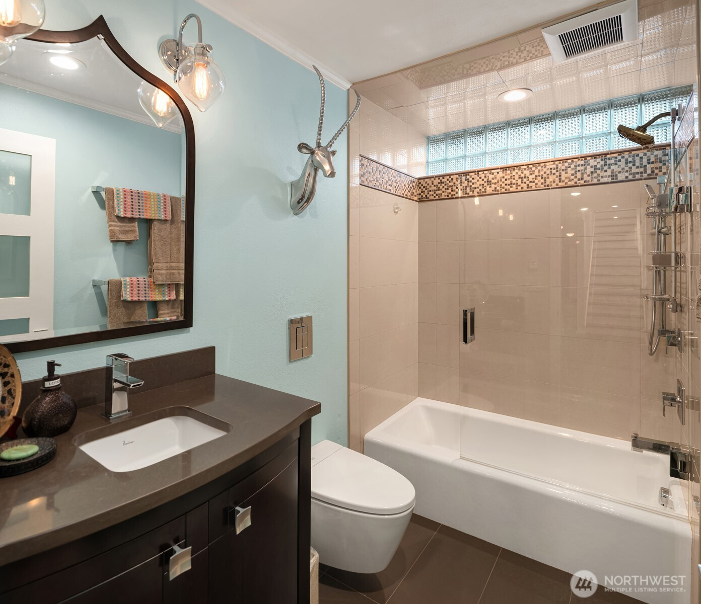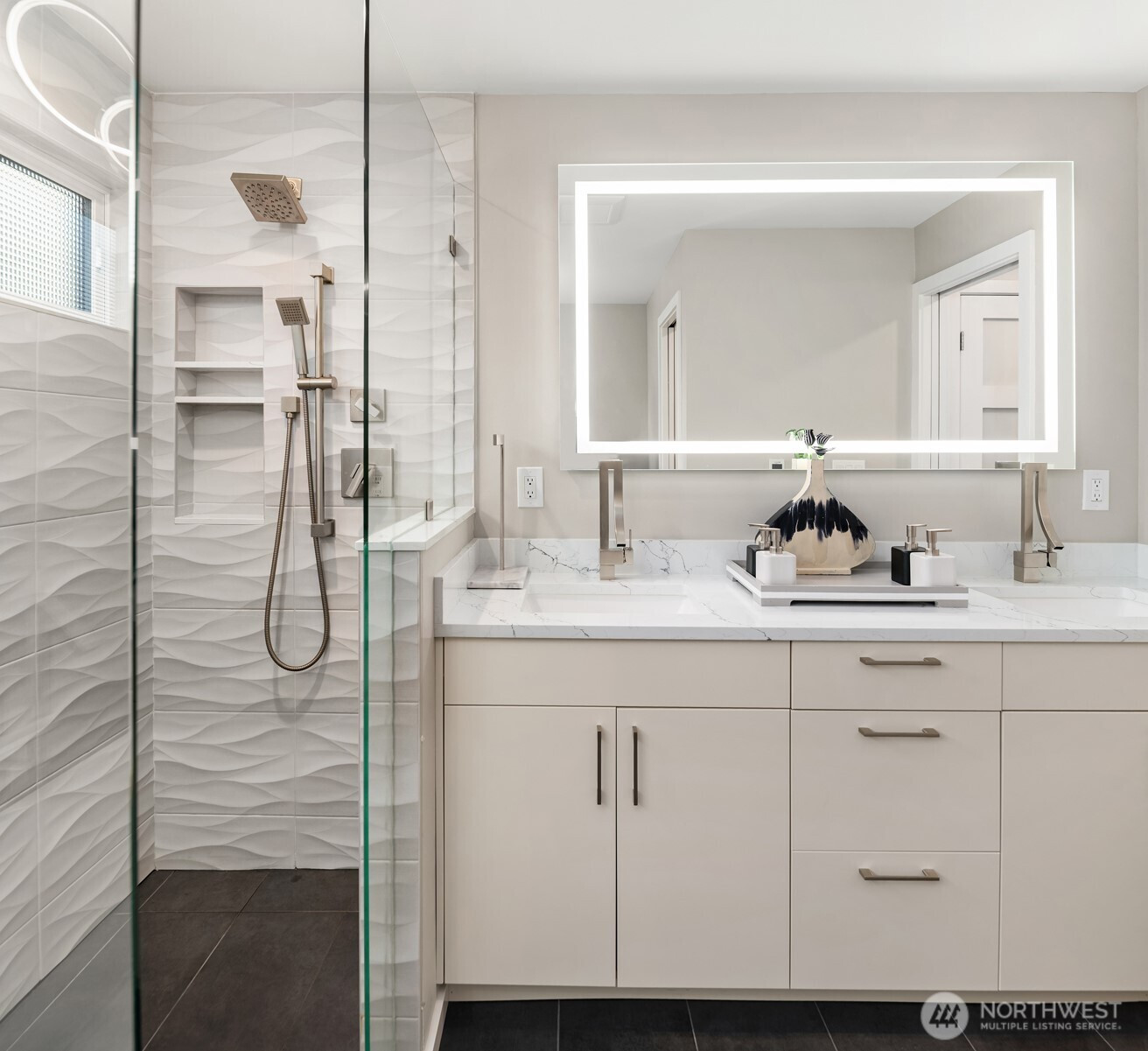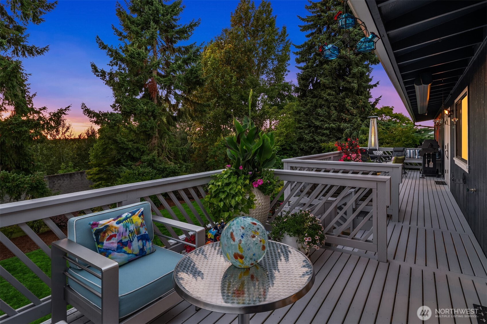 (650)533-3259This beautifully renovated daylight rambler in Bellevue’s coveted Woodridge community offers elegant living space designed for comfort and connection. The open kitchen, created by removing walls between the original kitchen and dining room, features a large island with prep sink, soft-close cabinetry, quartz countertops, pot filler, and dual-temperature wine cooler — perfect for entertaining. Vaulted ceilings seamlessly connect the kitchen to the living room and back deck for alfresco dining. The master suite includes a luxurious bath with heated floors, a bidet, and private deck access. Custom California Closets with soft-close drawers maximize storage throughout the home. The finished basement, completed in 2019, offers versatile spaces including a gym with custom closets and a guest/craft room with a queen Murphy bed. The family room boasts a new gas fireplace, built-in entertainment center, and a quartz-topped wet bar with wine storage. French doors lead to the backyard. Additional upgrades include a Navien tankless water heater (2024), heated bathroom floors, new roof, skylights, updated garage doors, double-pane windows, and modern interior finishes. Located just four blocks from Woodridge Elementary on a quiet street, this home blends modern upgrades with timeless charm in one of Bellevue’s best school districts.