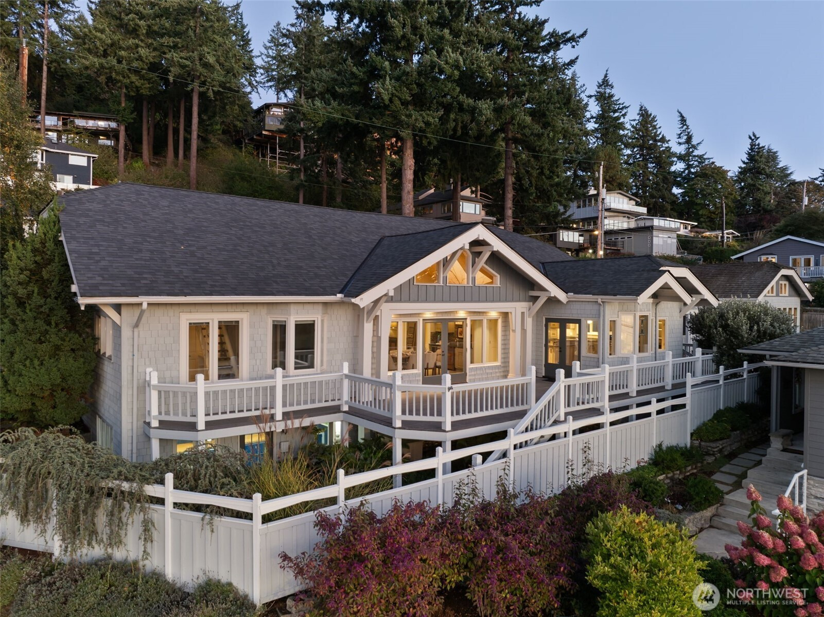 (650)533-3259Set just off Maplewild Ave, this Three Tree Point home offers breathtaking views of Puget Sound & the Olympic Mountains. A perfect blend of traditional architecture & modern design, home features beautifully updated kitchen & baths, a huge living room ideal for entertaining, tall ceilings & a bold statement fireplace. Enjoy stunning views from every west-facing room. Primary suite has a full bath, walk-in closet, & French doors that open to a private patio w/ views. Loft/ bonus room. Lower level: family room wired for surround, shop/ tool area, large laundry room w/ folding station, ample storage, & half bath. Generac Generator. Fully fenced, well-manicured yard. Detached 3-car garage w/ separate garden room & half bath. Welcome home!