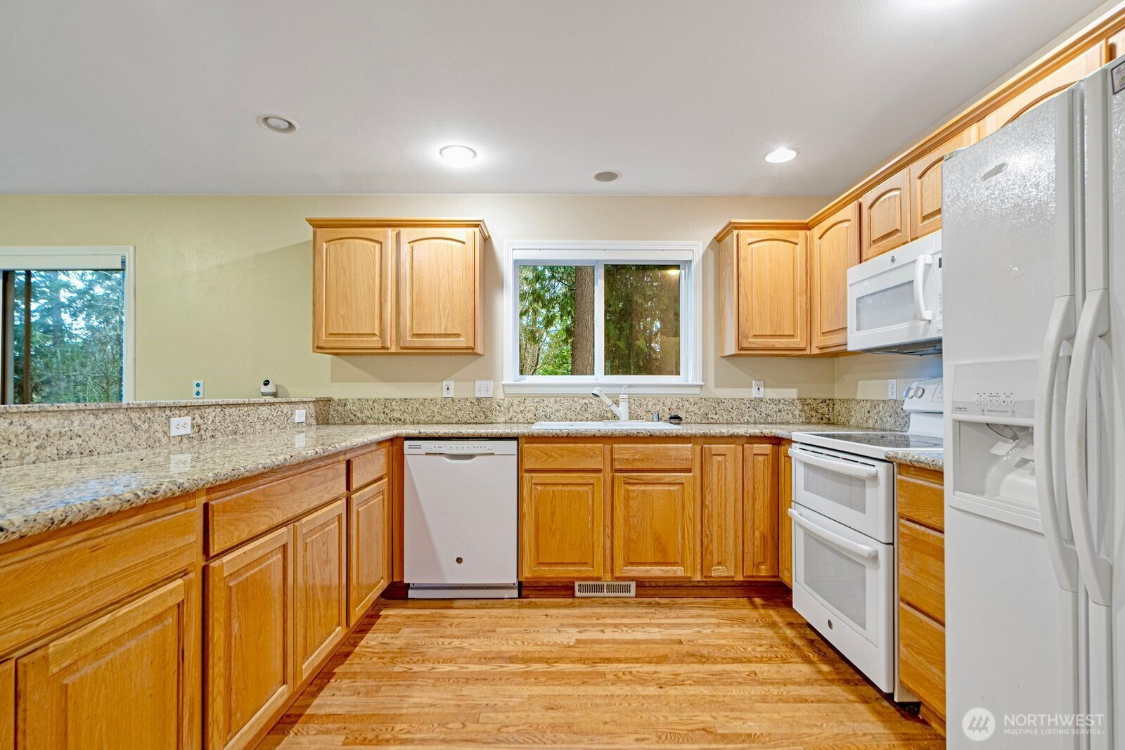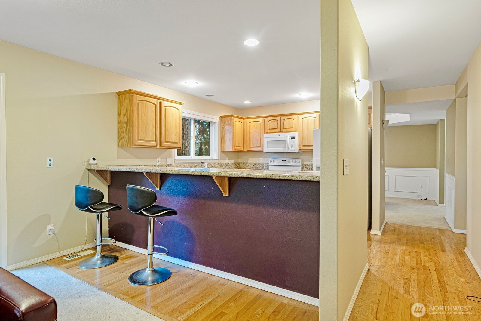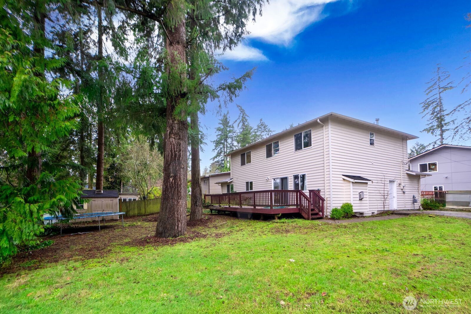 (650)533-3259Spacious two-story home featuring 4 bedrooms and 2.5 baths. Sunny home, slab granite counters, hardwoods, family rm connects to huge deck over grassy oasis. Back yard blends into a greenbelt-like setting providing privacy galore. 2 car garage, wainscotting, coffered ceilings in dining, divine master suite, forced air gas, quite private rd, parking for 8+cars, excellent Shoreline school. Walk to groceries, restaurants, schools, parks, buses.