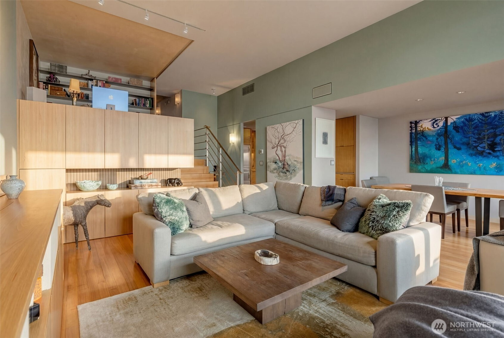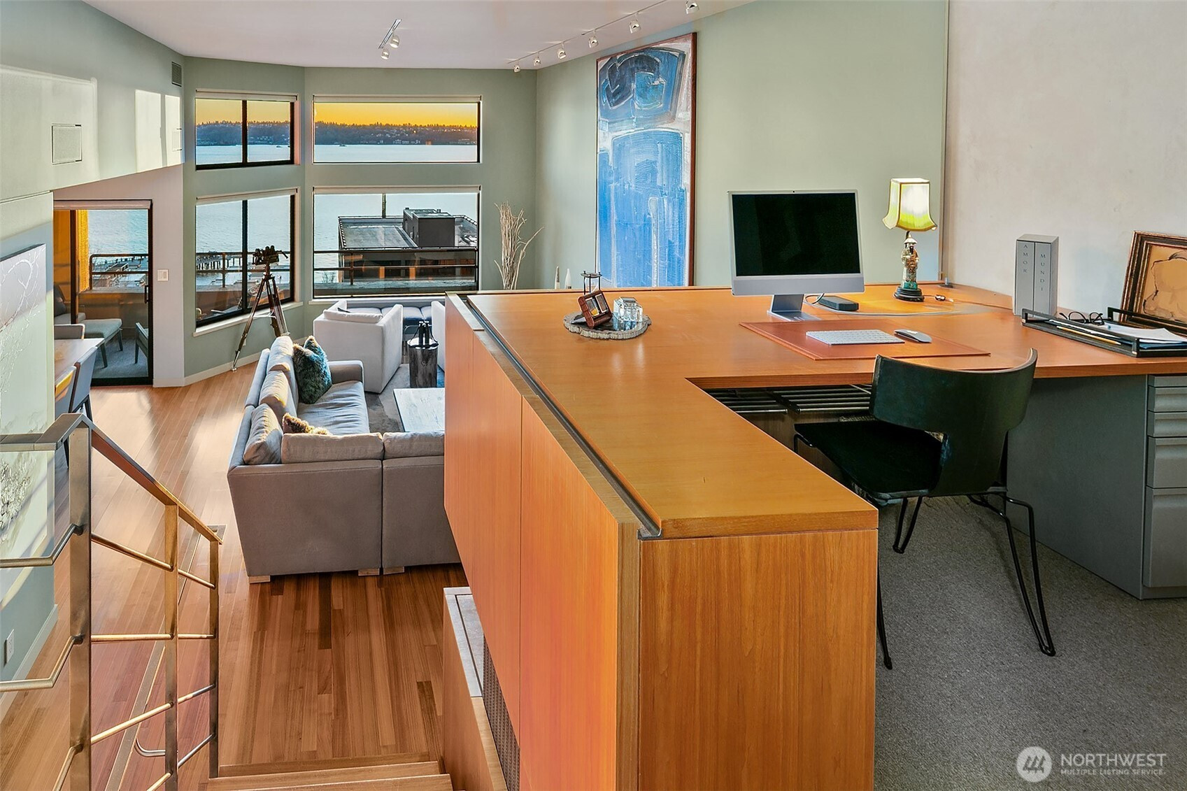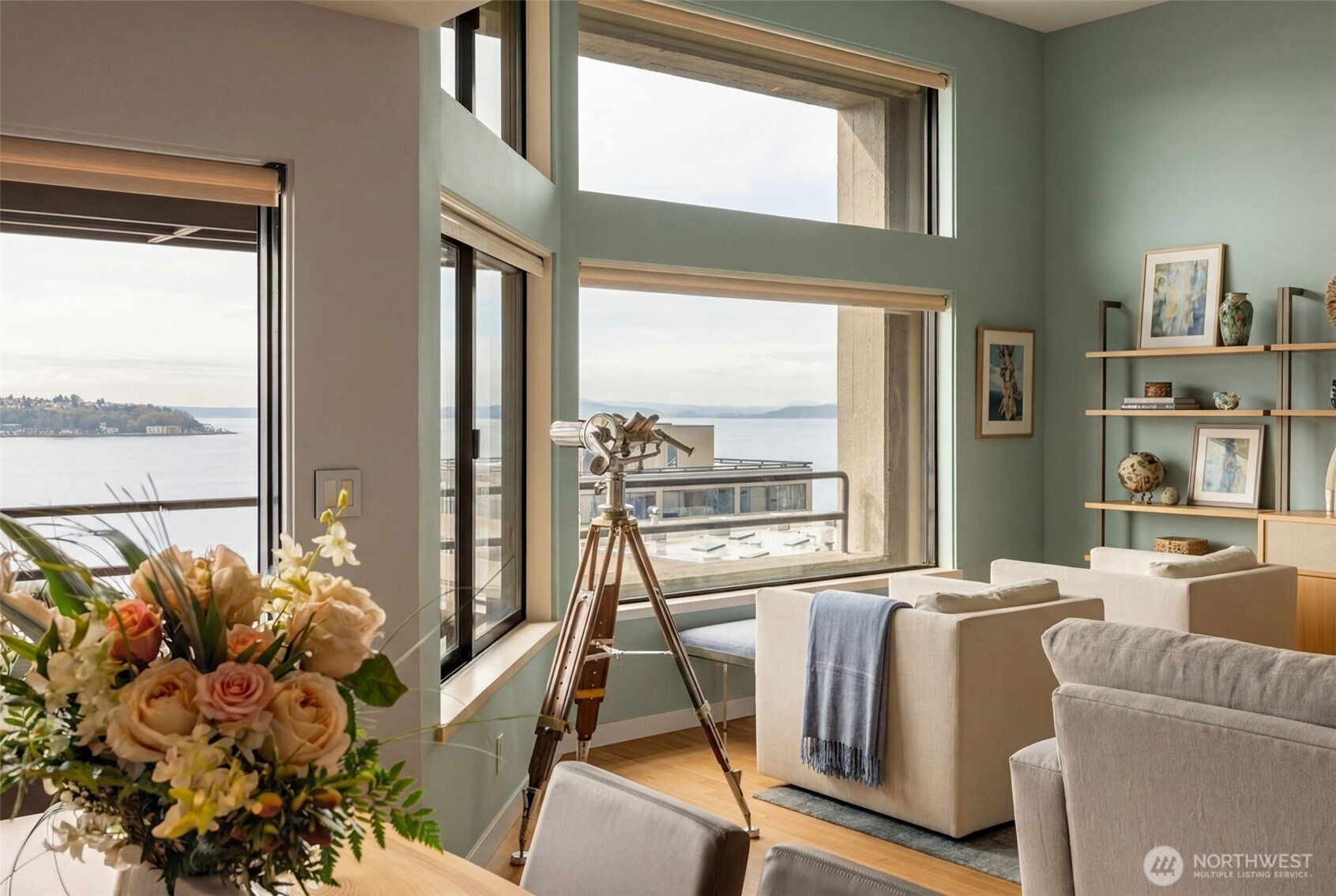 (650)533-3259This exceptional residence overlooking Pike Place Market showcases unobstructed views of Puget Sound and the Olympic Mountains, delivering spectacular sunsets and ever-changing Northwest skies. Expansive windows flood the home with natural light, seamlessly connecting refined interiors to dramatic scenery. Thoughtfully redesigned and built-out by Krekow Jennings with premium materials, the home features engineered walnut plank flooring, solid walnut stairs, and wool carpet in the bedrooms and office. Custom bleached walnut cabinetry with nickel and stainless accents enhances the kitchen, living areas, and baths, complemented by granite countertops and backsplash and a suite of Sub-Zero, Miele, Wolf, and GE appliances. Both marble-clad baths offer heated floors, stone counters, and spa-inspired finishes, while the primary suite includes heated towel bars and integrated speakers. Modern comforts include central A/C with HEPA-filtered fresh air, recessed lighting with digital controls, and powered shades. Fully wired for audio, visual, and high-speed connectivity, the home includes built-in speakers, a TV lift, custom office millwork, and future-ready conduit. Double bedroom windows and blackout drapes ensure exceptional quiet and privacy. A rare opportunity to own a meticulously crafted view home combining luxury finishes, advanced systems, and iconic Pike Place Market scenery in one remarkable residence.