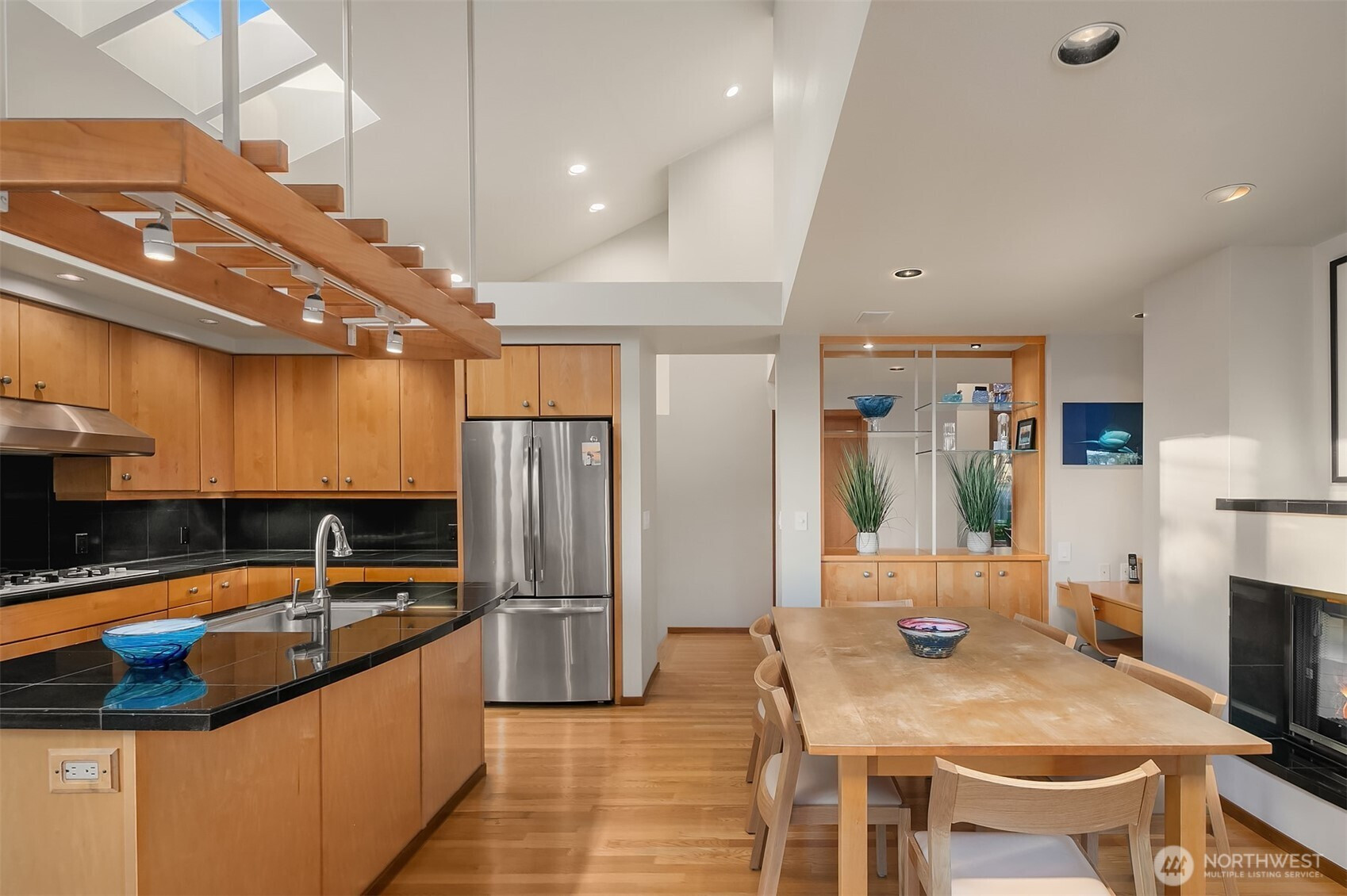 (650)533-3259Nestled in coveted Richmond Beach, this architecturally distinctive Northwest Contemporary home captures sweeping Sound and Olympic Mountain views. A light-filled, three-level design showcases dramatic vaulted ceilings, skylights, and expansive walls of windows. The open-concept layout features thoughtfully placed cutouts that preserve airy sightlines while subtly defining each space. The chef’s kitchen is appointed with sleek black granite countertops, warm maple cabinetry, a generous island, and a built-in bench—perfect for casual dining or gathering. Directional gallery lighting enhances both the home’s architectural details and display spaces, while a modern two-sided fireplace adds style and warmth. Designed for flexibility and comfort, the ideal floor plan includes two bedrooms on the main level, three upstairs, plus a den, bonus room, and rec room. Step outside to an expansive wrap-around deck crafted from exotic wood, complete with a 20-foot Sunsetter awning, perfect for enjoying stunning sunsets. The primary suite offers a private view deck, walk-in closet, and spa-inspired bath. Additional highlights include professionally landscaped grounds with drip irrigation, integrated speakers and smart home features, a Tesla charger, and a new roof installed in 2022. Ideally located just moments from Kings Schools, parks, and the beach.