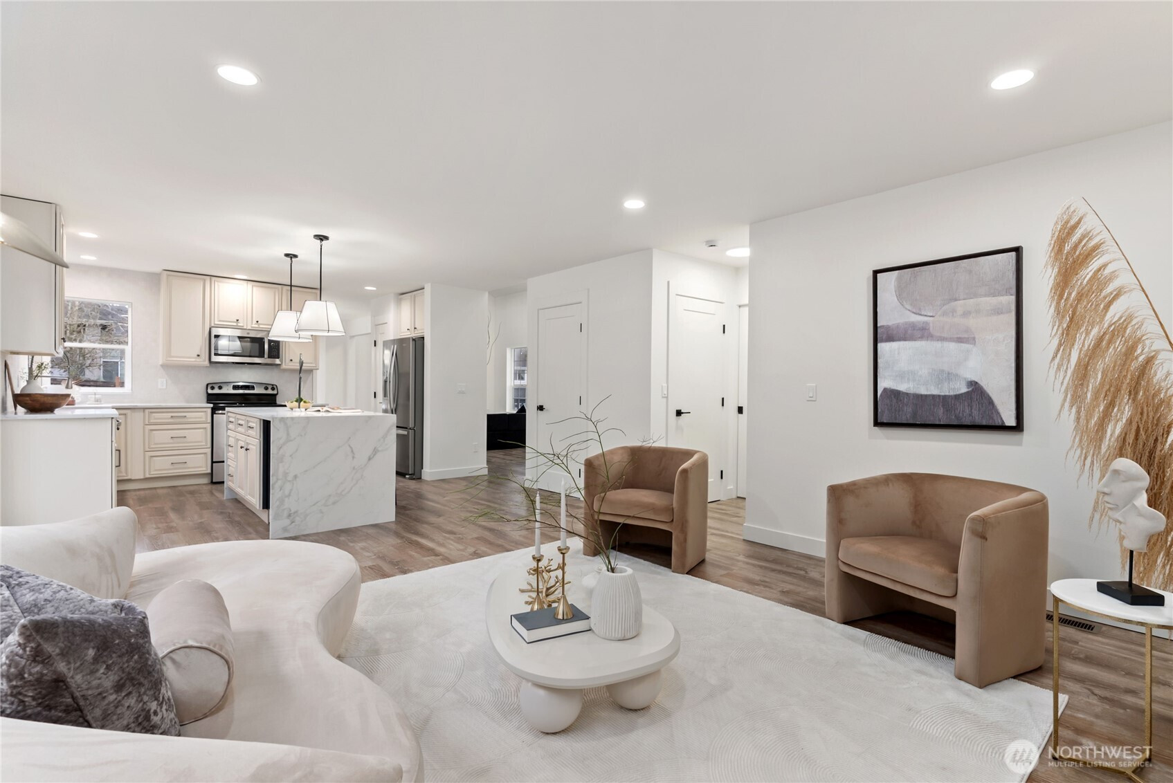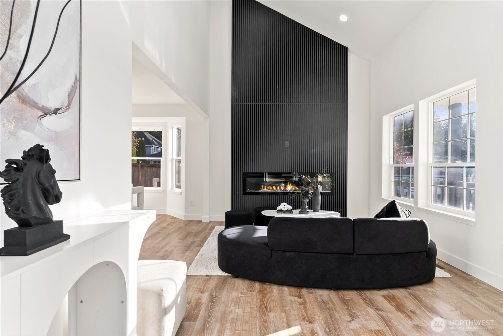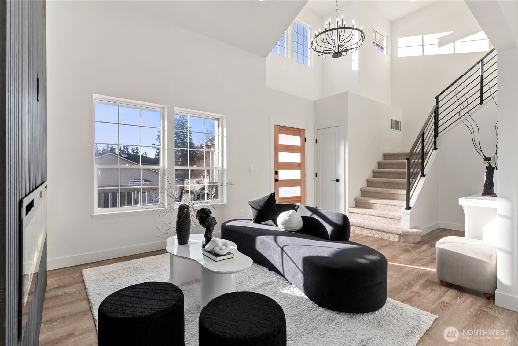 (650)533-3259Welcome to this beautifully reimagined residence in the highly sought-after Lea Hill neighborhood, where modern design meets timeless comfort. From the moment you arrive, the striking contemporary front door and covered porch create an unforgettable first impression. Inside, a dramatic living room with soaring 16-foot solarium ceilings is filled with natural light and anchored by a designer accent wall and sleek electric fireplace, creating a stunning architectural focal point. The space flows effortlessly into the dining area and a show-stopping chef’s kitchen featuring new cabinetry, quartz countertops, stainless steel appliances, a stylish backsplash with floating shelves, and an impressive island with dual waterfall edges. The open layout continues into the inviting family room with a cozy gas fireplace, designer accent lighting, and a custom plaster feature wall. A powder room and spacious laundry room complete the main level. Upstairs, plush new carpeting and a custom iron railing lead to two generous bedrooms connected by a Jack-and-Jill bath. The luxurious primary retreat offers vaulted ceilings, a designer accent wall, a spa-inspired 5-piece ensuite with elegant vanities, statement mirrors and lighting, a large walk-in closet, and A/C for year-round comfort. Situated on a fully fenced prime corner lot with a firepit and rare 3-car garage, this exceptional Lea Hill home delivers elevated Pacific Northwest living.