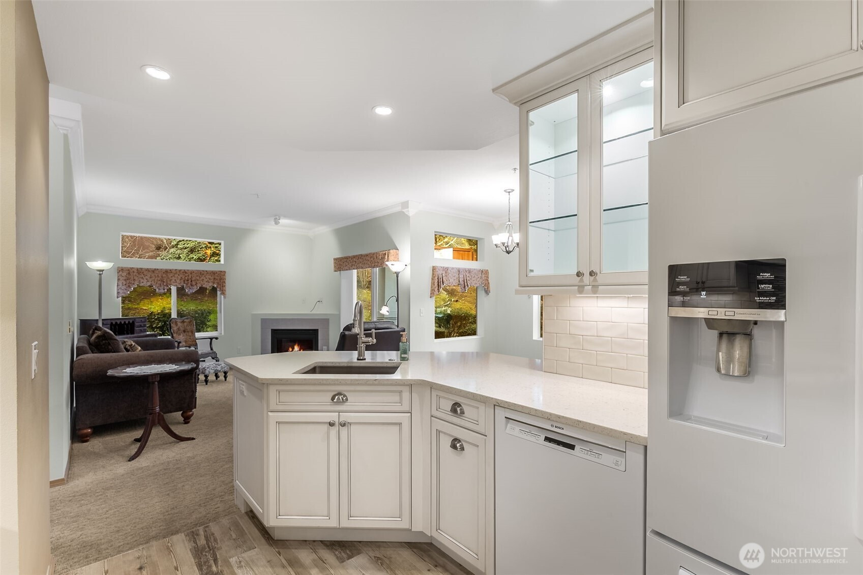 (650)533-3259Updated condo tucked against a wooded backdrop for added privacy | Covered patio overlooks trees & greenery, creating a peaceful outdoor retreat | Private sidewalk from guest parking leads directly to the front door for easy access | Cozy gas fireplace anchors the living space, enhanced by crown molding for a finished feel | Kitchen features glass-front cabinetry w/ interior lighting, adding character & warmth | Both bedroom closets include custom closet systems for smart organization | Spacious walk-in tile shower w/ bench & double shower heads offers a spa-like experience | Rare 1-car garage plus ample guest parking | Located near parks, trails & everyday conveniences in a highly desirable Kent area.