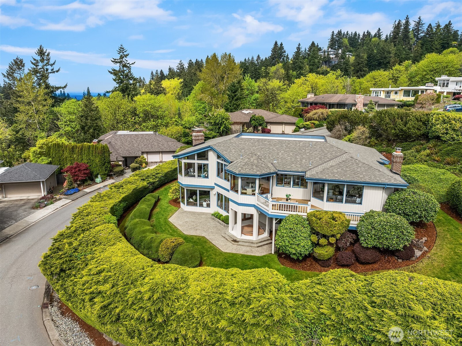(650)533-3259Perfectly positioned on a corner lot in Somerset, this refreshed Northwest Contemporary home offers enviable privacy, abundant natural light, and sweeping views of the Olympics, Seattle skyline, Puget Sound, and Lake Washington. Vaulted ceilings and expansive windows bring the outdoors in, providing amazing vistas at any time of day or night. Designed both for everyday comfort and effortless entertaining, the main level features inviting gathering spaces, including a family room and a kitchen with casual dining that enjoy the views, along with formal living and dining rooms that do the same. Warm wood detailing along the vaulted ceilings enhances the home’s distinctive style. A generous main floor primary suite captures a lovely outlook, while an additional bedroom / office adds flexibility. Downstairs, two additional bedrooms, a bonus room, and a den provide versatile spaces to live, work, and unwind. New interior paint and carpet complement the home’s timeless architectural appeal. Set on a manicured 13,417 square foot lot in the desirable Forest Highlands community, this home presents a rare opportunity to enjoy signature views, top Bellevue schools, and a coveted Somerset setting.