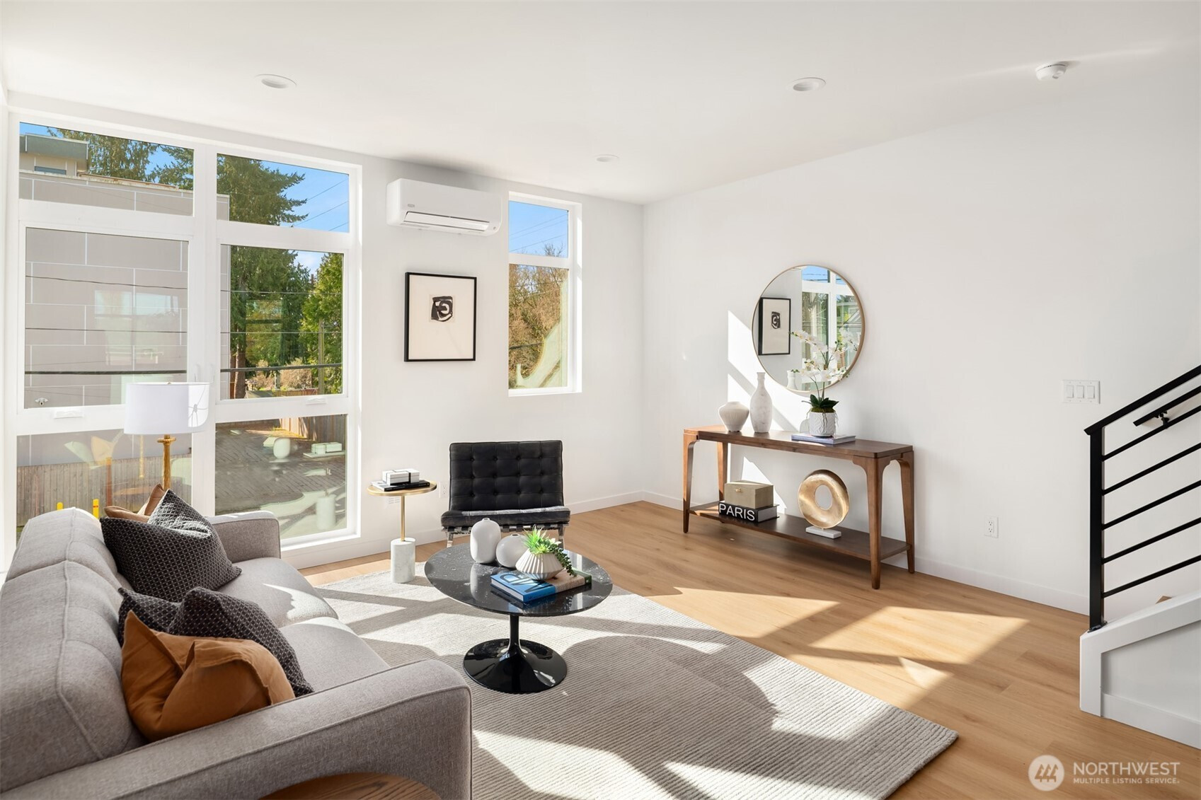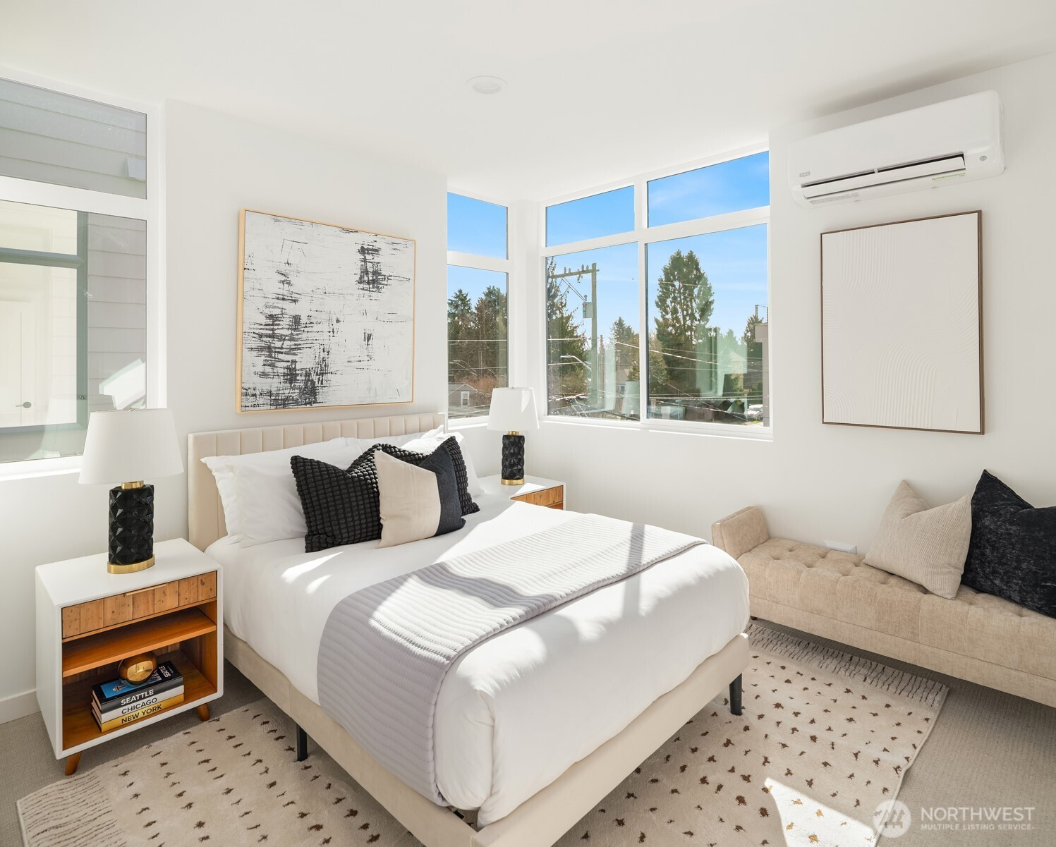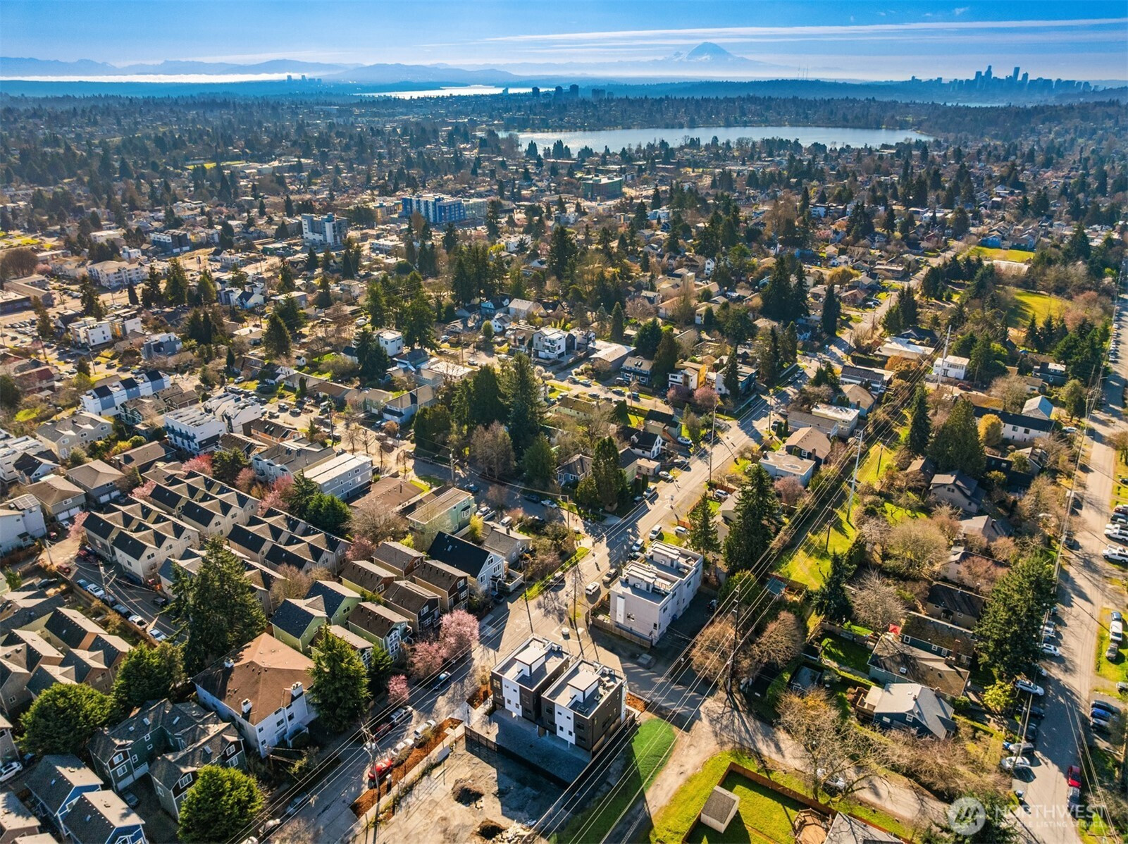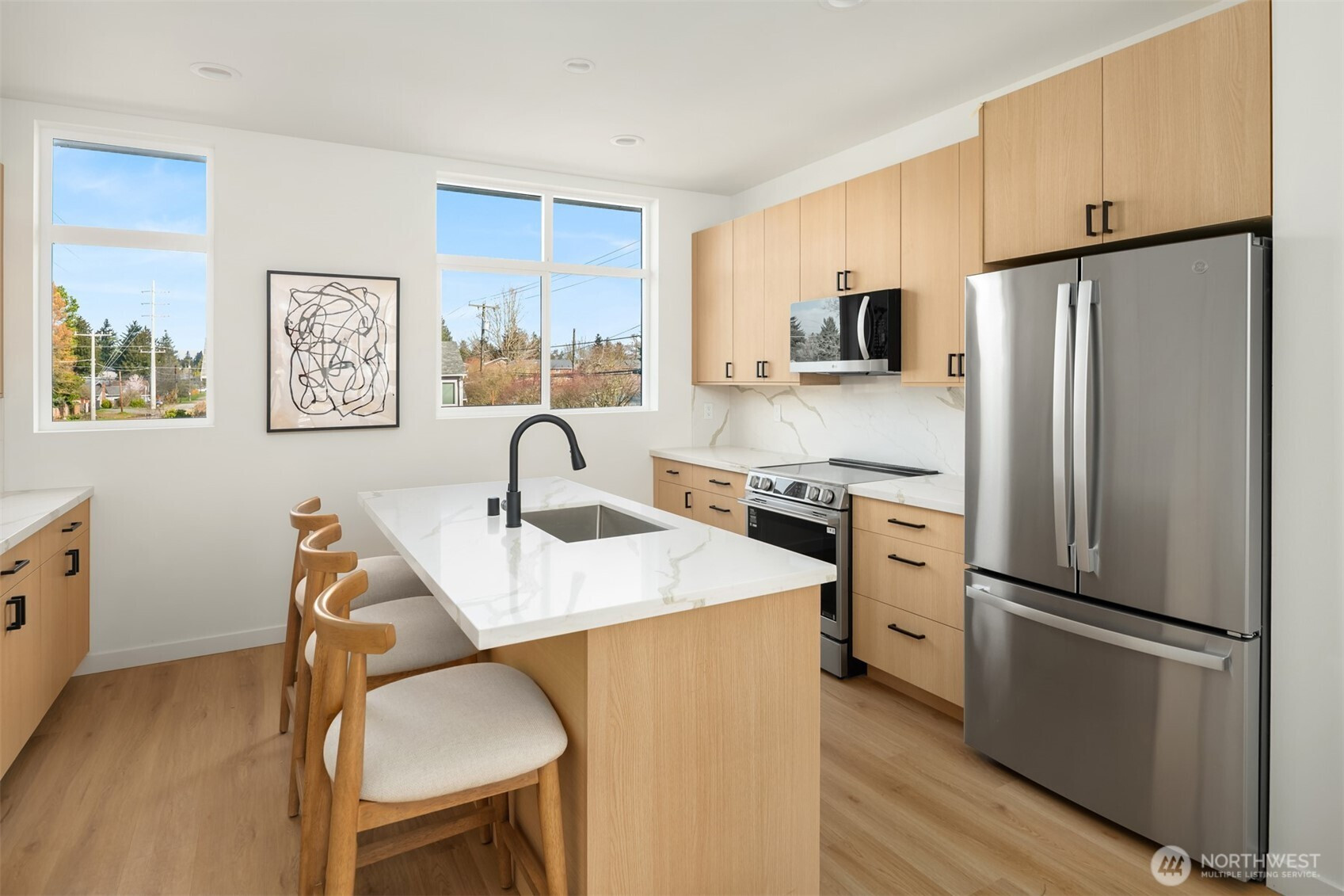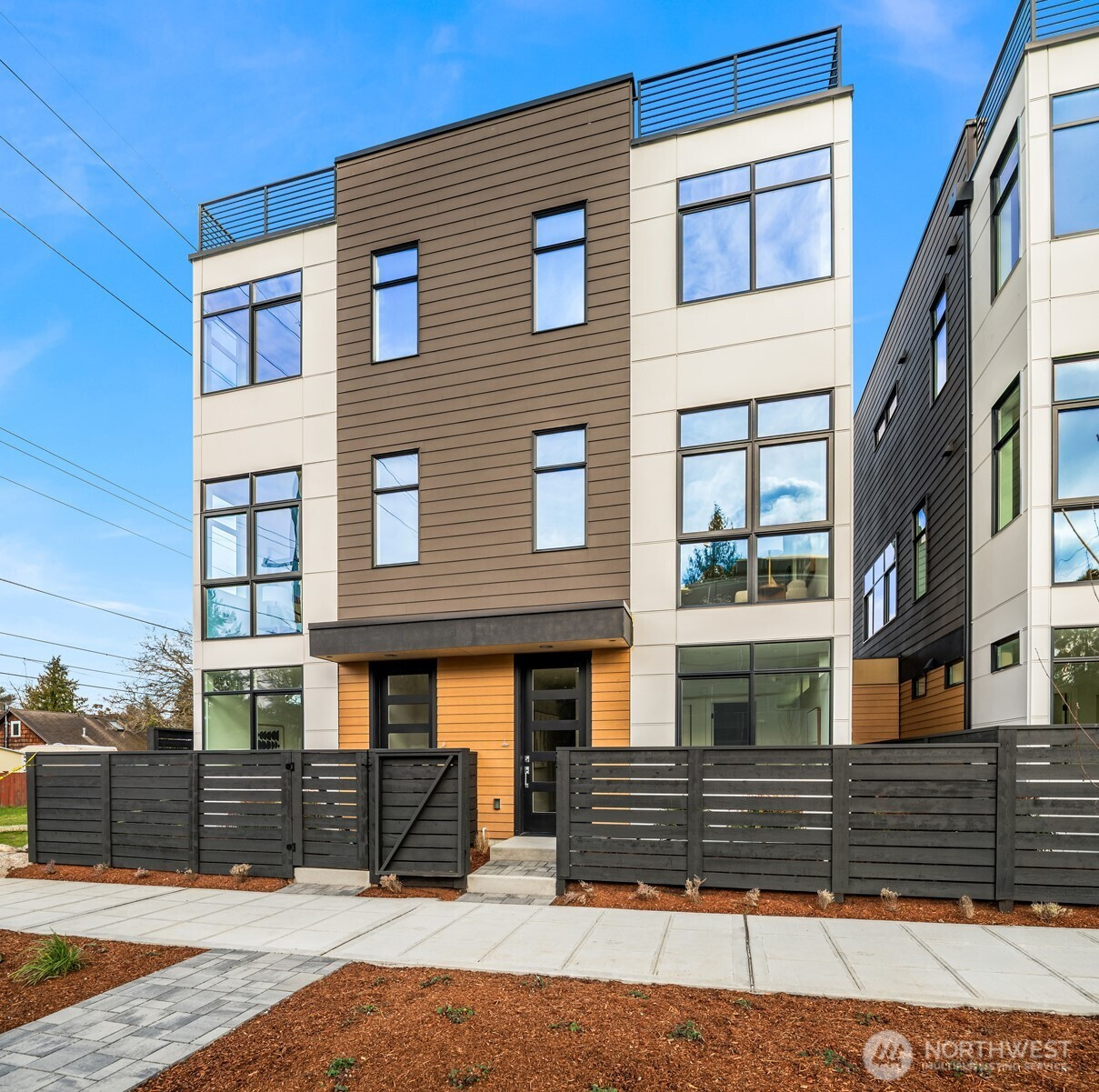 (650)533-3259Thoughtfully crafted new home in dynamic Greenwood neighborhood. Innovative three-level layout also features rooftop deck with amazing Cascades + urban views. Main living floor is exceptionally bright with expansive windows, high ceilings + south-facing orientation. Kitchen is beautifully appointed with premier fixtures + finishes, including stainless appliances, quartz counters/backsplash + large island. Upstairs are two bedrooms, including luxurious primary with ensuite bath + walk-in closet. Private guest bedroom suite on first level. Attached carport offers convenience with storage + EV charging. Efficient mini-split heating/cooling. Eclectic dining, cafes + gourmet groceries are nearby.