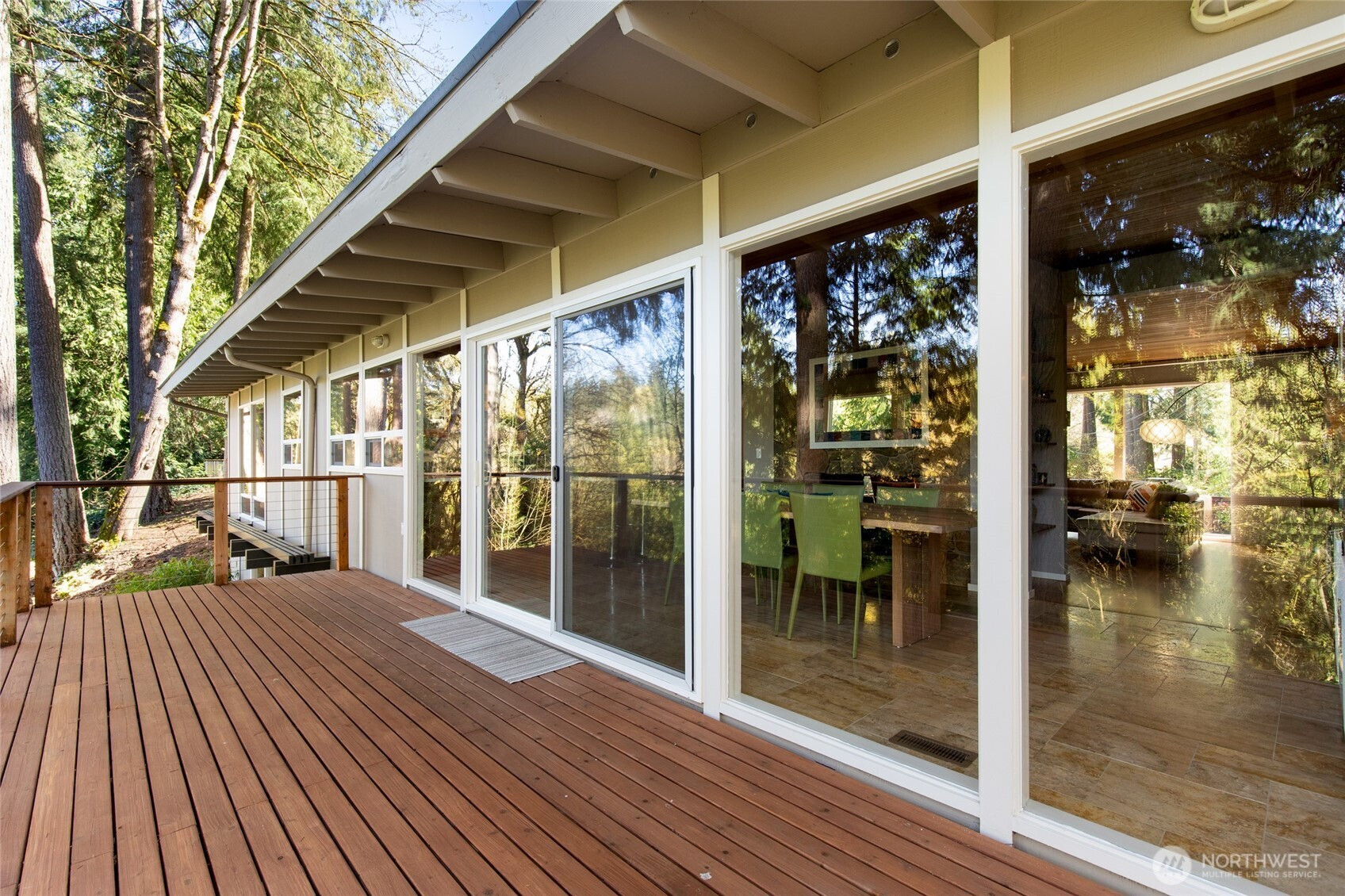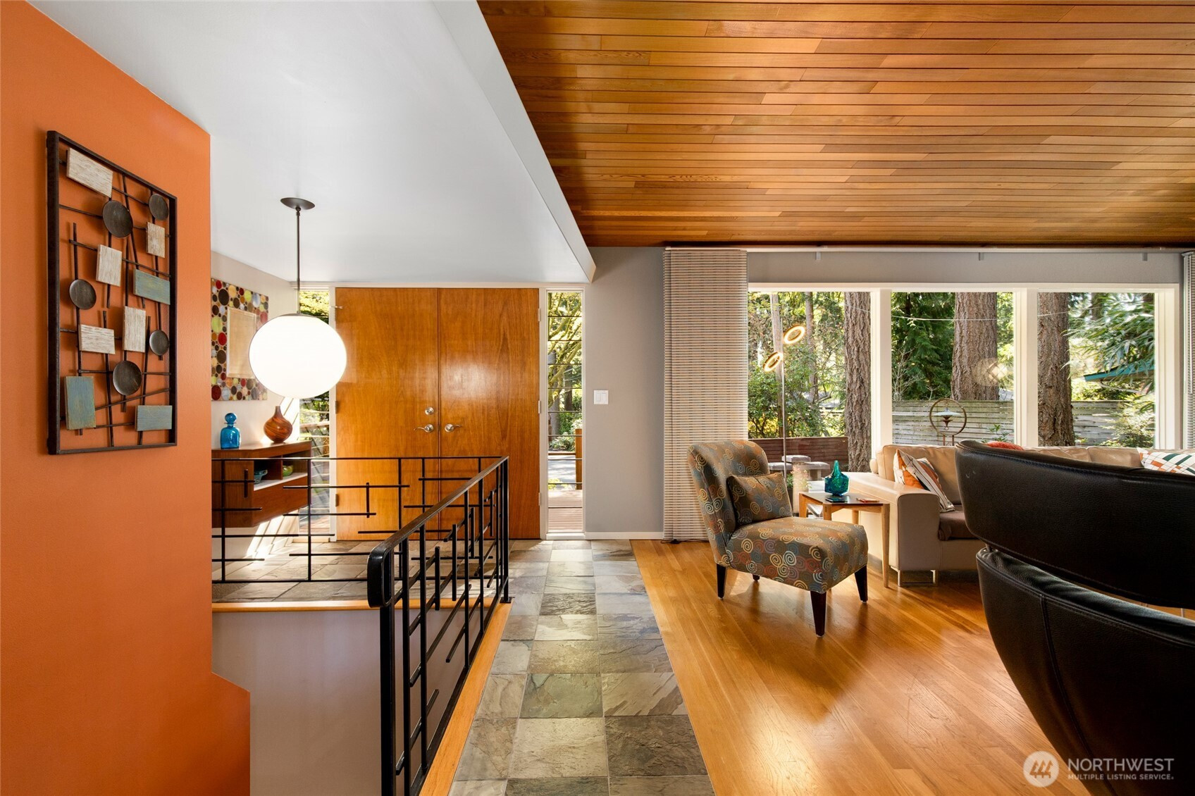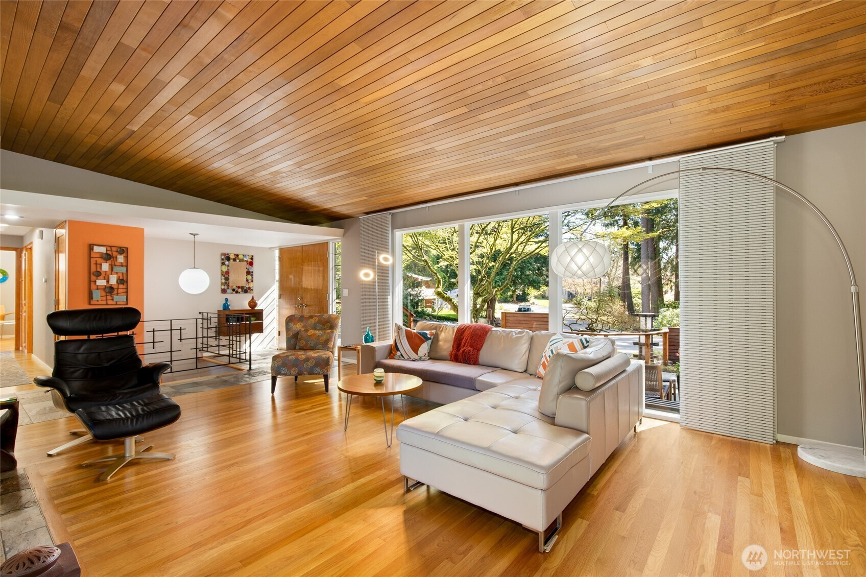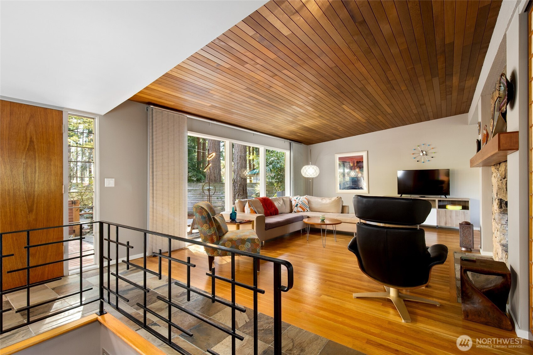 (650)533-3259Beautifully updated mid-century modern home backing to a serene greenbelt with stunning territorial views. The main level features an open-concept floor plan with hardwood floors, travertine tile, and a two-sided gas fireplace. The light fixture in the entry is original to the house. The modern kitchen offers quartz countertops and flows seamlessly into the dining area with access to the deck—ideal for indoor-outdoor living. The main-level primary suite includes an en-suite bath for convenient main-floor living. The lower level includes a spacious bonus room with access to a second deck, an additional bedroom, full bath, and laundry area—providing flexible living options. Additional highlights include expansive floor-to-ceiling windows, updated bathrooms, new interior doors, and a garage with epoxy flooring and workbench. Cedar decks with cable railing invite you to relax and enjoy the surrounding natural setting. Conveniently located near parks, trails, and amenities, with easy access to major commuting routes and highly rated Lake Washington schools.