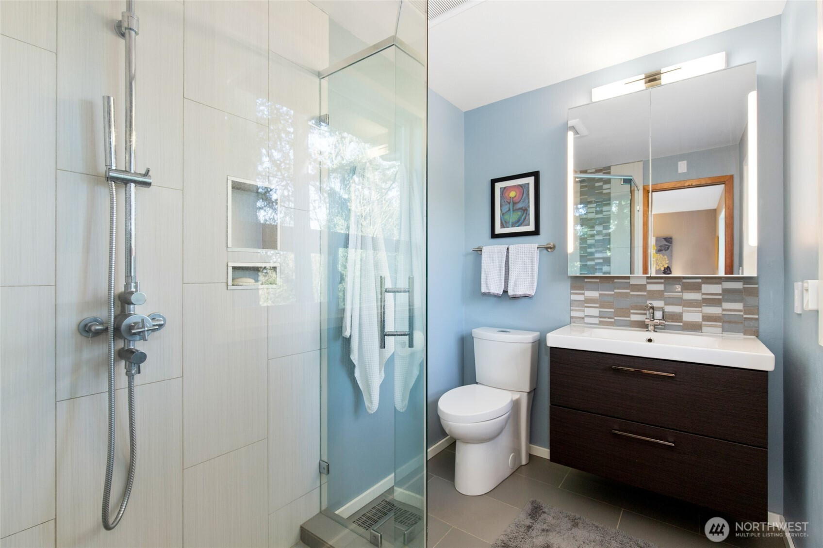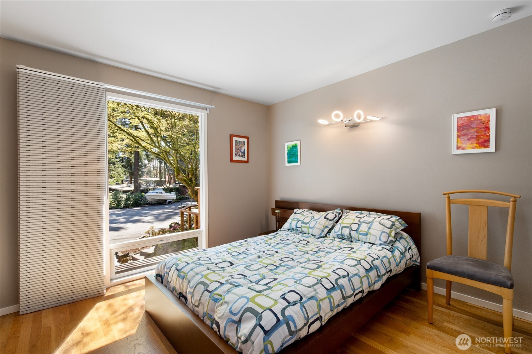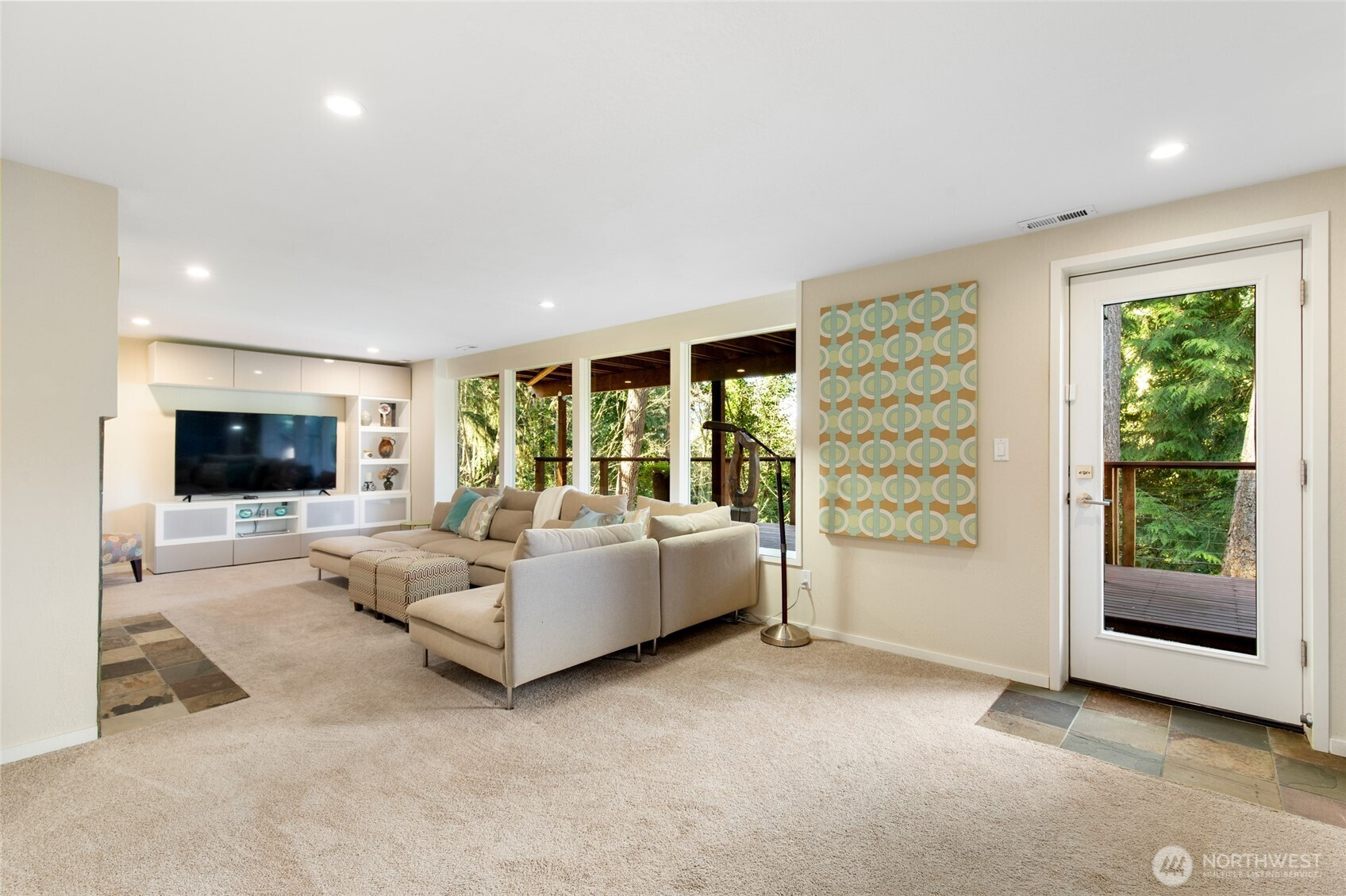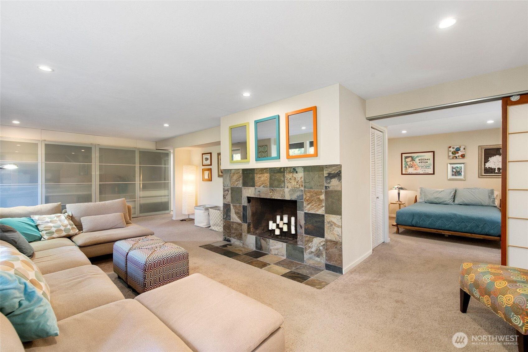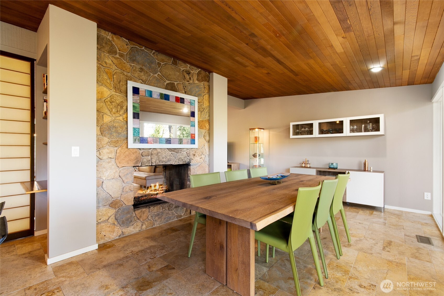 (650)533-3259Beautifully updated mid-century modern home backing to a serene greenbelt with stunning territorial views. The main level features an open-concept floor plan with hardwood floors, travertine tile, and a two-sided gas fireplace. The light fixture in the entry is original to the house. The modern kitchen offers quartz countertops and flows seamlessly into the dining area with access to the deck—ideal for indoor-outdoor living. The main-level primary suite includes an en-suite bath for convenient main-floor living. The lower level includes a spacious bonus room with access to a second deck, an additional bedroom, full bath, and laundry area—providing flexible living options. Additional highlights include expansive floor-to-ceiling windows, updated bathrooms, new interior doors, and a garage with epoxy flooring and workbench. Cedar decks with cable railing invite you to relax and enjoy the surrounding natural setting. Conveniently located near parks, trails, and amenities, with easy access to major commuting routes and highly rated Lake Washington schools.
