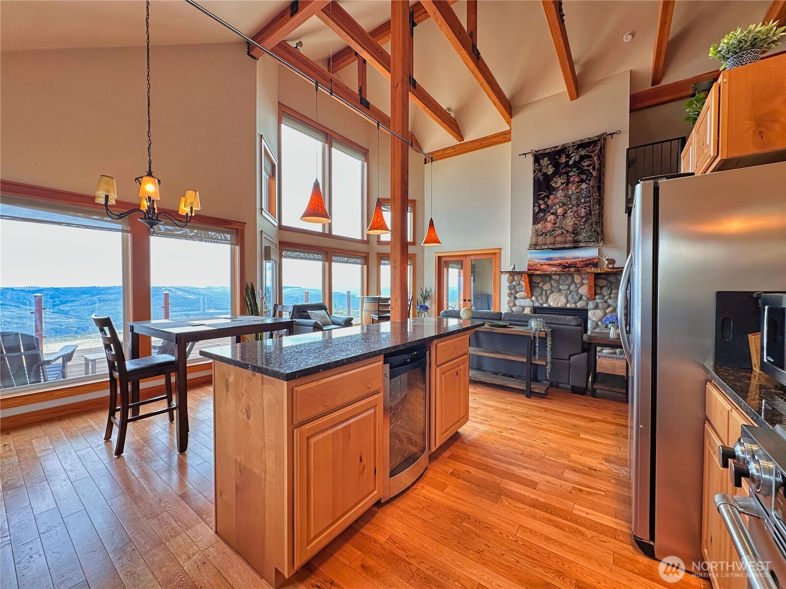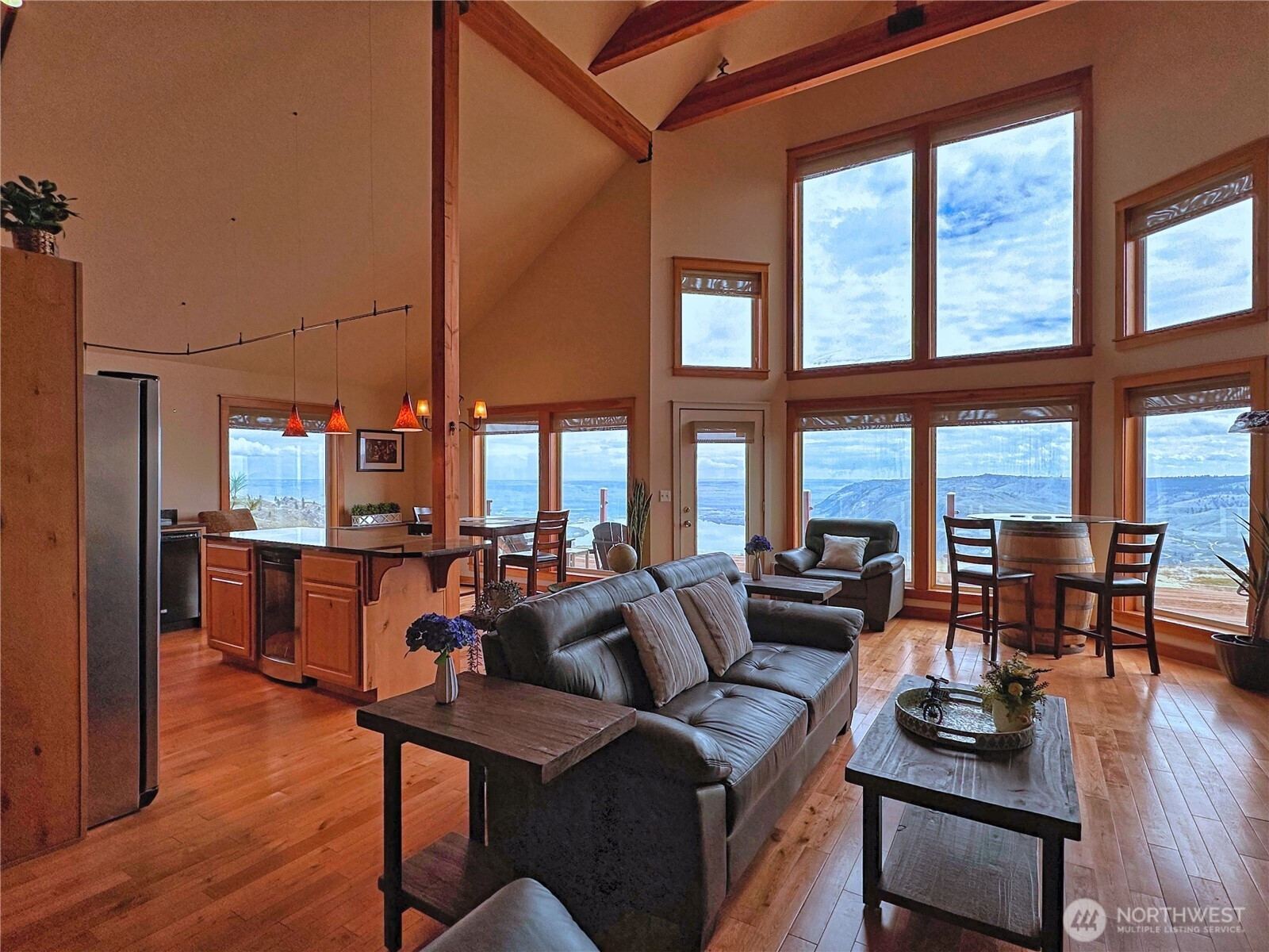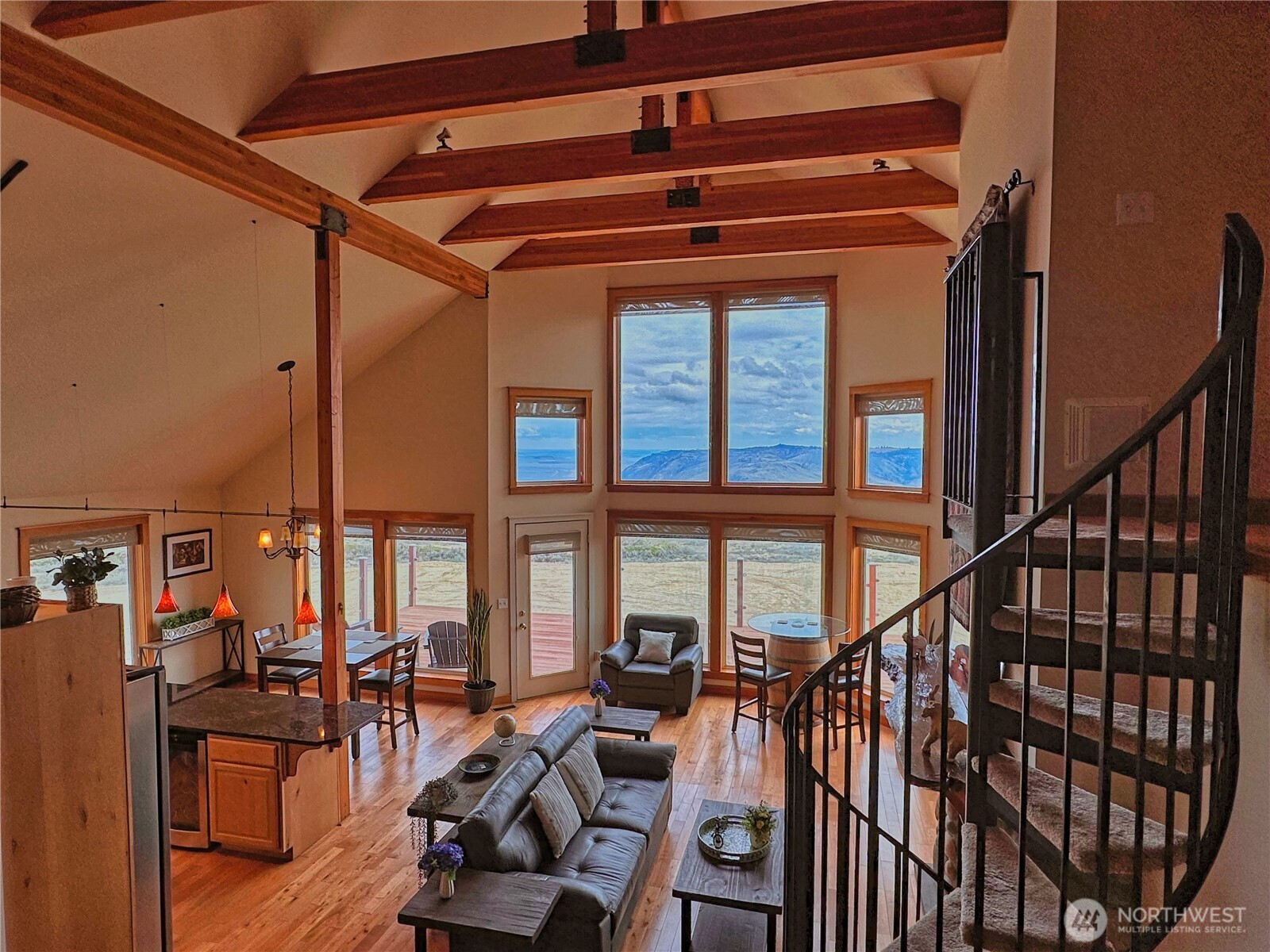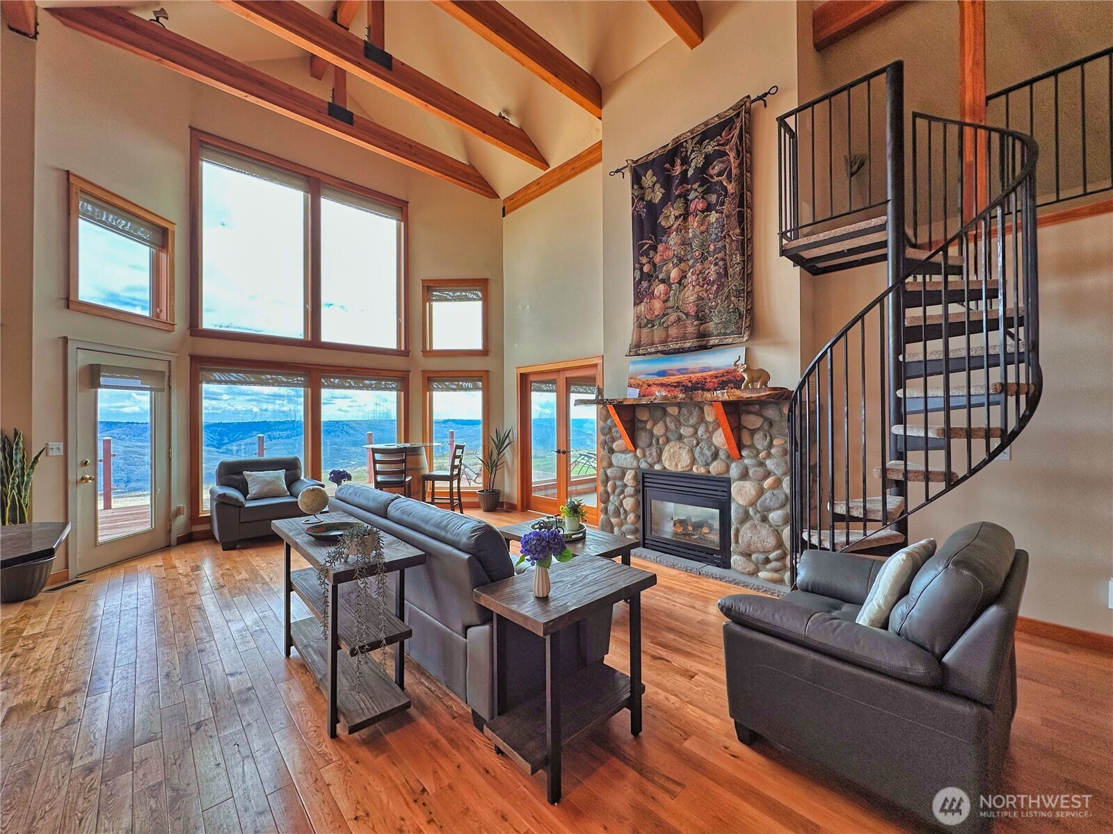 (650)533-3259Experience refined mountain living on 7 private acres with sweeping panoramic views from the Columbia River to the Cascades. This impressive 4-bedroom, 2.5-bath estate blends rustic elegance with modern comfort, showcasing soaring ceilings, exposed wood beams and expansive picture windows that flood the home with natural light. Rich wood flooring anchored by dramatic floor-to-ceiling rock fireplace shared between the living room and the tranquil primary suite. Striking wrought-iron spiral staircase leads to upper loft—perfect for guest overflow or a quiet place to unwind above the great room. The kitchen is designed to inspire, complete with a gas range, stainless steel appliances, granite countertops, and a built-in wine refrigerator—ideal for entertaining or everyday culinary enjoyment. Designed for both relaxation and recreation, the home offers a spacious rec room with hot tub, the outdoor sauna with shower and expansive deck provide the perfect setting to take in endless views. Lower-level 3-bay garage features dedicated workshop area, wine cellar and abundant storage space, offering flexibility and utility. Additional highlights include a full-home generator, private well, 4-bed septic system, and buried 1,000-gallon propane tank, ensuring comfort and reliability in this retreat. Close to DNR land offering easy access to hiking, wildlife, and outdoor adventure, 30 minutes to the award-winning Gamble Sands Resort for golf enthusiasts and 30 miles to Chelan wineries.