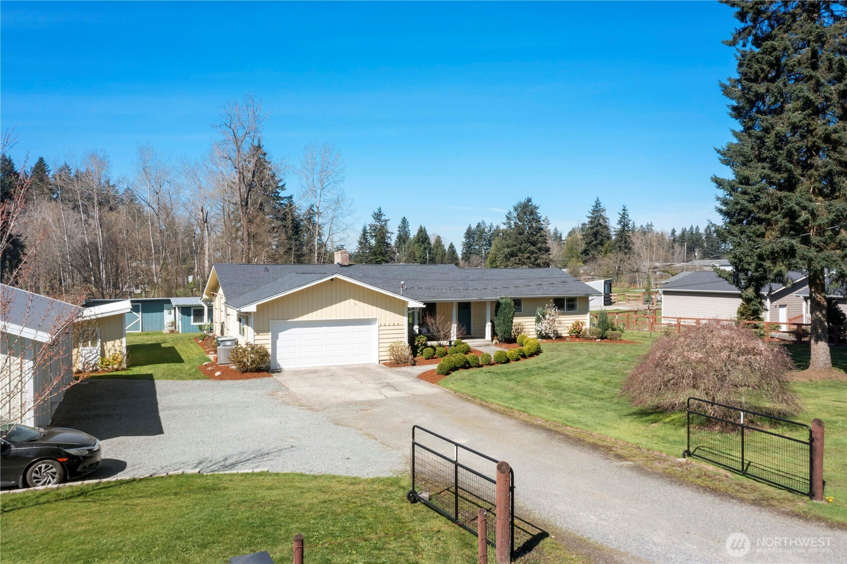 (650)533-3259Dreaming of a mini-farm without giving up convenience? This beautifully updated rambler on 2.5 acres delivers. The home features three bedrooms and one bath in the main space, plus a flexible back area perfect for a MIL suite, office, or extra bedroom with its own ¾ bath. Custom built-ins, warm woodwork, and a cozy fireplace insert add charm throughout. Outside, the fully fenced and gated property includes pasture areas, a barn with an animal stall and chicken-coop potential, an insulated hobby room with power, and a newer three-car shop with electric door openers. Raised garden beds, multiple outbuildings, and a large covered deck make it ideal for entertaining, hobbies, and homesteading. All this with a Heat pump and no HOA. (Inspection completed.)