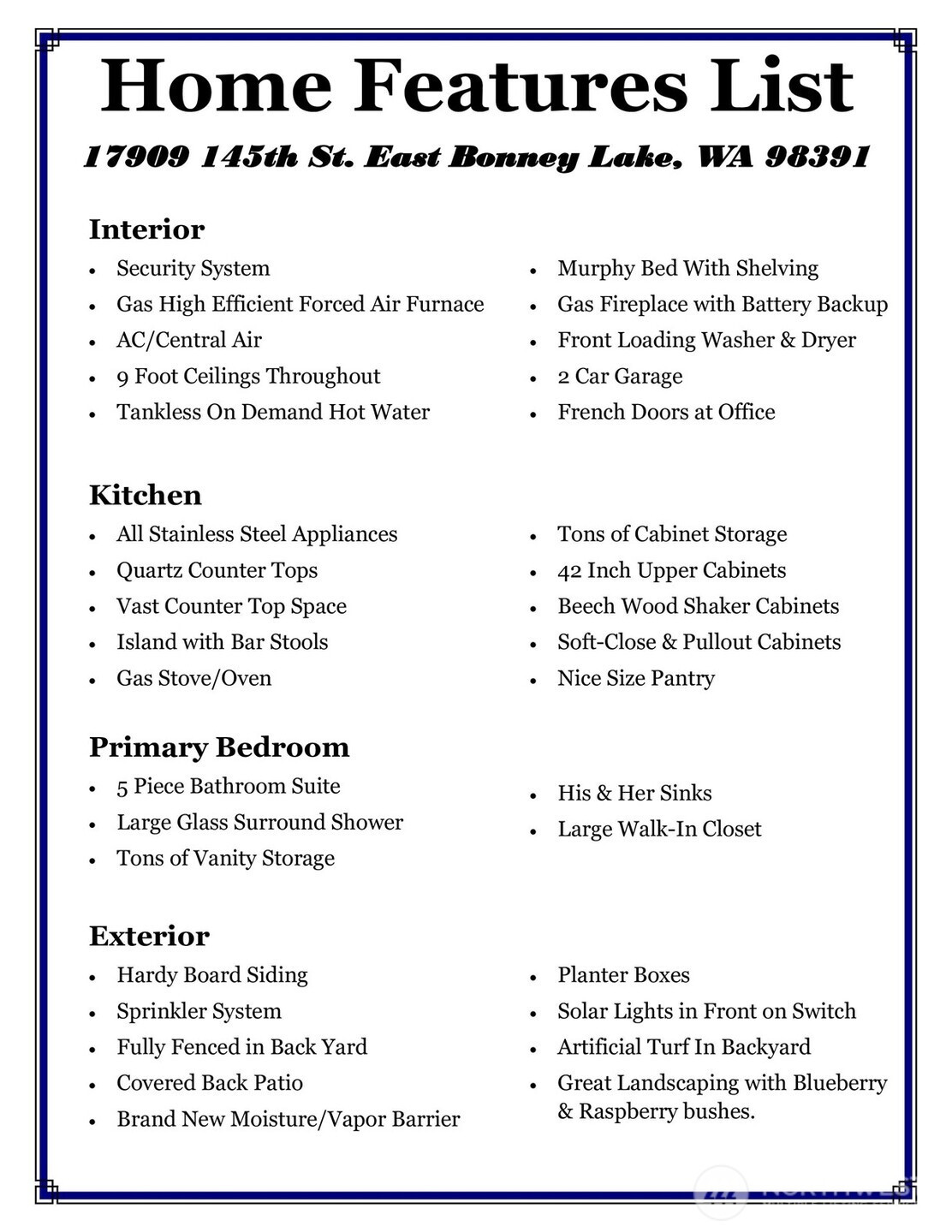 (650)533-3259Resort style living at Trilogy in Tehaleh! This 2 bed + Den Whidbey floor plan in the desired 55+ Community has everything to live your best life. Enjoy a social & active lifestyle w/ an abundance of resort style amenities - swimming pool, sport court, gym, community clubhouse, 40+ miles of walking trails, private dining establishment, & much more. Kitchen shines w/ Quartz Counter Tops, Beech Wood Shaker Cabinets, ALL SS Appliances, Gas Stove/Oven, vast counter space, Lg Pantry, & spacious island w/ bar stools. Primary Suite complete w/ Walk-In Closet, glass surround shower, and His & Her sinks. Step out to the covered patio backed to green belt w/ fully fenced in back yard, beautiful landscaping, no hassle turf grass, & raised garden beds.