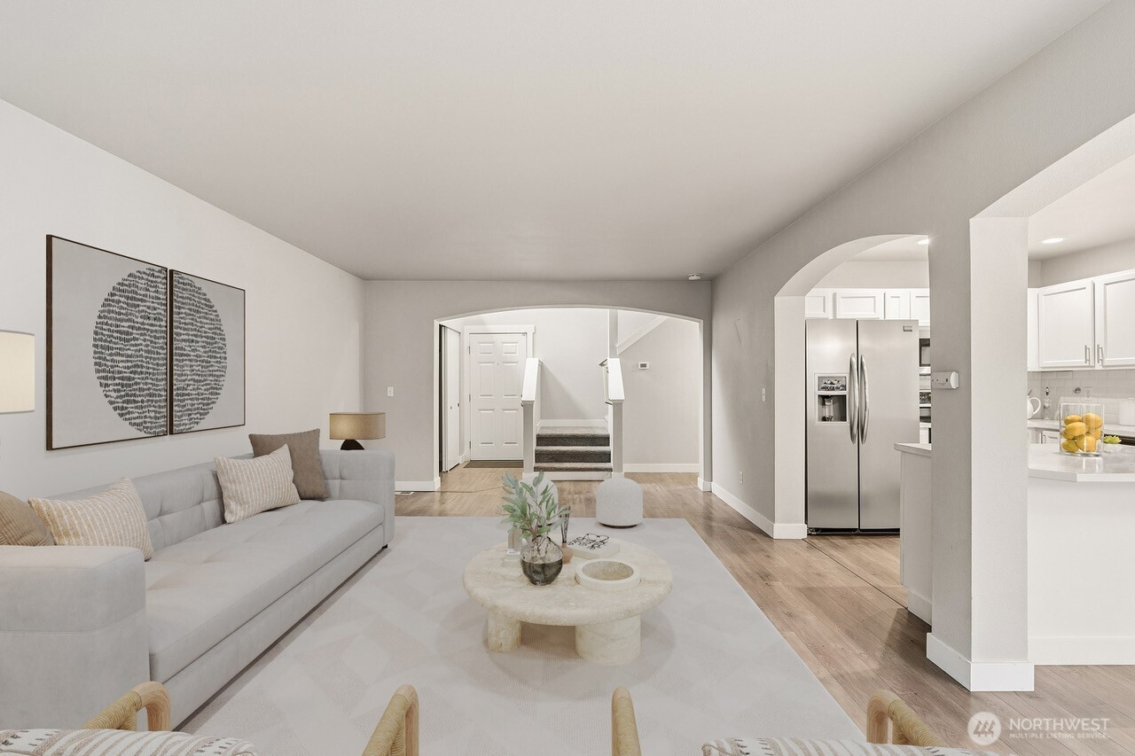 (650)533-3259Welcome to this turn-key home in the desirable Hanson’s Estates community. Step into the inviting foyer with soaring two-story ceiling and a large picture window for beautiful illuminating natural light. Gleaming laminate hardwood flooring extends throughout the open concept great room that blends the living, dining and kitchen for easy seamless hosting and entertainment. Spacious and functional kitchen with a center island with storage space, shaker cabinetry, stainless refrigerator + oven range, newer 2022 stainless microwave and full-height tiled backsplash. New plush carpets, new slider door, new living room window, newer 2023 water heater, newer faucets & fixtures throughout home. Main floor powder room and utility room with newer 2022 full-sized washer/dryer set. Upstairs is a flexible loft area, versatile as a WFH space, entertainment center or reading nook. Spacious primary bedroom with ensuite 5-piece primary bathroom boasts dual vanity sinks, tiled surround soaking tub, step-in shower, convenient separate lavatory and oversized walk-in closet with a picture window. Two additional sizable bedrooms + full guest bathroom finish out the upstairs. Nestled in a quiet well-maintained neighborhood with an athletic court, playground and dog park for your furry best friends. Centrally located near JBLM, shopping and dining hubs.