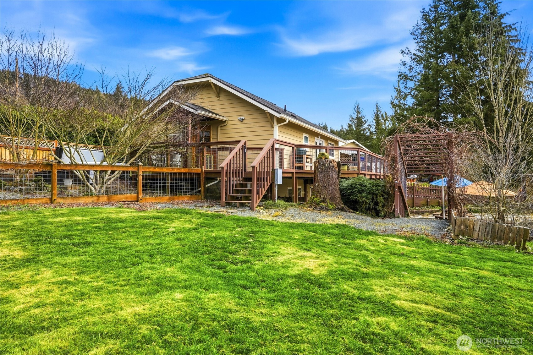 (650)533-3259Welcome to 5 acres of peaceful country living—ready for you and your horses. Tucked down a quiet country lane, this thoughtfully designed equestrian retreat blends comfort, charm, and functionality. Bring your trailer, unload, and settle in. The 4-stall barn opens to long gently sloped paddocks with good drainage and multiple pastures for easy grazing rotation, and is equipped with rubber mats, upgraded lighting & remotes that control from the house, tack room, covered hay storage, cross ties, and 65’ round pen—ideal for ground work training. Inside, the warm farmhouse-inspired home features an inviting kitchen with butcher block counters, apron-front sink, open shelving, shiplap accents, and a spacious walk-in pantry. The layout flows effortlessly into dining and living spaces, perfect for everyday living and gatherings. The main-floor primary suite offers a private deck and hot tub for peaceful evenings under the stars, while French doors lead to a full-length west-facing deck with sunset views over the pasture. The daylight basement adds a generous family room with cozy wood stove, two bedrooms, updated laundry, and ¾ bath. Gardeners will appreciate the greenhouse, apple, pear, cherry and nectarine trees, plus strawberries, blueberries & raspberries. The home is wired for generator backup and shop/garage upgraded with 50-amp power and RV hookups ~ great for visiting friends. A true farm-to-table, horse-ready lifestyle—peaceful, practical, and ready to enjoy.