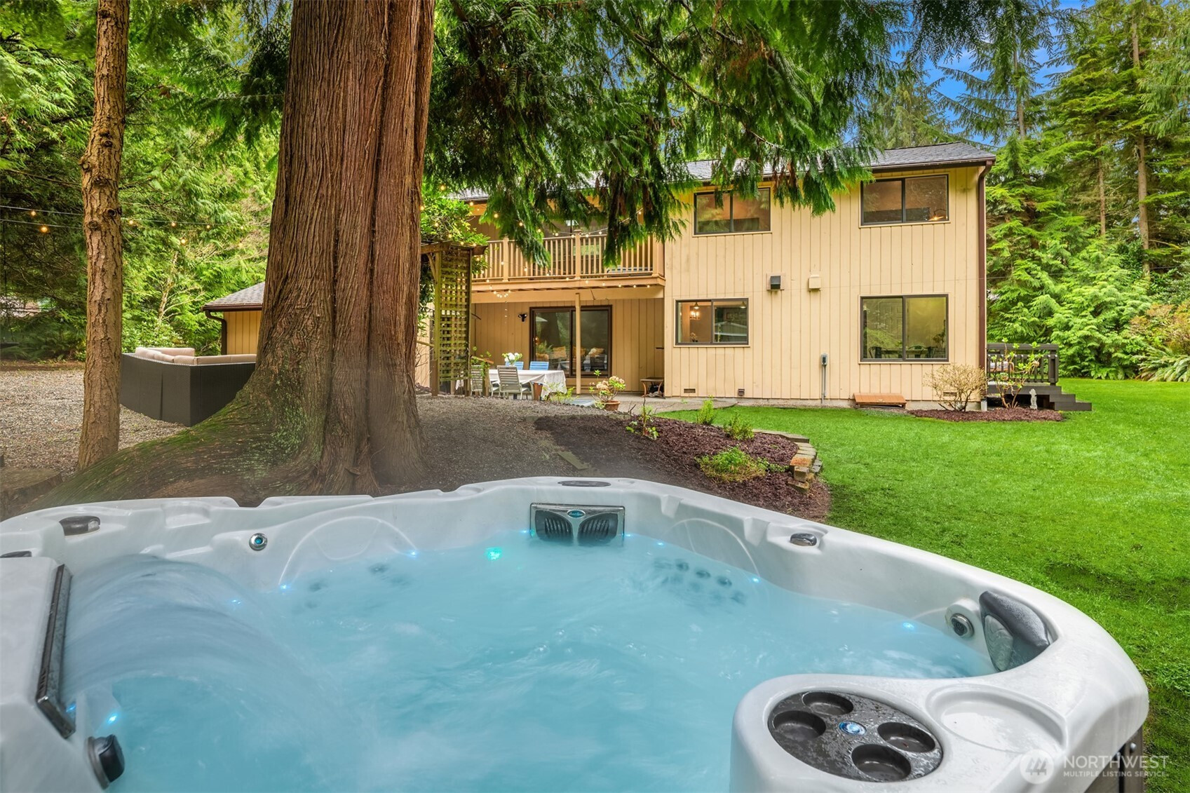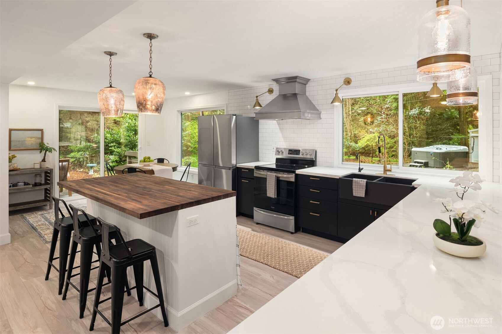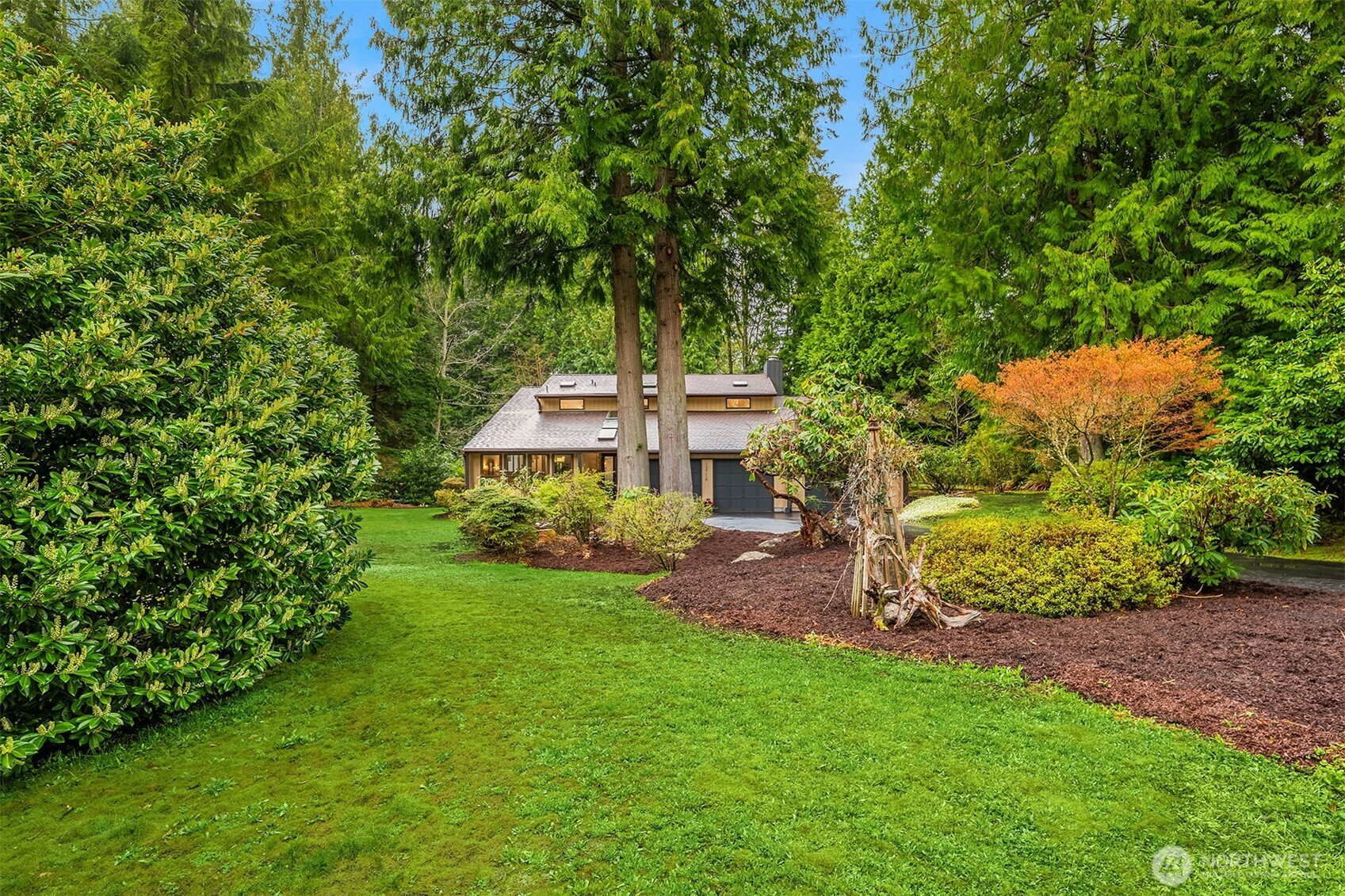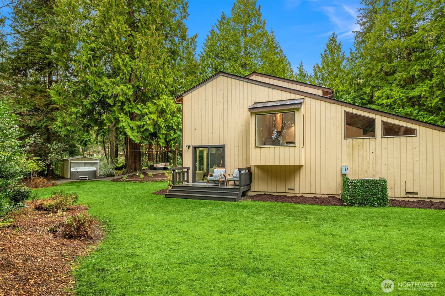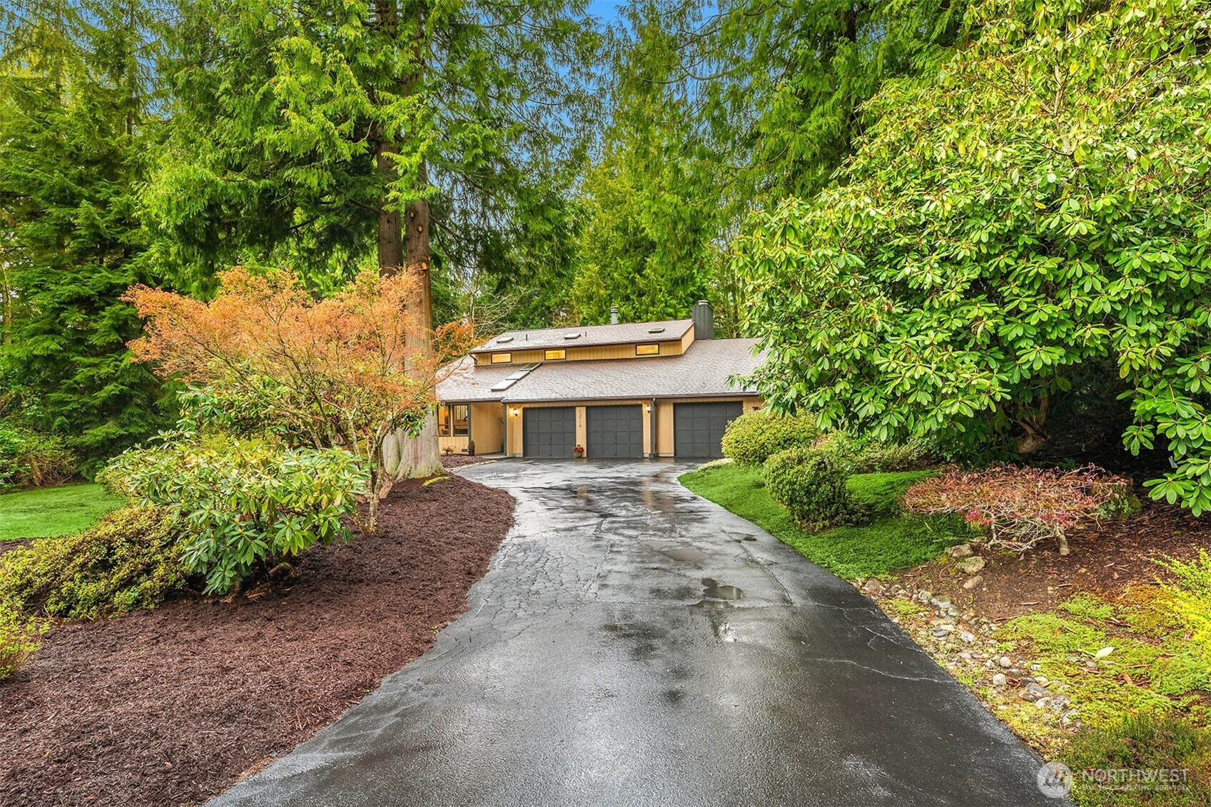 (650)533-3259Shy Acre Wonderland ~ Privately nestled down on a long wooded drive at the end of a cul-de-sac in coveted Wingate at Picnic Point, this northwest contemporary stunner dazzles with captivating curb appeal in a fairy tale setting with high-end modern upgrades throughout! Boasting dramatic architecture wrapped in windows with soaring open beam ceilings & breathtaking forest views at every turn. Brilliantly reimagined, the 2,046sf open concept two-story features an irresistible designer kitchen with sleek black cabinets, waterfall-edge quartz counters, custom steel hood, satin brass accents, wrap-around wall-to-wall tile backsplash, center island bar, exquisite hand blown Italian pendants & Bocchi Fireclay apron sink flanked by family room with wood-burning fireplace & dining space with slider to sun deck. Spacious vaulted living room with clearstory windows & open rail staircase. Magnificent primary suite with cathedral ceilings, towering fireplace, sitting area, walk-in closet, lavish tiled bath with skylight & extended covered balcony. Generous vaulted bedrooms & remodeled baths + secret bonus room off the 833sf 3-car dream garage. A turn-key masterpiece with gorgeous wide-planked LVP floors, new plush carpets, upscale millwork & fresh paint throughout. Secluded backyard sanctuary backed to lush evergreens features sprawling entertainment patio, fire pit, premium hot tub & wooded hiking trails. Just a short walk to Serene Lake Elementary. You'll love it here. Welcome home!