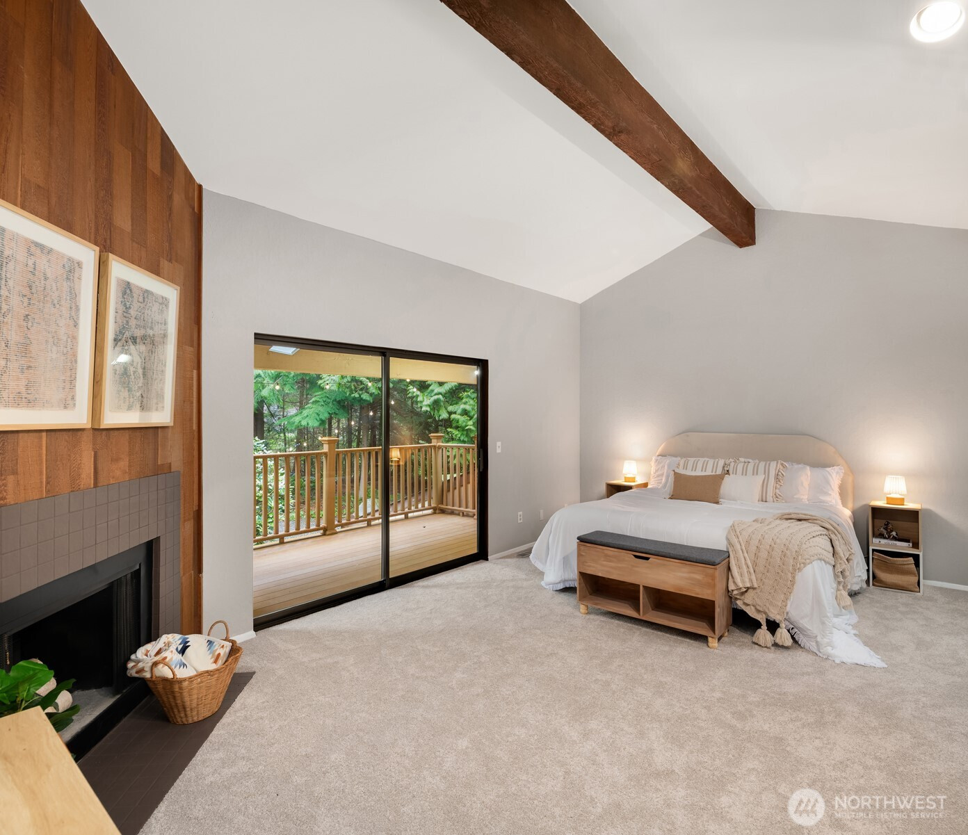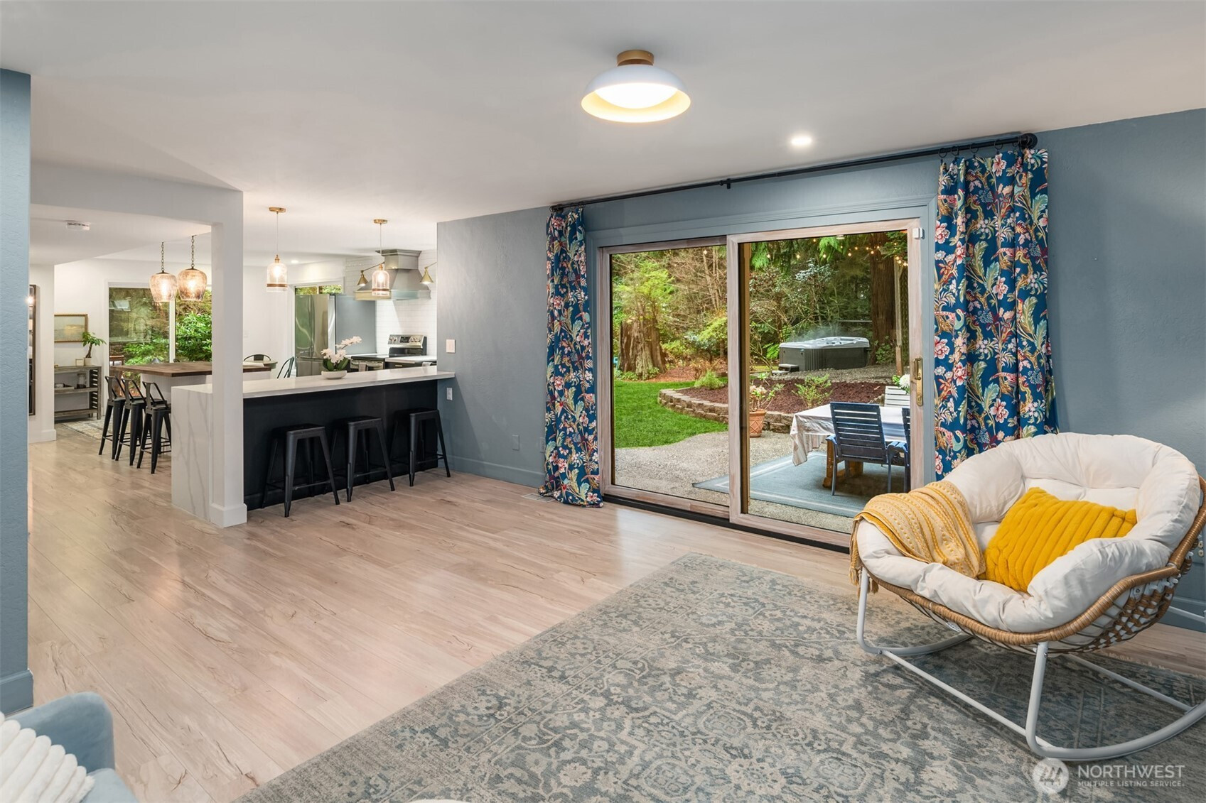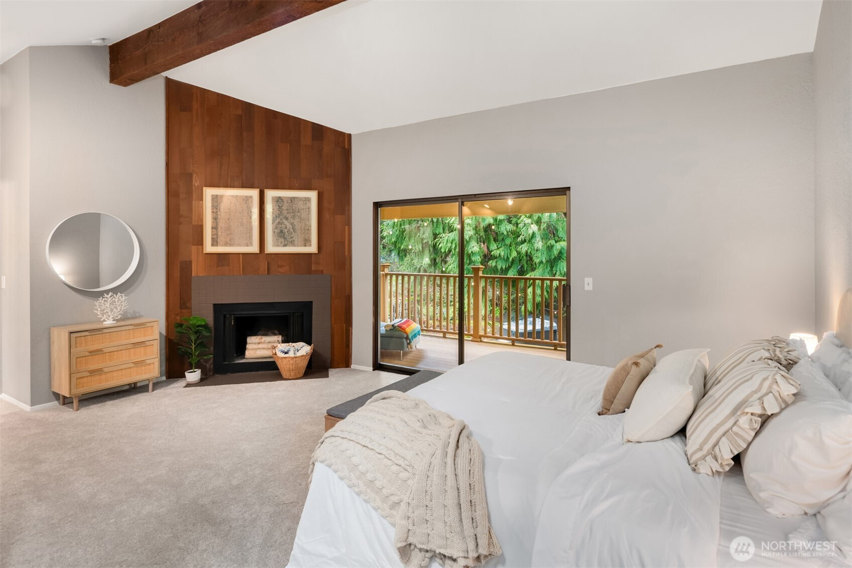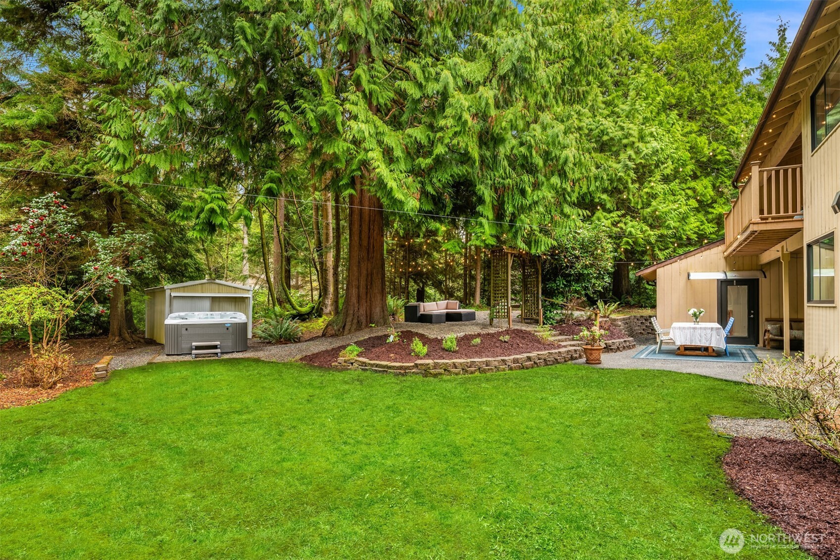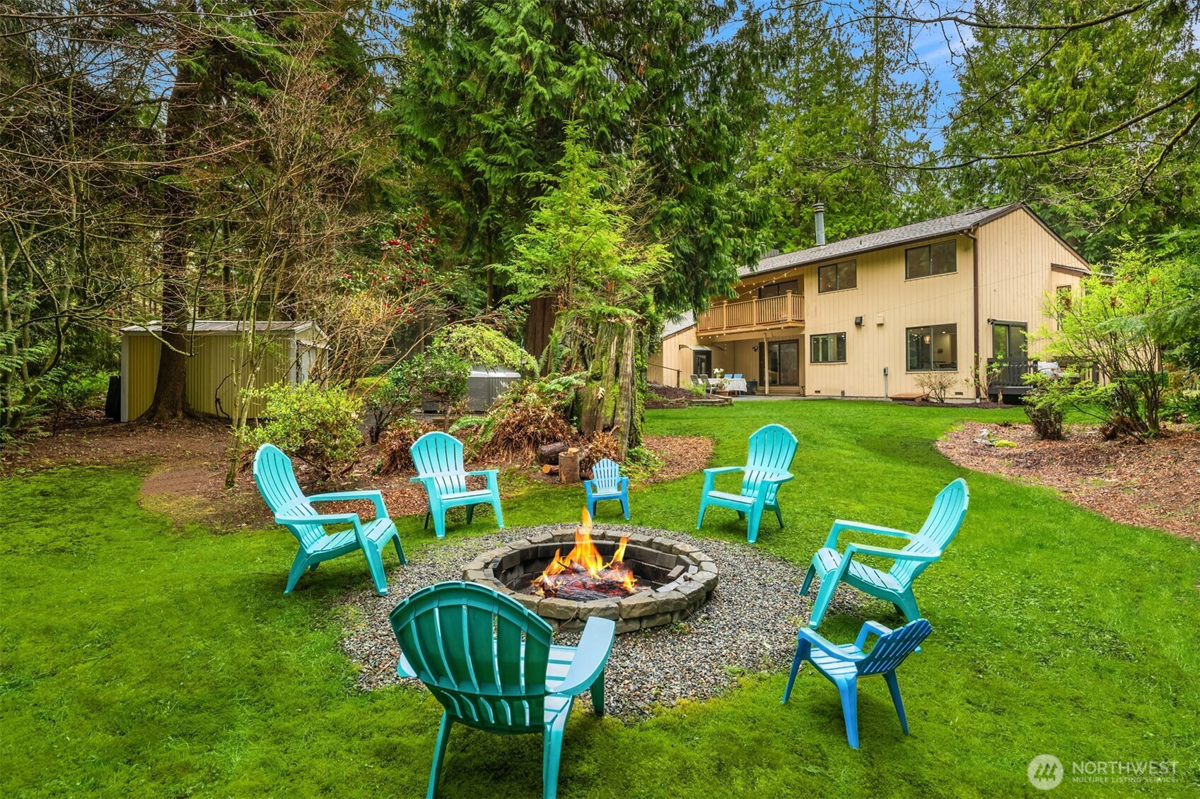 (650)533-3259Shy Acre Wonderland ~ Privately nestled down on a long wooded drive at the end of a cul-de-sac in coveted Wingate at Picnic Point, this northwest contemporary stunner dazzles with captivating curb appeal in a fairy tale setting with high-end modern upgrades throughout! Boasting dramatic architecture wrapped in windows with soaring open beam ceilings & breathtaking forest views at every turn. Brilliantly reimagined, the 2,046sf open concept two-story features an irresistible designer kitchen with sleek black cabinets, waterfall-edge quartz counters, custom steel hood, satin brass accents, wrap-around wall-to-wall tile backsplash, center island bar, exquisite hand blown Italian pendants & Bocchi Fireclay apron sink flanked by family room with wood-burning fireplace & dining space with slider to sun deck. Spacious vaulted living room with clearstory windows & open rail staircase. Magnificent primary suite with cathedral ceilings, towering fireplace, sitting area, walk-in closet, lavish tiled bath with skylight & extended covered balcony. Generous vaulted bedrooms & remodeled baths + secret bonus room off the 833sf 3-car dream garage. A turn-key masterpiece with gorgeous wide-planked LVP floors, new plush carpets, upscale millwork & fresh paint throughout. Secluded backyard sanctuary backed to lush evergreens features sprawling entertainment patio, fire pit, premium hot tub & wooded hiking trails. Just a short walk to Serene Lake Elementary. You'll love it here. Welcome home!