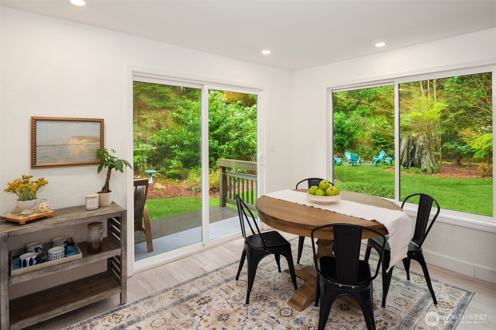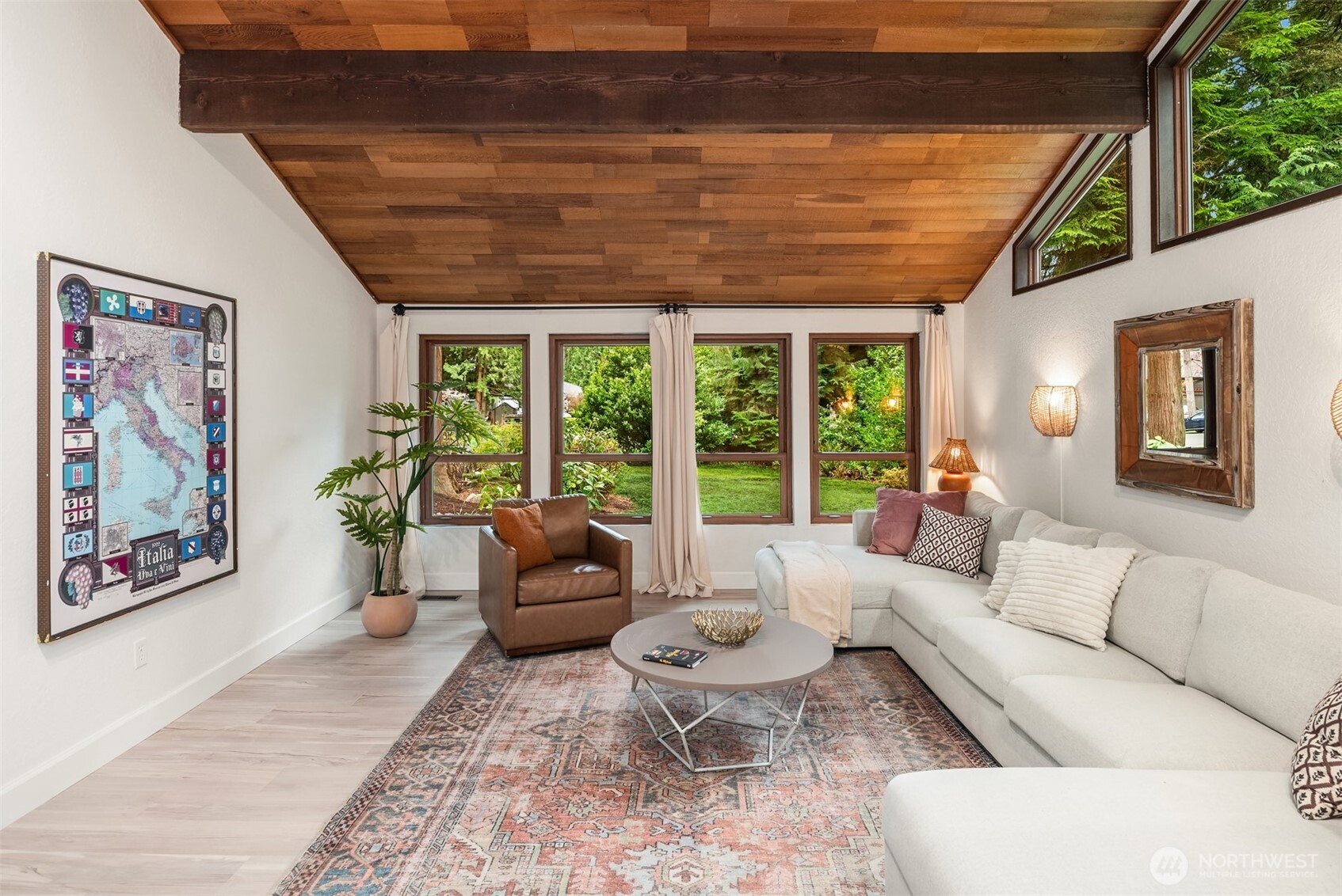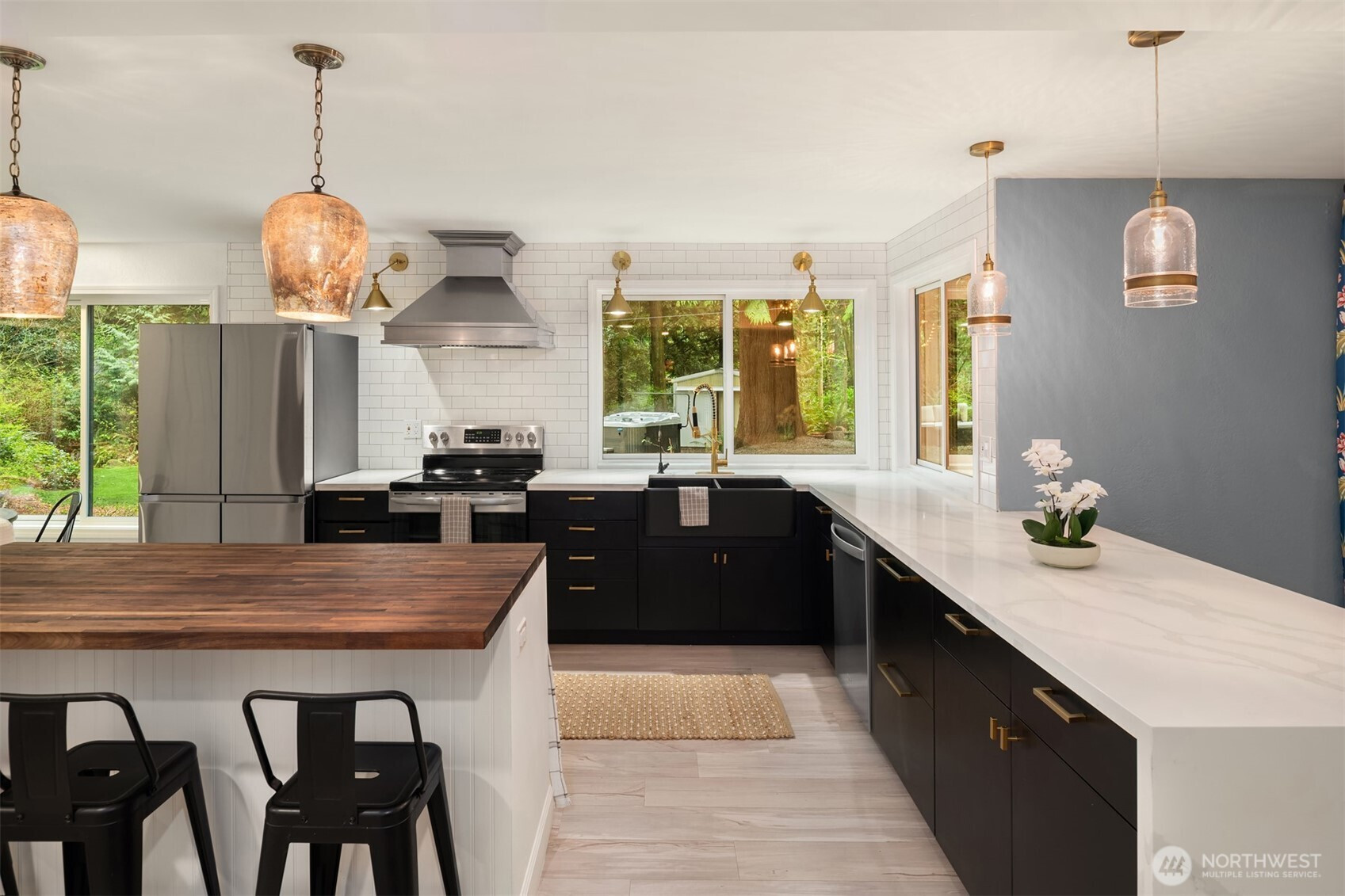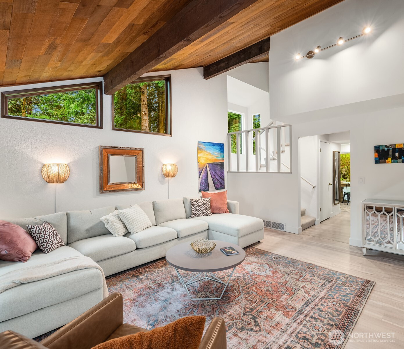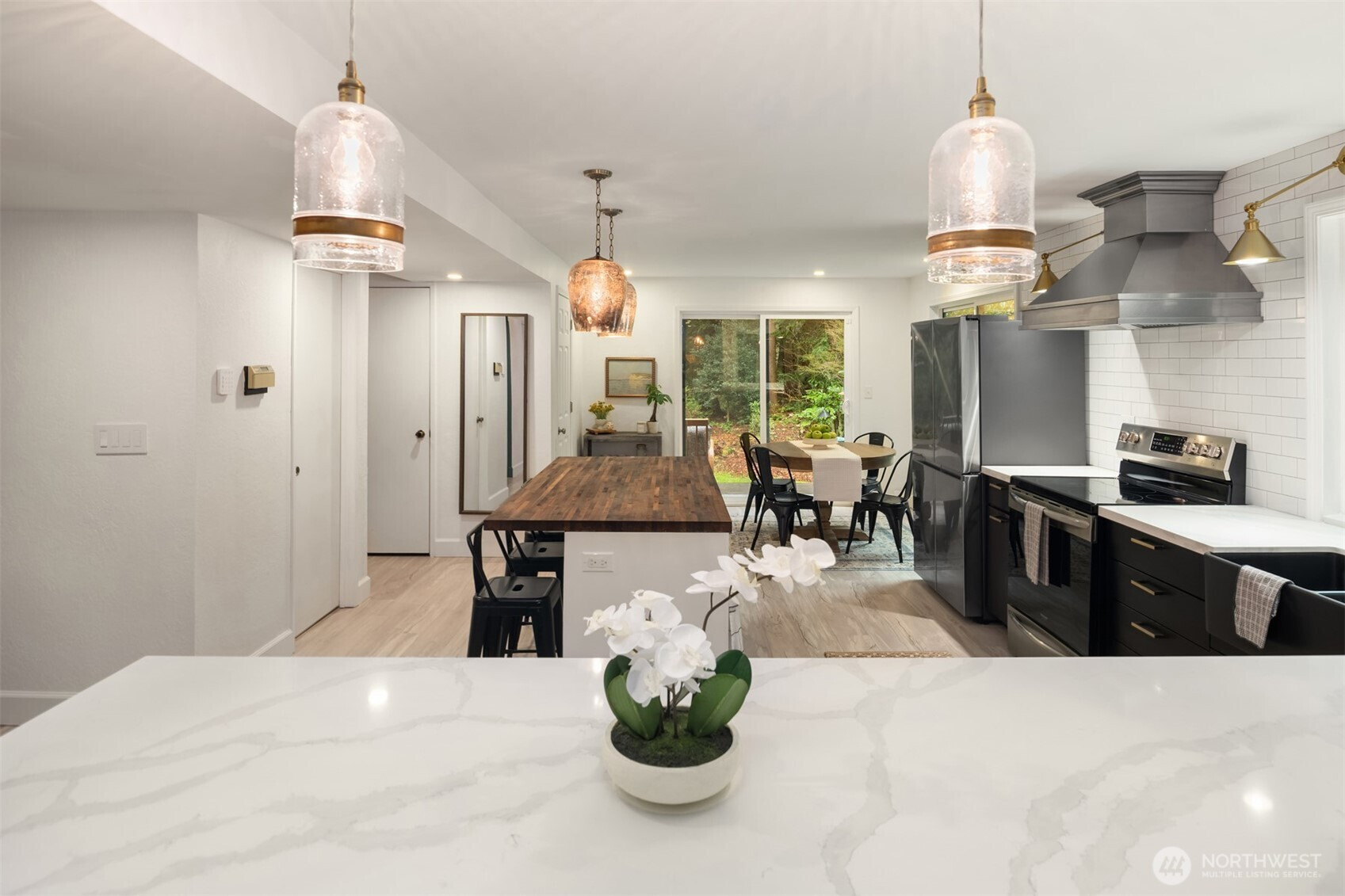 (650)533-3259Shy Acre Wonderland ~ Privately nestled down on a long wooded drive at the end of a cul-de-sac in coveted Wingate at Picnic Point, this northwest contemporary stunner dazzles with captivating curb appeal in a fairy tale setting with high-end modern upgrades throughout! Boasting dramatic architecture wrapped in windows with soaring open beam ceilings & breathtaking forest views at every turn. Brilliantly reimagined, the 2,046sf open concept two-story features an irresistible designer kitchen with sleek black cabinets, waterfall-edge quartz counters, custom steel hood, satin brass accents, wrap-around wall-to-wall tile backsplash, center island bar, exquisite hand blown Italian pendants & Bocchi Fireclay apron sink flanked by family room with wood-burning fireplace & dining space with slider to sun deck. Spacious vaulted living room with clearstory windows & open rail staircase. Magnificent primary suite with cathedral ceilings, towering fireplace, sitting area, walk-in closet, lavish tiled bath with skylight & extended covered balcony. Generous vaulted bedrooms & remodeled baths + secret bonus room off the 833sf 3-car dream garage. A turn-key masterpiece with gorgeous wide-planked LVP floors, new plush carpets, upscale millwork & fresh paint throughout. Secluded backyard sanctuary backed to lush evergreens features sprawling entertainment patio, fire pit, premium hot tub & wooded hiking trails. Just a short walk to Serene Lake Elementary. You'll love it here. Welcome home!