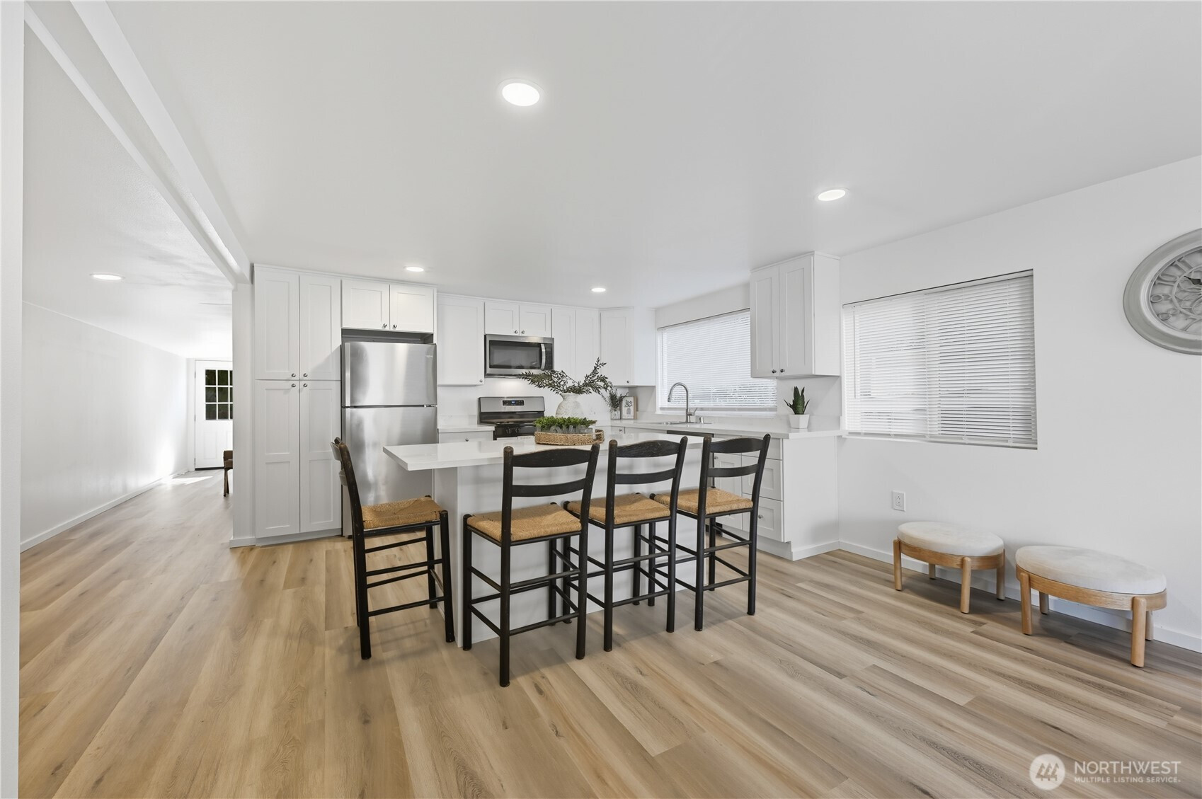 (650)533-3259Welcome to this beautifully remodeled 2-bed, 1-bath home on a 55+ community where modern style meets everyday comfort. Fresh LVP flooring, new trim, and interior/exterior paint pair with abundant natural light through gorgeous windows. The kitchen features quartz countertops, new cabinetry, and stainless steel appliances; the primary bedroom enjoys easy access to the full bath and laundry. Major improvements include new siding, a newer roof, new plumbing, a refreshed crawlspace, new doors, and updated lighting. Outside, a long carport, tool shed, back deck, and patio add function. An efficient gas furnace keeps it cozy. Move-in ready!