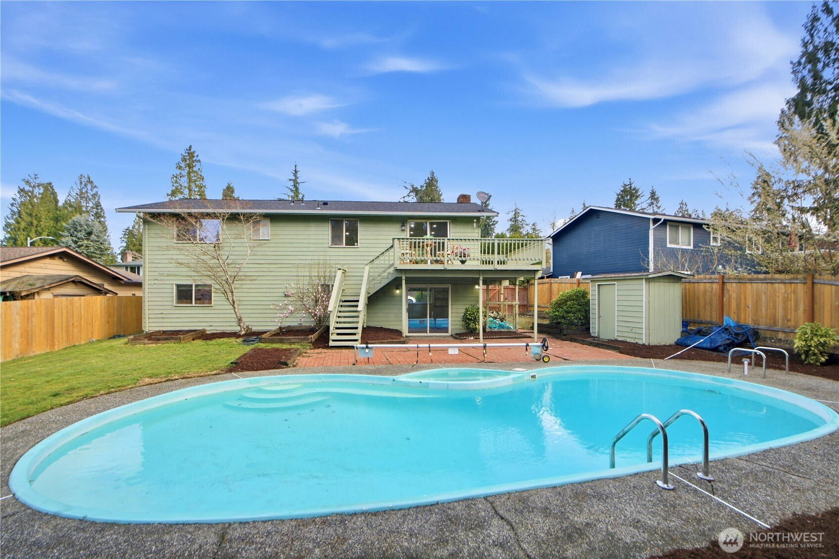 (650)533-3259Beautiful Bothell home boasts soaring vaulted ceiling, ample natual lights and modern updates. Fresh interior paint throughout the home, new flooring across upper level & newer roof.The main level features open concept living room, a cozy dining room, stylish kitchen, primary ensuite and 2 comfortable bedrooms. Downstairs, a large family/bonus room provides flex space and 1 bedroom with a 3/4 bath. Expansive deck overlooking fully fenced backyard with a private pool for outdoor entertaining. Community offers May's Pond Park, Clubhouse w/pool and New playground, tennis courts and trails. Minutes from Mill Creek Town Center, shopping, schools and easy commute. With its inviting layout, spacious flat backyard, and prime location, this home presents an incredible opporutnity to enjoy the best of Bothell living.