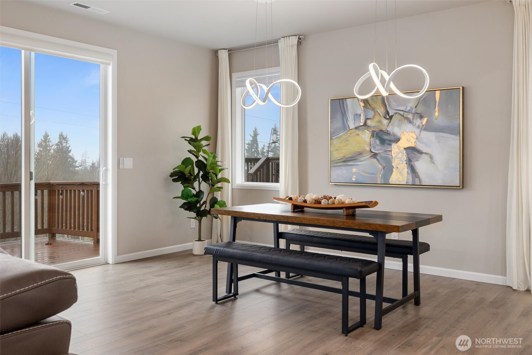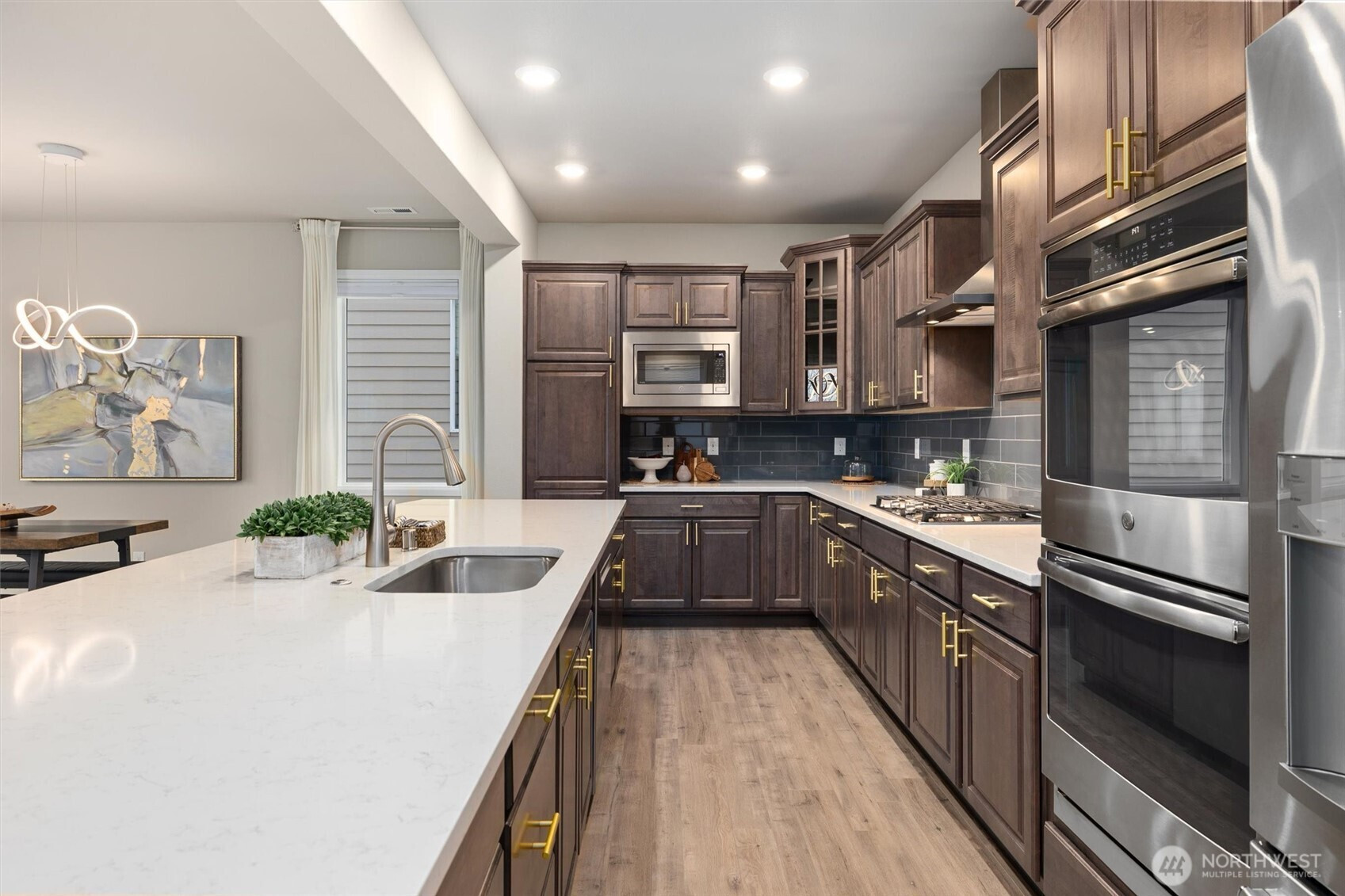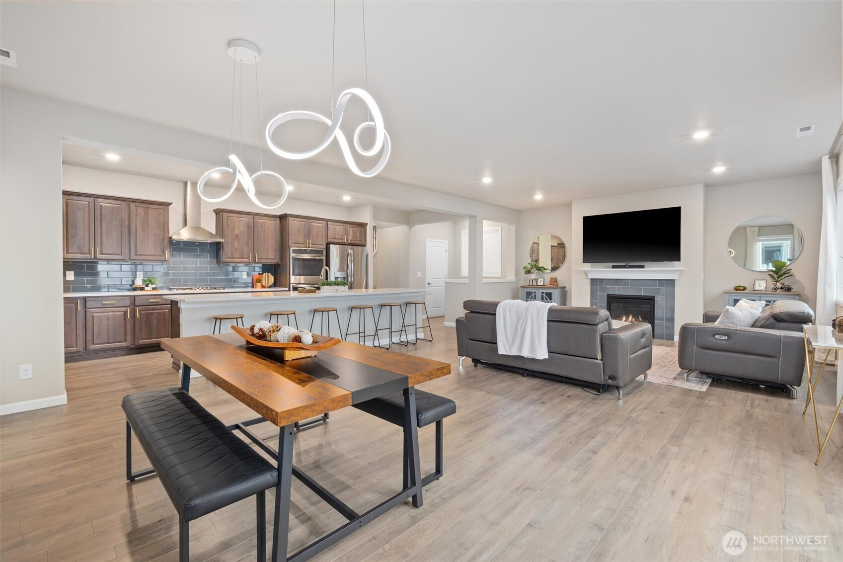 (650)533-3259Covered front patio welcomes you to this spectacular 9-foot-ceiling SMART home. From the moment you step inside, the grand entryway & soaring ceilings set the tone, complemented by abundant natural light & stunning territorial & Olympic Mountain views. Just off the entry, the heart of the home awaits, impressive chef’s kitchen designed for both everyday living & entertaining. Featuring a large eating island w/seating for 6, 5-burner gas cooktop, double ovens, soft-close cabinetry w/upgraded hardware & a pantry w/slide-out drawers. Laminate flooring flows seamlessly through the open-concept living & dining areas, anchored by a cozy gas fireplace. Tall slider & oversized windows capture the views & flood the space w/light, while canned LED lighting & smart-home features enhance comfort & efficiency. Main-floor 1/2 bth completes the main level. Upstairs, you’ll find 3 generously sized bedrms, including 2 that share a Jack & Jill bathroom. Spacious owner’s suite offers a peaceful retreat w/luxurious 5-piece ensuite. Upstairs laundry room & furnace closet add everyday convenience. Fully finished basement continues the 9-foot ceilings & provides exceptional flexibility w/a large bonus room. Optional 5th bedroom & a ¾ bath. 5th bedroom currently has one wall unfinished, offering an opportunity for customization. Expansive patio is ideal for entertaining & covered area beneath deck has been roofed creating a private, year-round seating space. Central A/C & Northshore Schools!