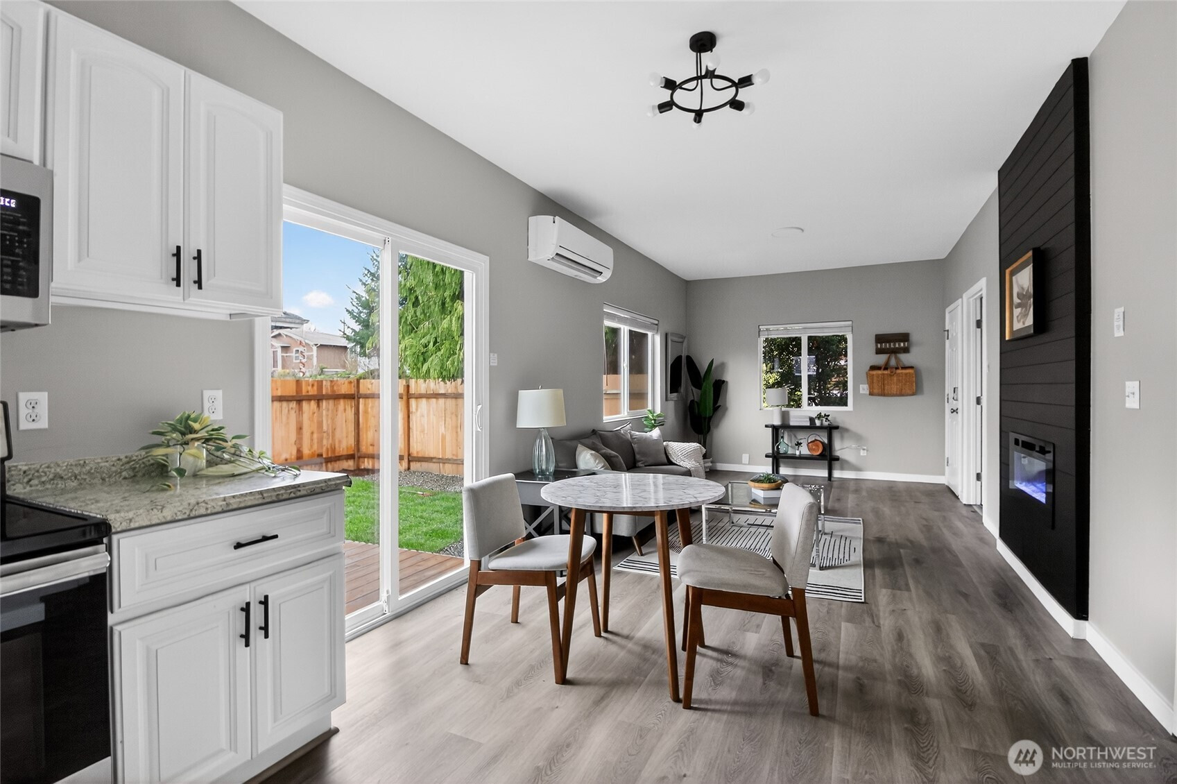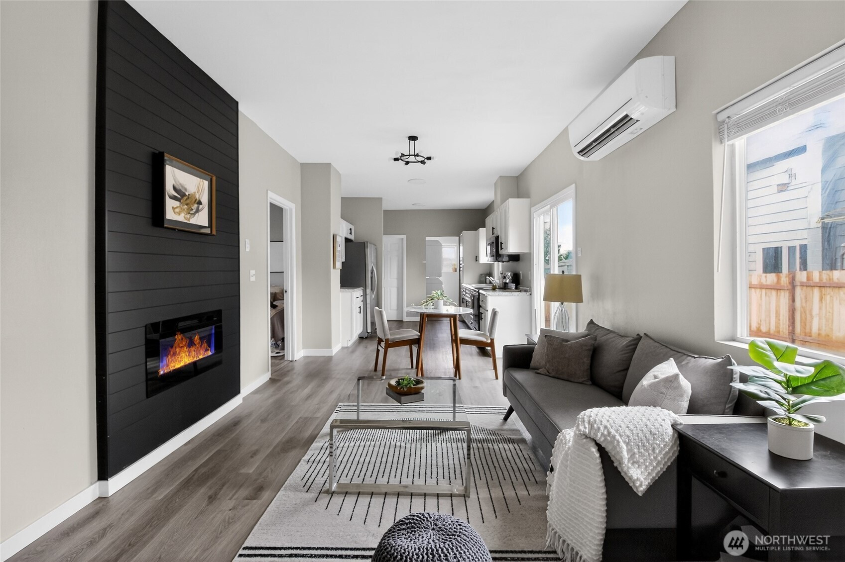 (650)533-3259Welcome to this beautifully updated rambler on a charming tree-lined street. A new cedar front porch welcomes you into a bright, open-concept home featuring 3 bedrooms and a custom-designed bathroom. Recent updates include electrical, plumbing, heating, windows, fresh interior and exterior paint, and new luxury vinyl plank flooring throughout. High ceilings and large windows fill the home with natural light, while a recessed electric fireplace adds warmth and style. Stay comfortable year-round with a Mitsubishi mini-split system providing efficient heating and A/C. Enjoy the new deck overlooking the landscaped yard, plus a designated parking space behind the home and additional parking in front. Basement offers extra storage. Conveniently located minutes from downtown Everett, I-5, restaurants, and the Everett Transit Station.