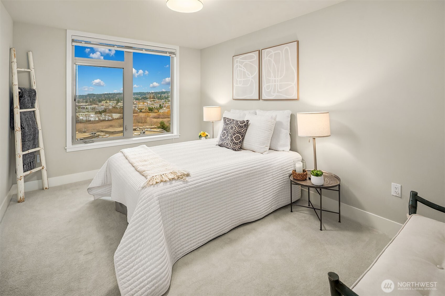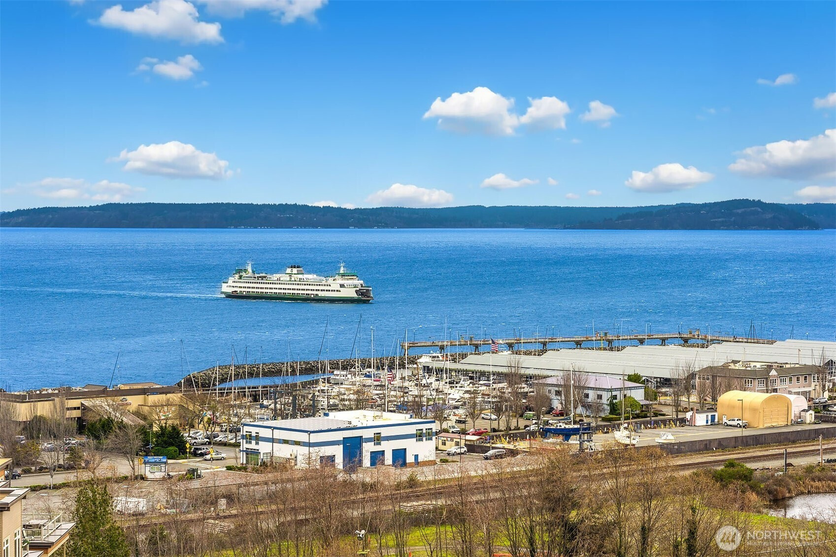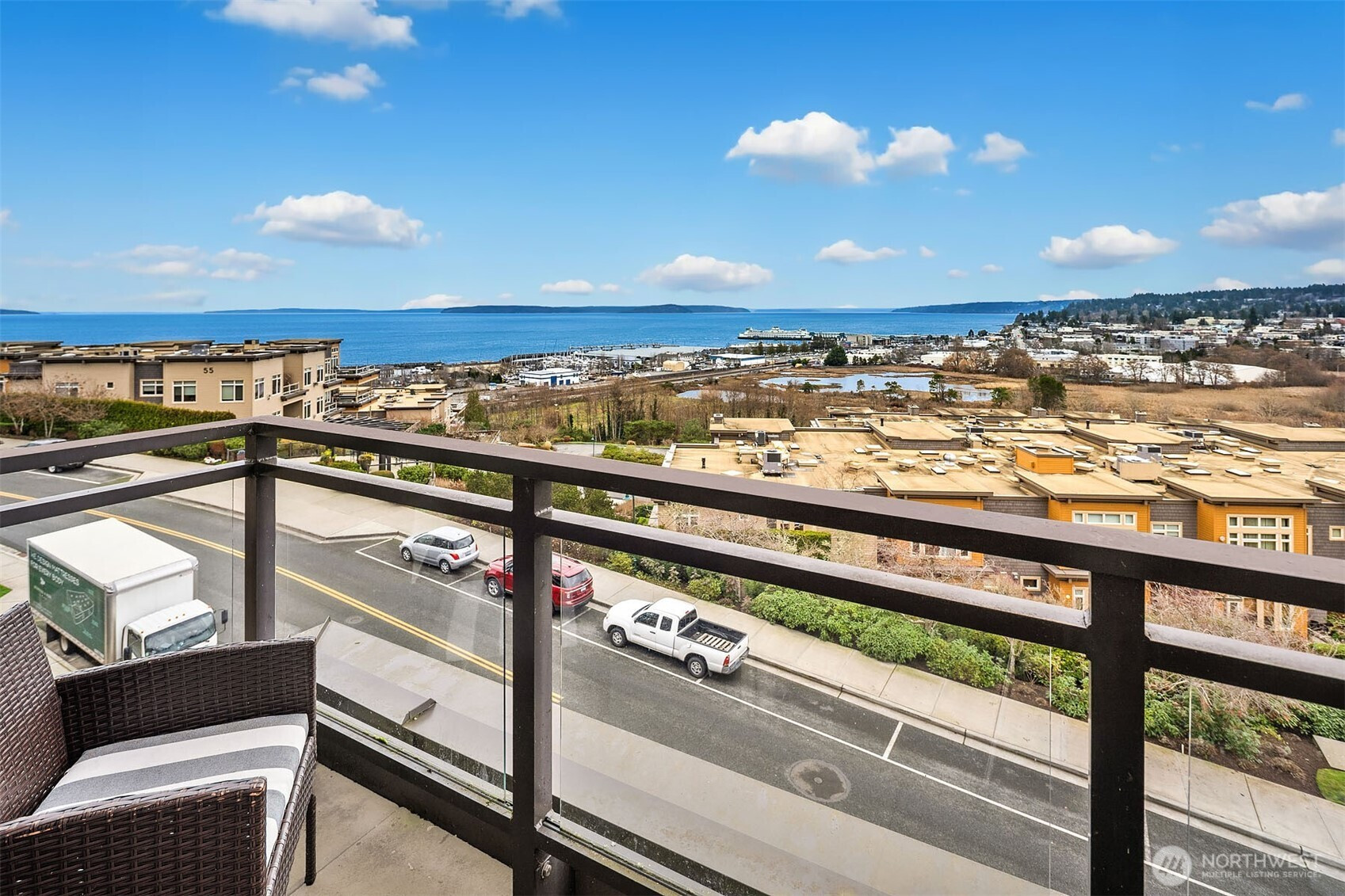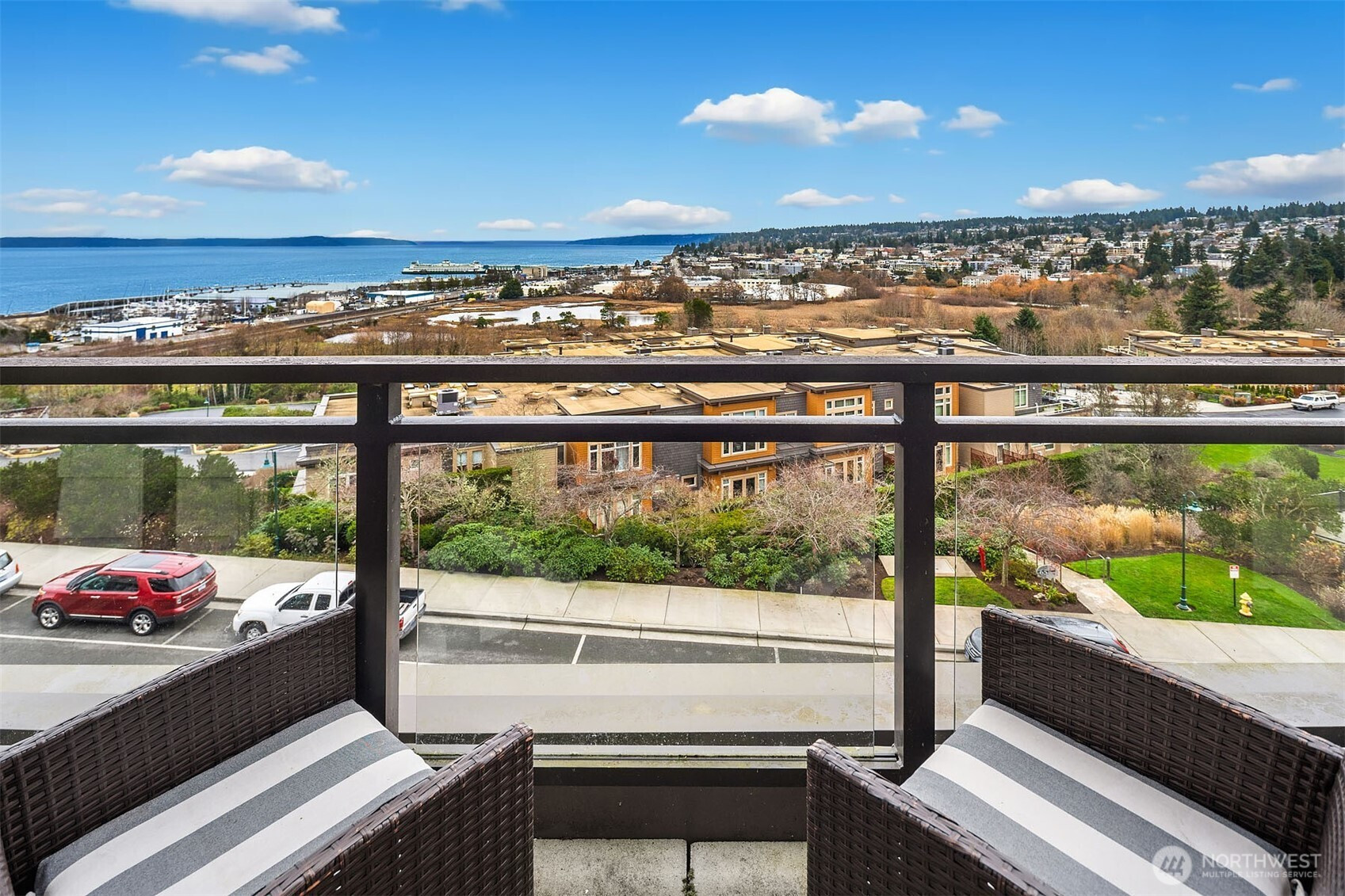 (650)533-3259TOP-Floor luxury with commanding views. This light-filled condo offers panoramic Puget Sound, mountain, and city vistas from a prime setting. Vaulted ceilings and expansive windows frame the scenery. HD floors and AC add everyday comfort. The open kitchen impresses with quartz counters, stainless steel appliances, and sleek European cabinetry. The primary suite features sweeping views, plush carpet, a king-size layout, custom walk-in closet, and spacious bath. A second bedroom enjoys scenic outlooks and custom storage. Step onto your private deck to watch ferries, sailboats, and unforgettable sunsets. Enjoy convenient access directly off the lobby, two parking spaces, and storage plus amenities rooftop deck, clubroom, and courtyard.