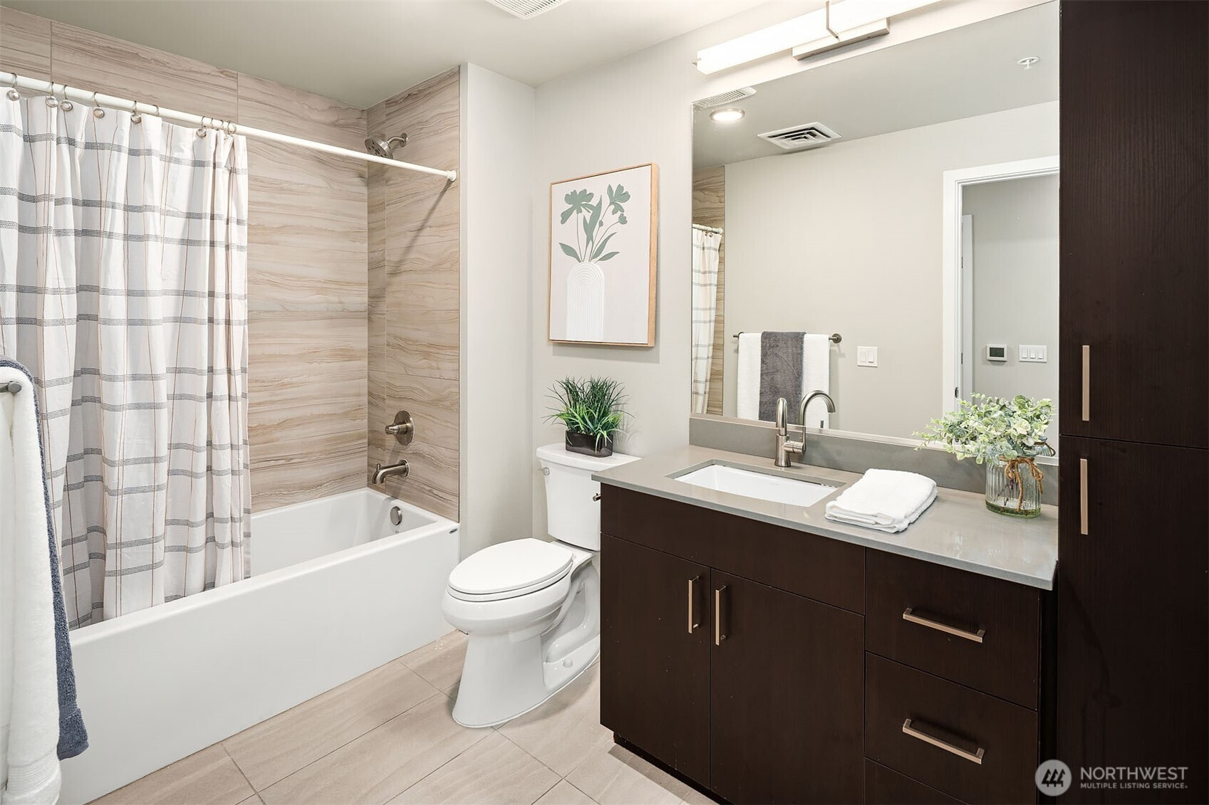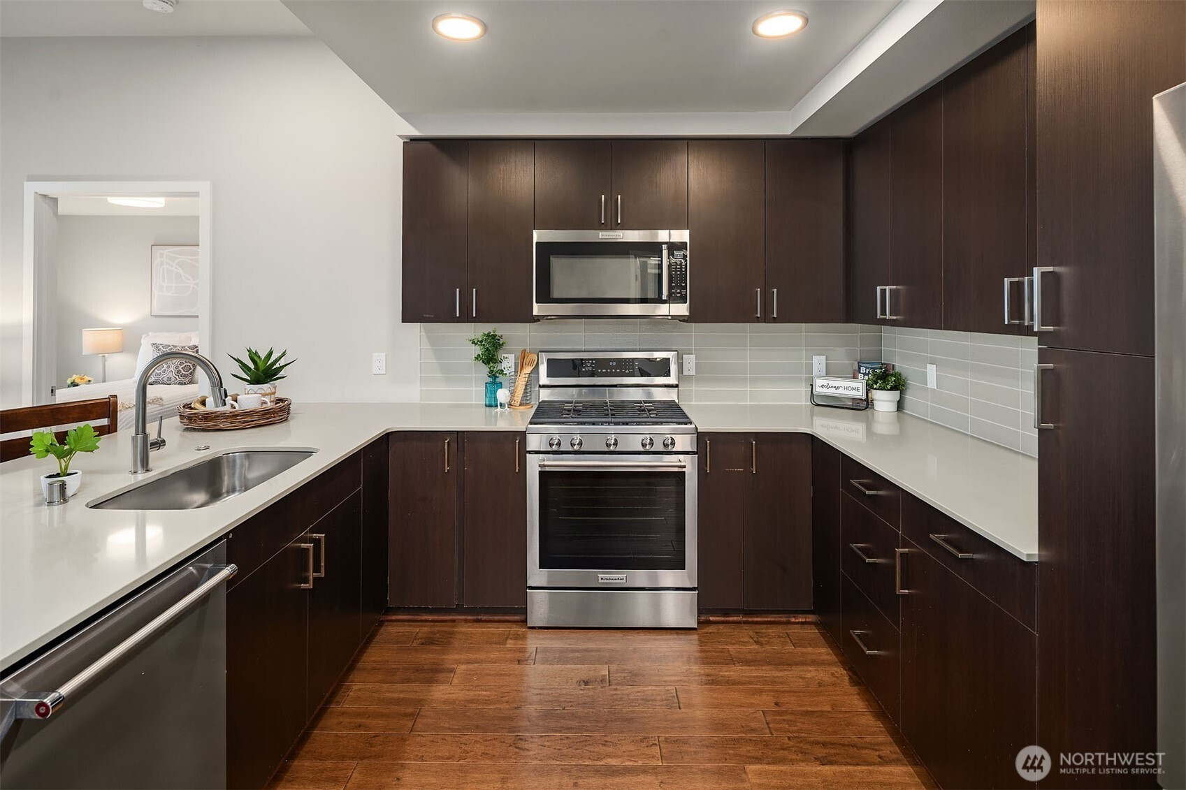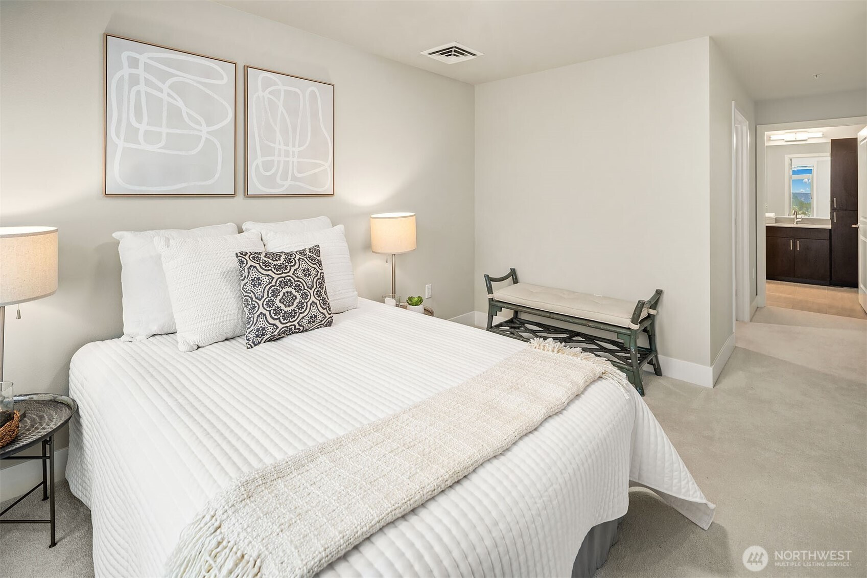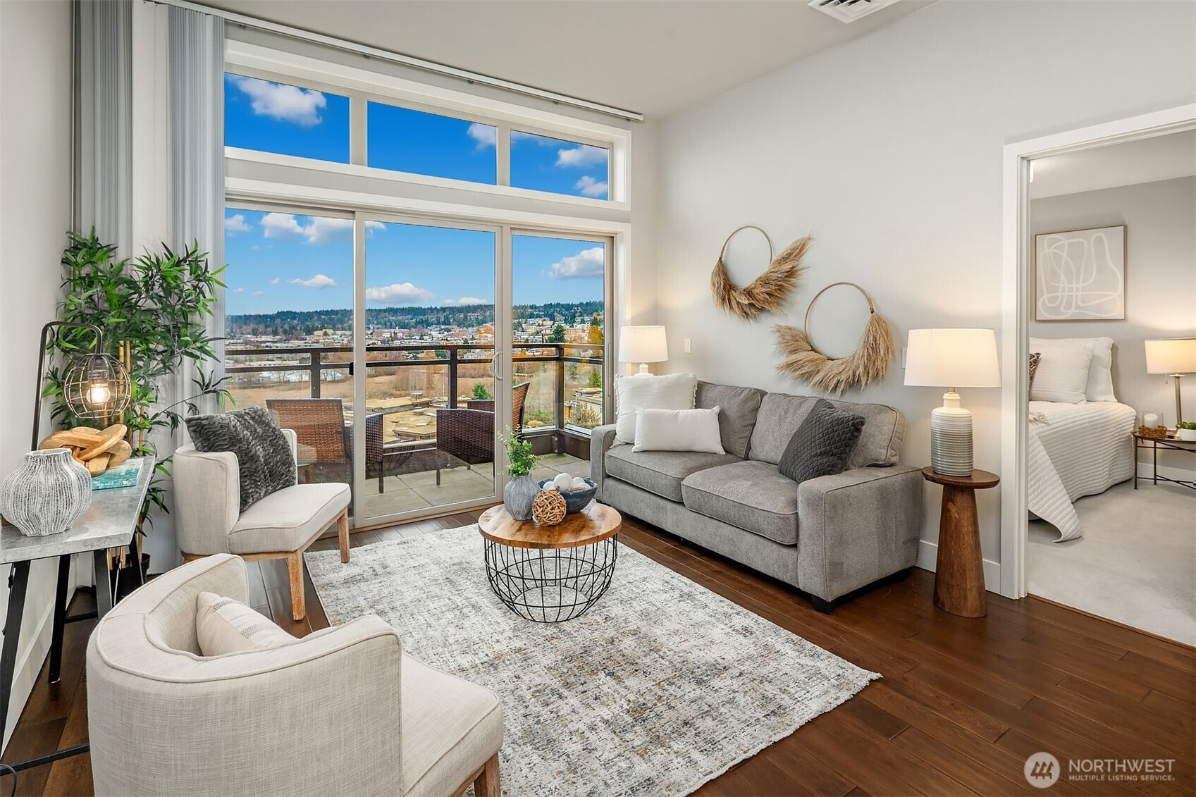 (650)533-3259TOP-Floor luxury with commanding views. This light-filled condo offers panoramic Puget Sound, mountain, and city vistas from a prime setting. Vaulted ceilings and expansive windows frame the scenery. HD floors and AC add everyday comfort. The open kitchen impresses with quartz counters, stainless steel appliances, and sleek European cabinetry. The primary suite features sweeping views, plush carpet, a king-size layout, custom walk-in closet, and spacious bath. A second bedroom enjoys scenic outlooks and custom storage. Step onto your private deck to watch ferries, sailboats, and unforgettable sunsets. Enjoy convenient access directly off the lobby, two parking spaces, and storage plus amenities rooftop deck, clubroom, and courtyard.