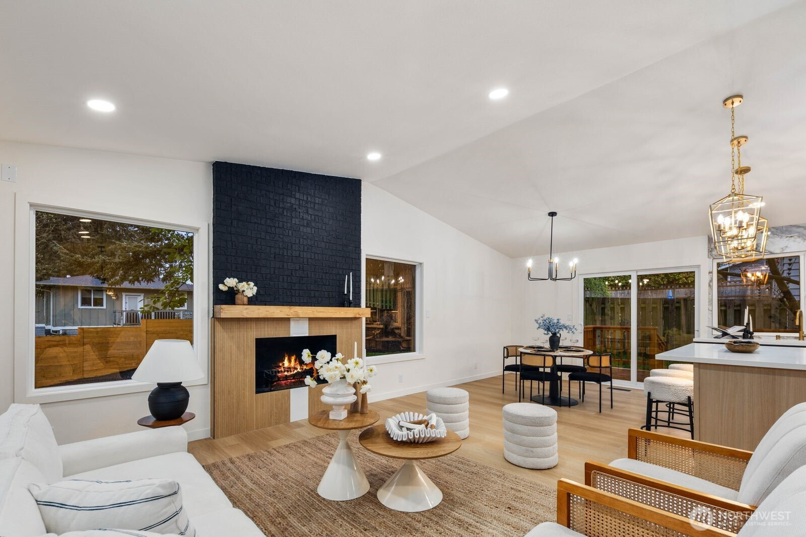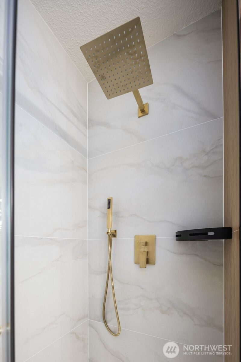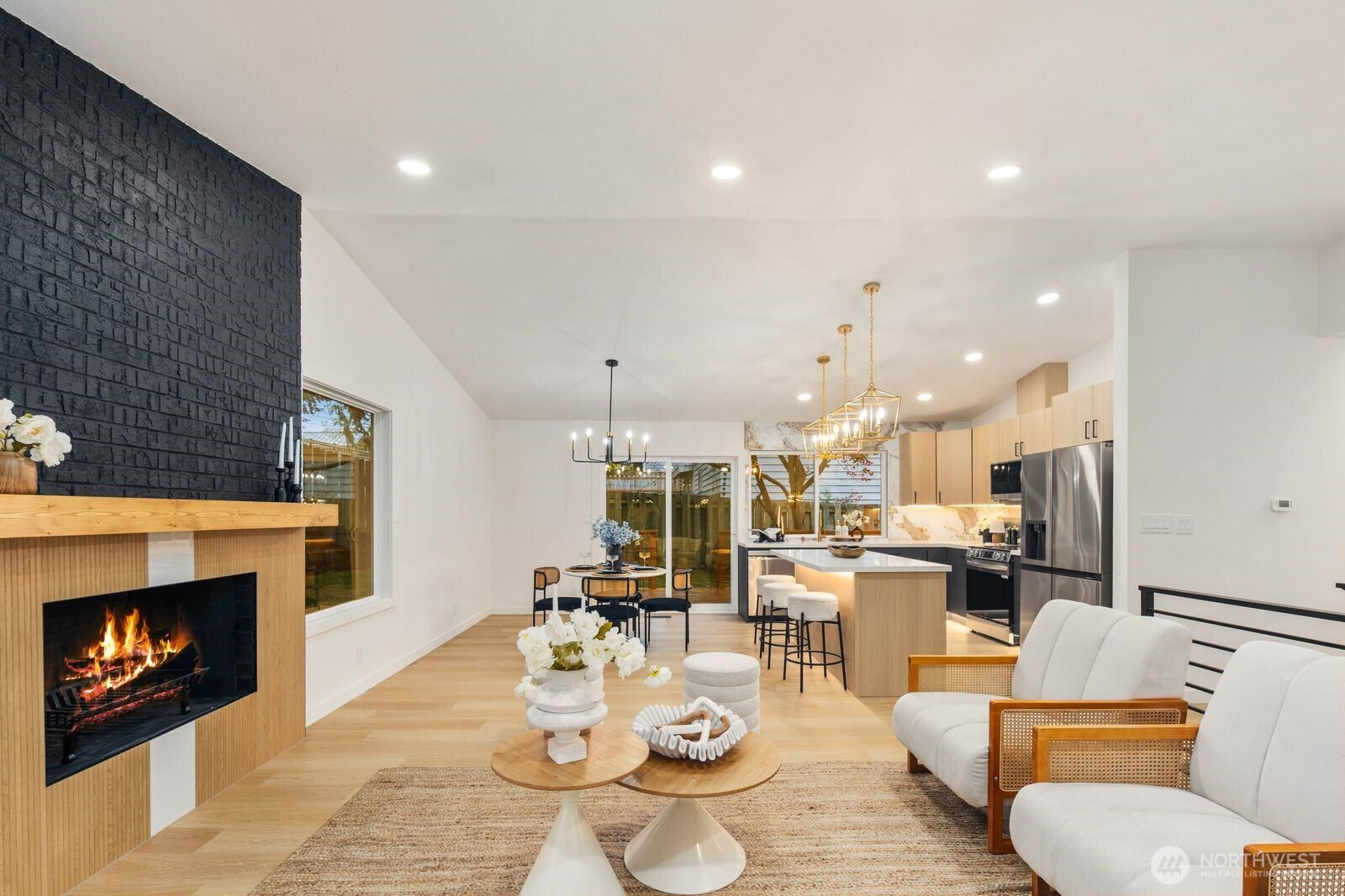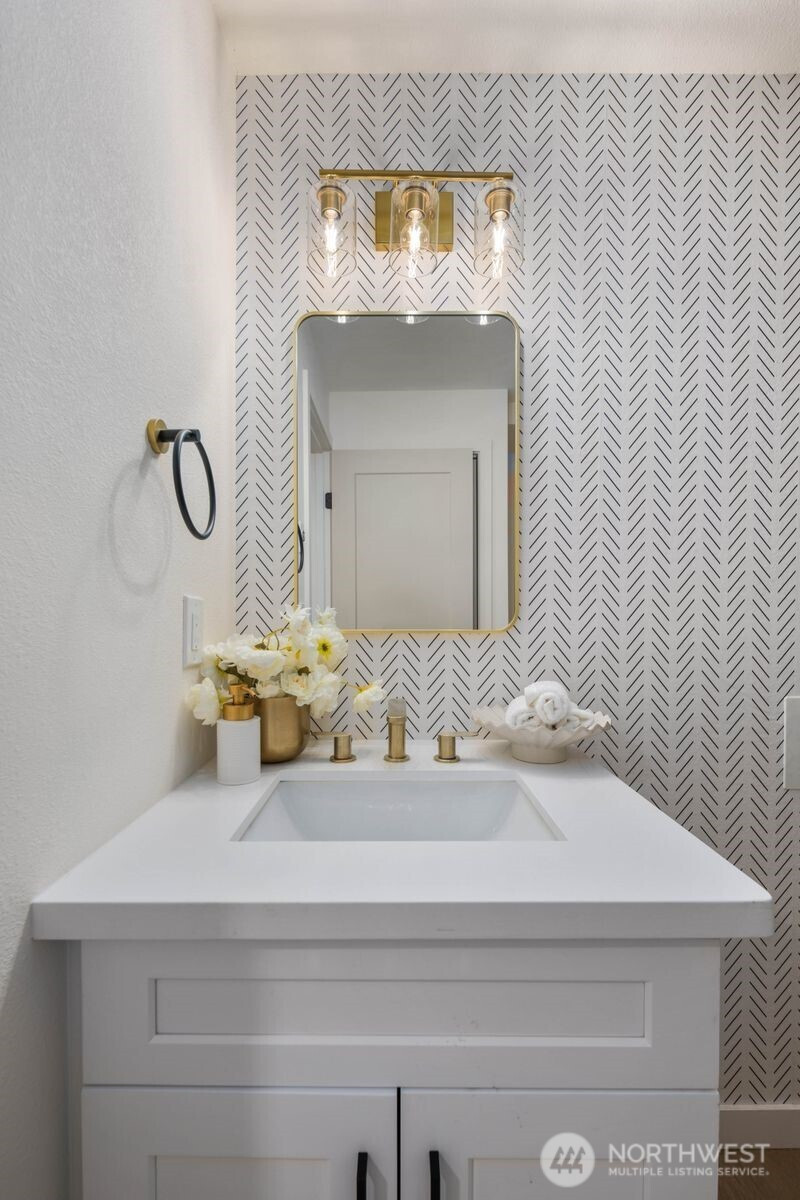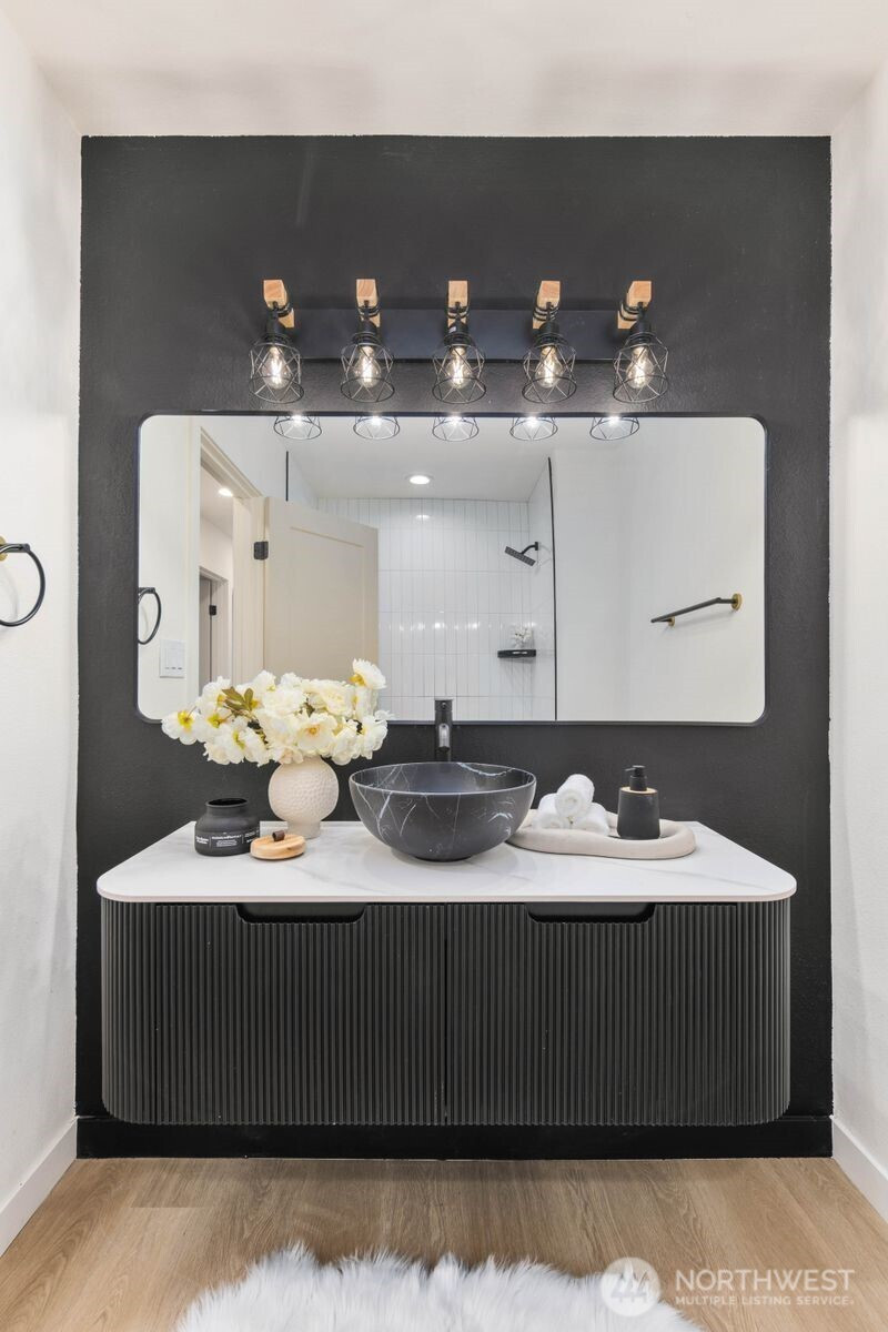 (650)533-3259Fully reimagined from top to bottom, this Edmonds home is a study in modern design and quality craftsmanship. A striking charcoal exterior with warm wood accents and fresh landscaping sets the tone from the moment you arrive, situated on a quiet street with mature tree coverage. Inside, the open concept main level unfolds with intention. Vaulted ceilings frame a dramatic fireplace with a black brick surround and warm wood accent detail, while the remodeled kitchen delivers marble backsplash, gold pendant lighting, stainless appliances, and a statement island built for gathering. The dining area flows naturally from the kitchen, completing a main floor designed for both everyday living and entertaining. The lower level adds a second living space anchored by its own fireplace and a slatted wood accent wall, offering flexibility for a media room, guest suite, or lounge. The primary suite is a true standout, and every updated bathroom throughout reflects a designer touch, from geometric wallpaper and gold fixtures to floating vanities and glass-enclosed showers. An epoxy-coated two-car garage, entertainer's deck, and fully fenced yard complete the picture. Minutes from downtown Edmonds, the waterfront, and everyday conveniences — this is the one that stands out.