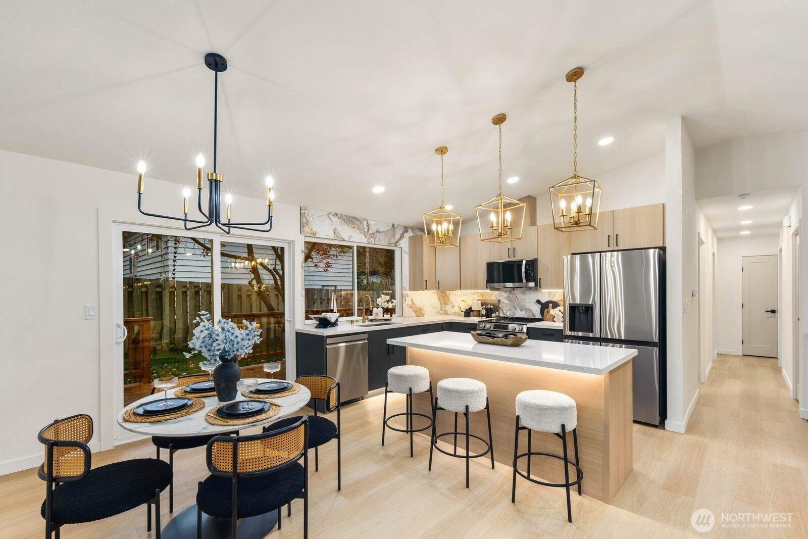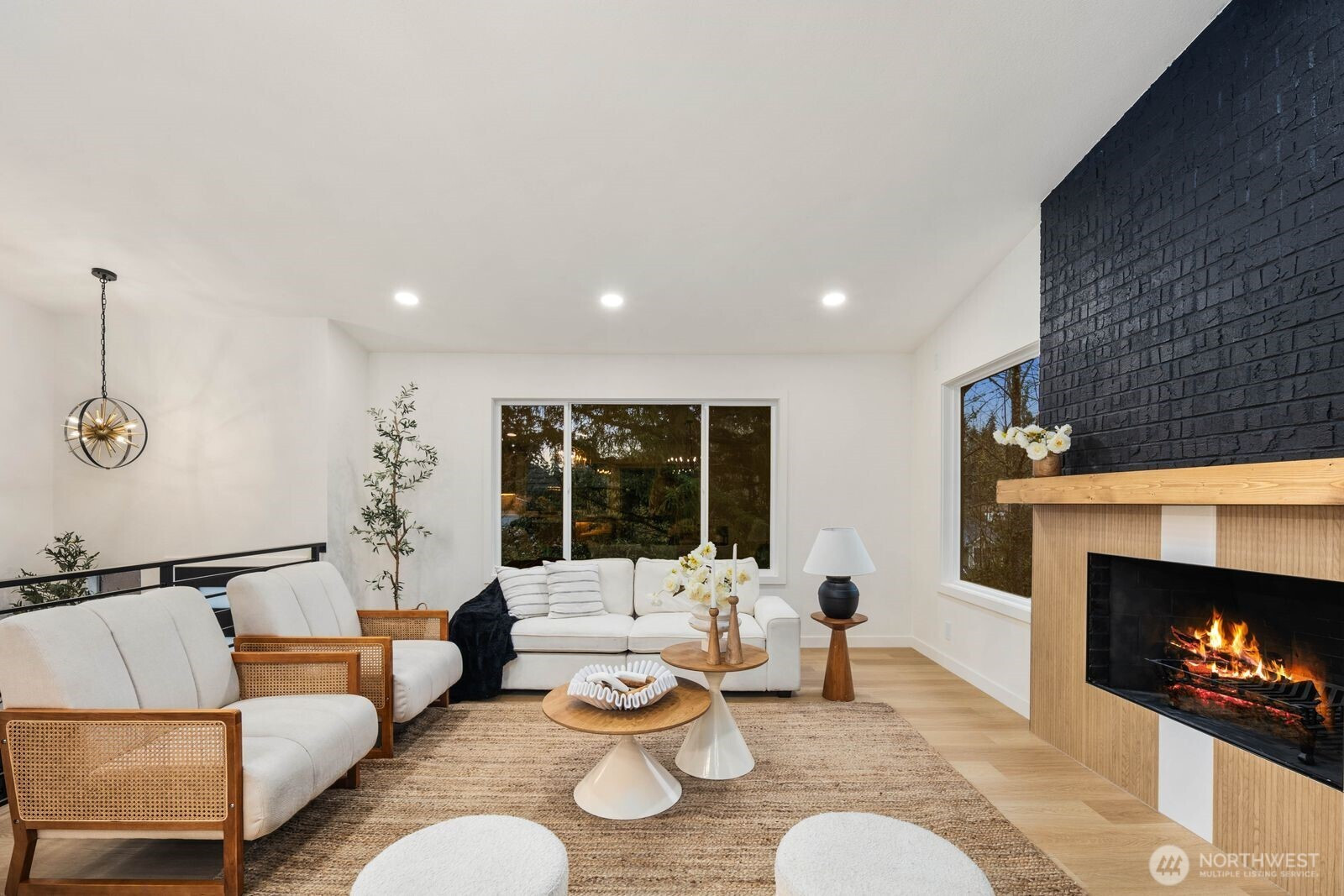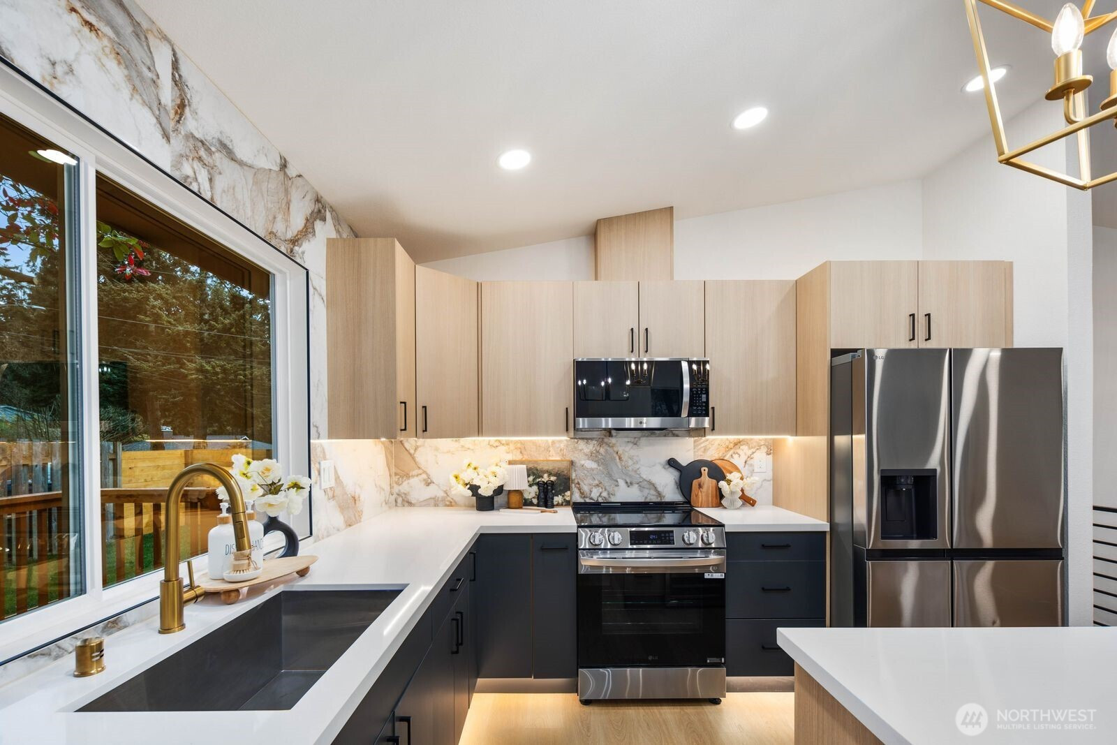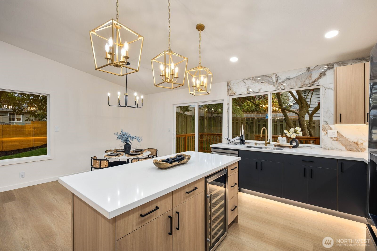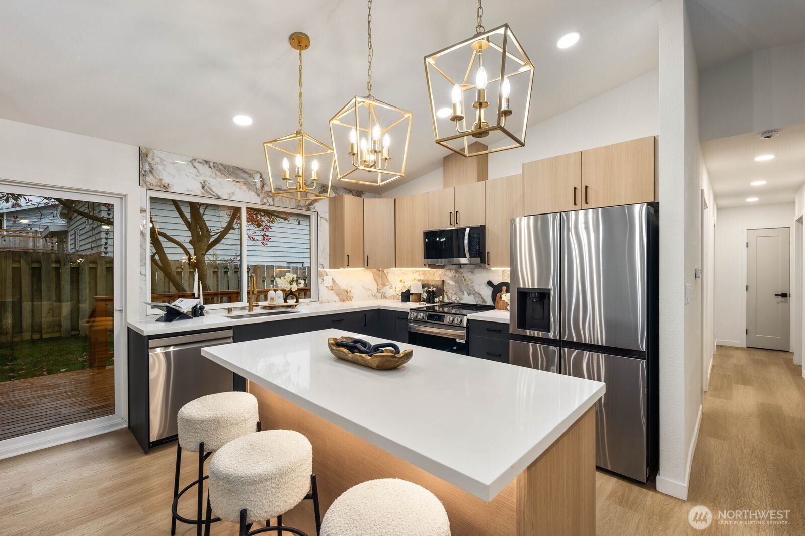(650)533-3259Fully reimagined from top to bottom, this Edmonds home is a study in modern design and quality craftsmanship. A striking charcoal exterior with warm wood accents and fresh landscaping sets the tone from the moment you arrive, situated on a quiet street with mature tree coverage. Inside, the open concept main level unfolds with intention. Vaulted ceilings frame a dramatic fireplace with a black brick surround and warm wood accent detail, while the remodeled kitchen delivers marble backsplash, gold pendant lighting, stainless appliances, and a statement island built for gathering. The dining area flows naturally from the kitchen, completing a main floor designed for both everyday living and entertaining. The lower level adds a second living space anchored by its own fireplace and a slatted wood accent wall, offering flexibility for a media room, guest suite, or lounge. The primary suite is a true standout, and every updated bathroom throughout reflects a designer touch, from geometric wallpaper and gold fixtures to floating vanities and glass-enclosed showers. An epoxy-coated two-car garage, entertainer's deck, and fully fenced yard complete the picture. Minutes from downtown Edmonds, the waterfront, and everyday conveniences — this is the one that stands out.