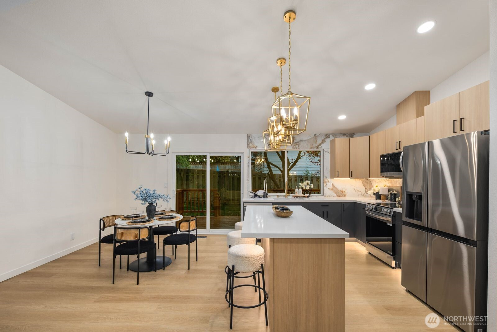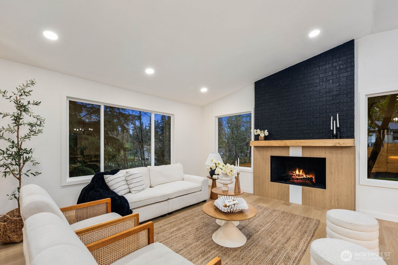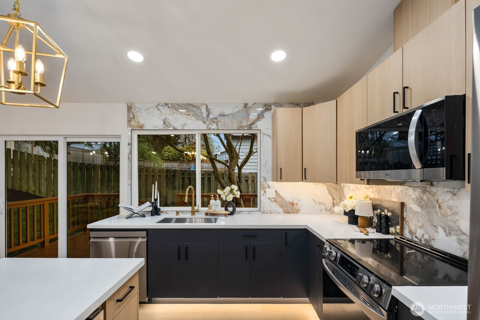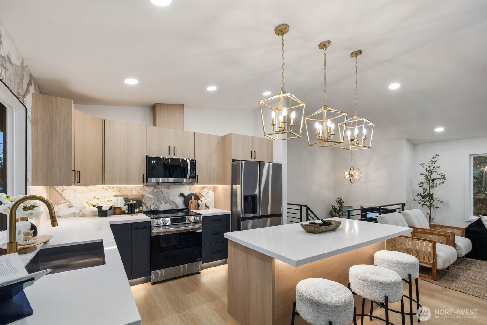 (650)533-3259Fully reimagined from top to bottom, this Edmonds home is a study in modern design and quality craftsmanship. A striking charcoal exterior with warm wood accents and fresh landscaping sets the tone from the moment you arrive, situated on a quiet street with mature tree coverage. Inside, the open concept main level unfolds with intention. Vaulted ceilings frame a dramatic fireplace with a black brick surround and warm wood accent detail, while the remodeled kitchen delivers marble backsplash, gold pendant lighting, stainless appliances, and a statement island built for gathering. The dining area flows naturally from the kitchen, completing a main floor designed for both everyday living and entertaining. The lower level adds a second living space anchored by its own fireplace and a slatted wood accent wall, offering flexibility for a media room, guest suite, or lounge. The primary suite is a true standout, and every updated bathroom throughout reflects a designer touch, from geometric wallpaper and gold fixtures to floating vanities and glass-enclosed showers. An epoxy-coated two-car garage, entertainer's deck, and fully fenced yard complete the picture. Minutes from downtown Edmonds, the waterfront, and everyday conveniences — this is the one that stands out.