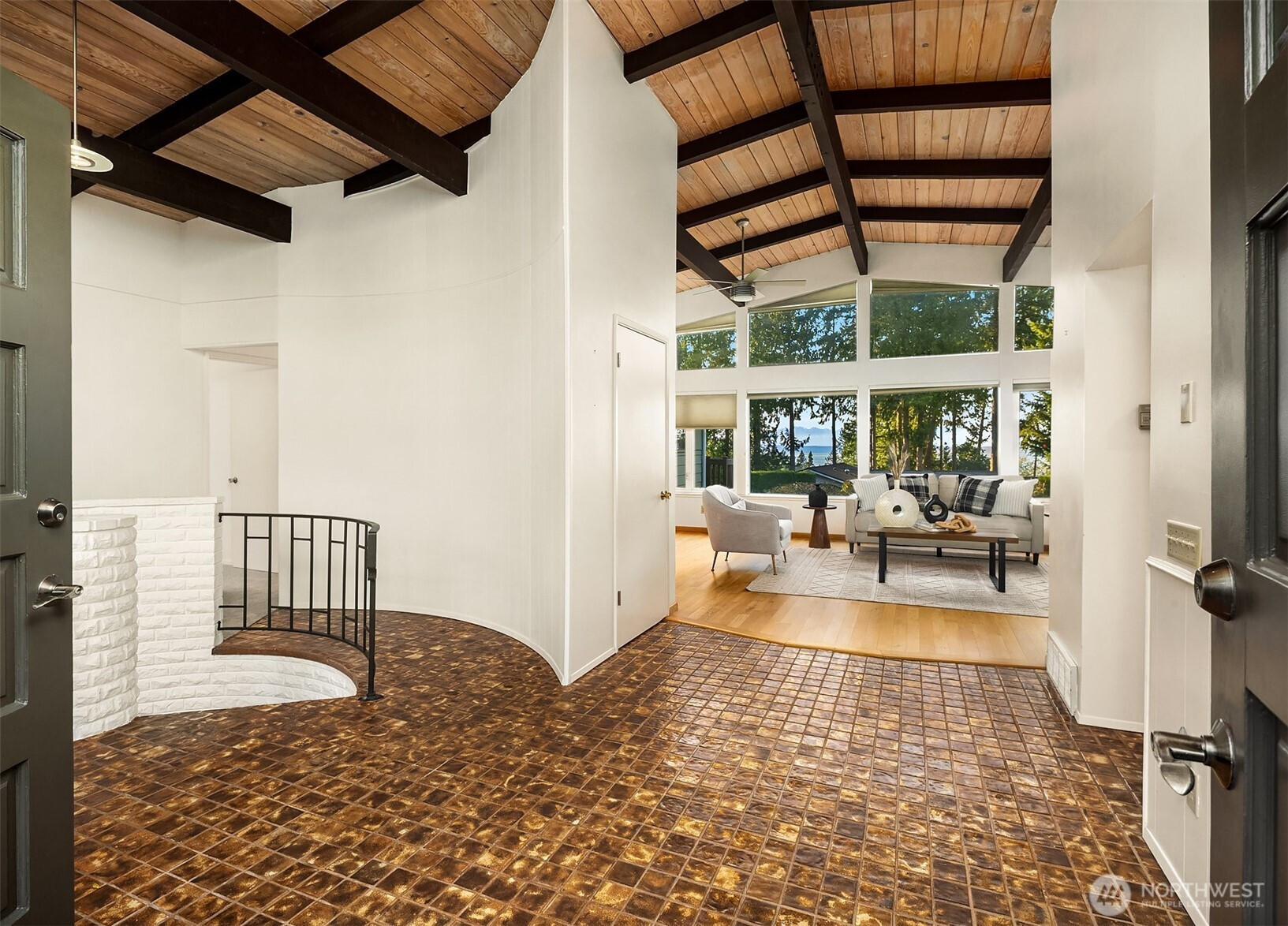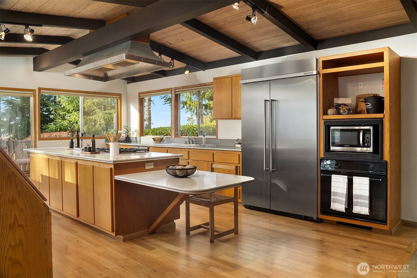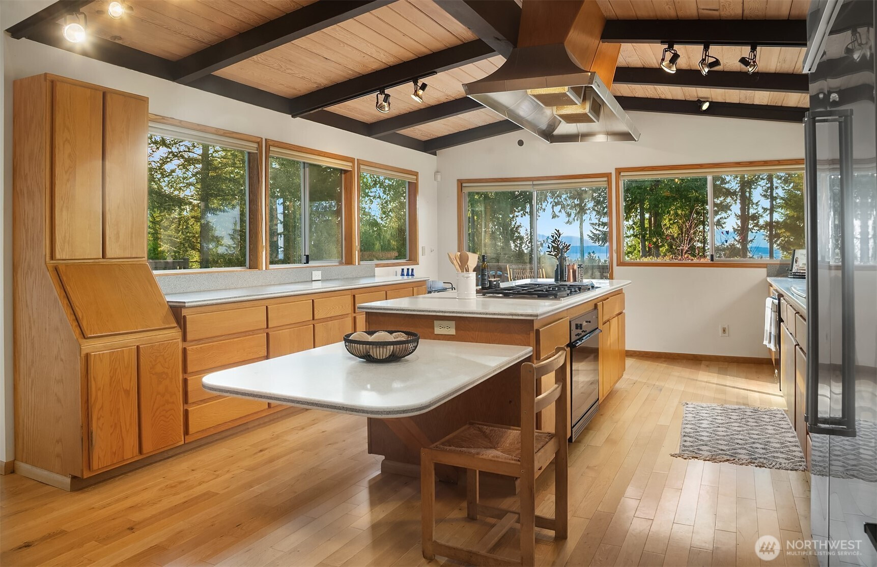(650)533-3259Edmonds Mid-Century home w/ vaulted wood-lined ceilings & exposed beams. Large walls of glass & clerestory windows flood interiors w/ light & capture peekaboo Puget Sound & Olympic Mt views. Stone-clad wood-burning fireplaces & hardwoods throughout main add character & warmth. Chef’s kitchen w/ oversized island, gas cooktop, sleek metal range hood, extensive cabinetry & huge fridge. Seamless outdoor flow to view deck. Primary Suite features malm-style cone fireplace, built-ins, private deck & 5-piece bath. Circular sunken staircase framed by wrought-iron railings adds architectural drama & leads to huge lower-level rec room w/ wraparound fireplace. Laundry w/ sink, counter & storage. 2-car garage. Unmistakable groovy mid-century character.