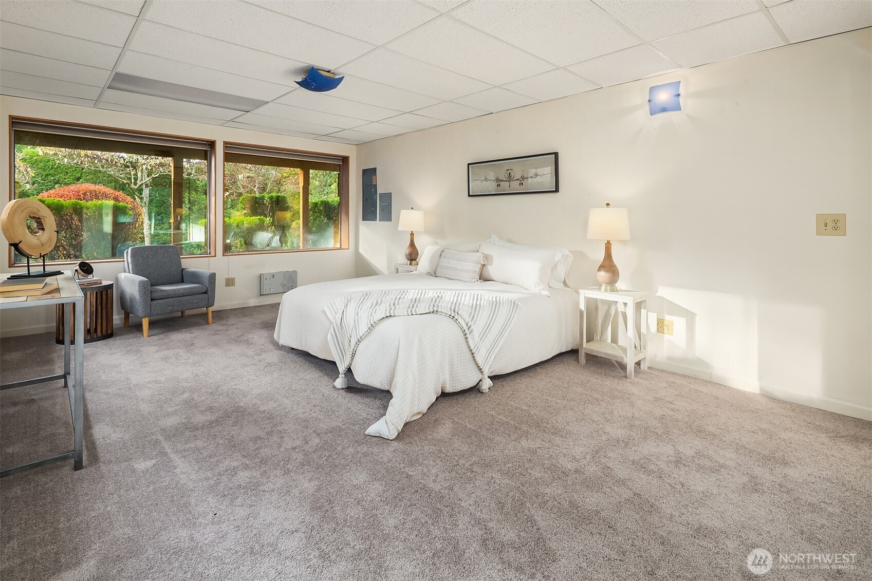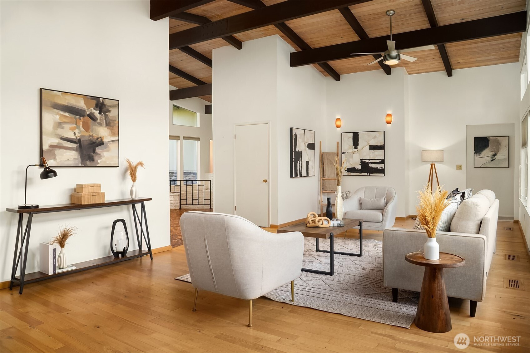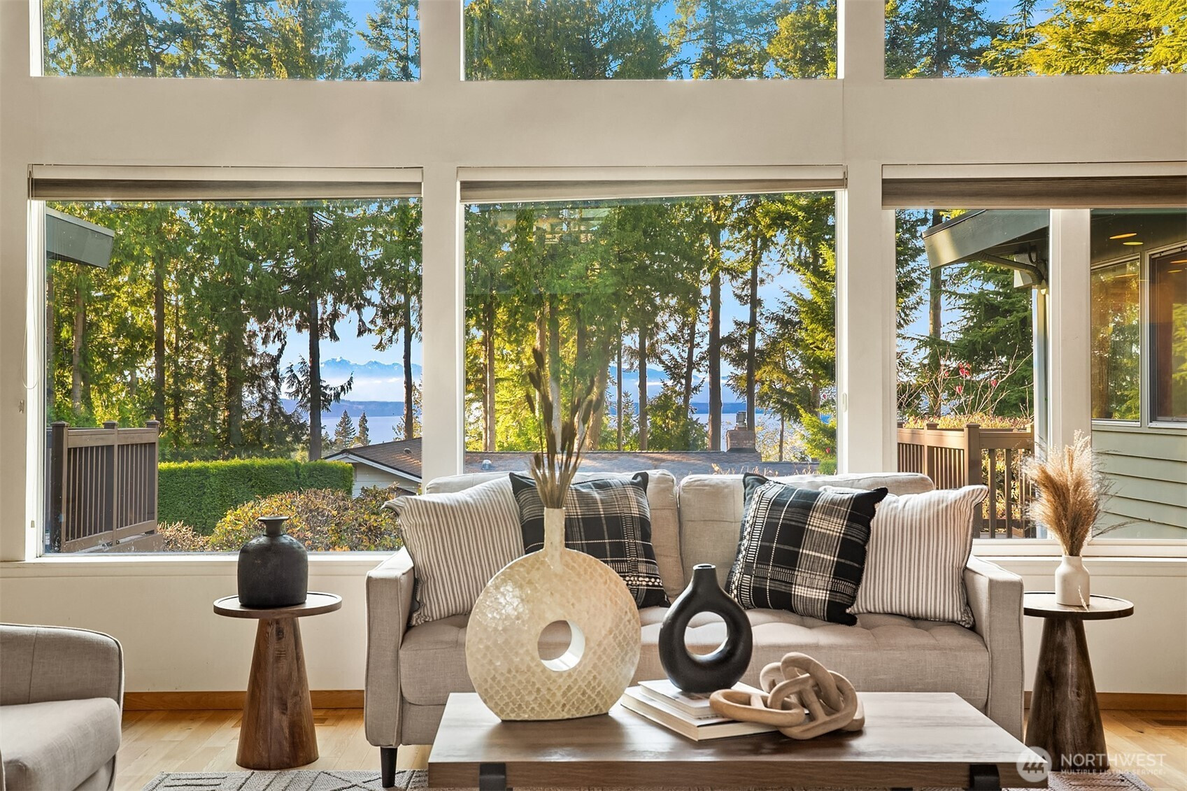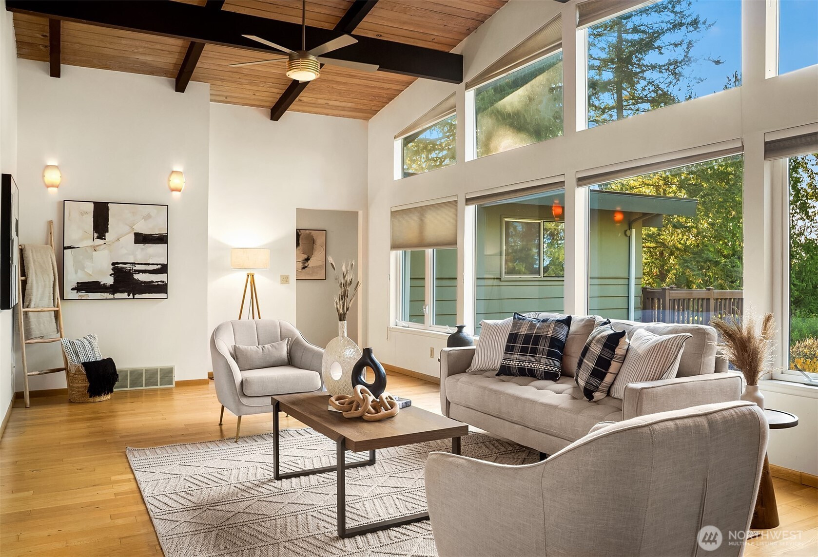 (650)533-3259Edmonds Mid-Century home w/ vaulted wood-lined ceilings & exposed beams. Large walls of glass & clerestory windows flood interiors w/ light & capture peekaboo Puget Sound & Olympic Mt views. Stone-clad wood-burning fireplaces & hardwoods throughout main add character & warmth. Chef’s kitchen w/ oversized island, gas cooktop, sleek metal range hood, extensive cabinetry & huge fridge. Seamless outdoor flow to view deck. Primary Suite features malm-style cone fireplace, built-ins, private deck & 5-piece bath. Circular sunken staircase framed by wrought-iron railings adds architectural drama & leads to huge lower-level rec room w/ wraparound fireplace. Laundry w/ sink, counter & storage. 2-car garage. Unmistakable groovy mid-century character.
